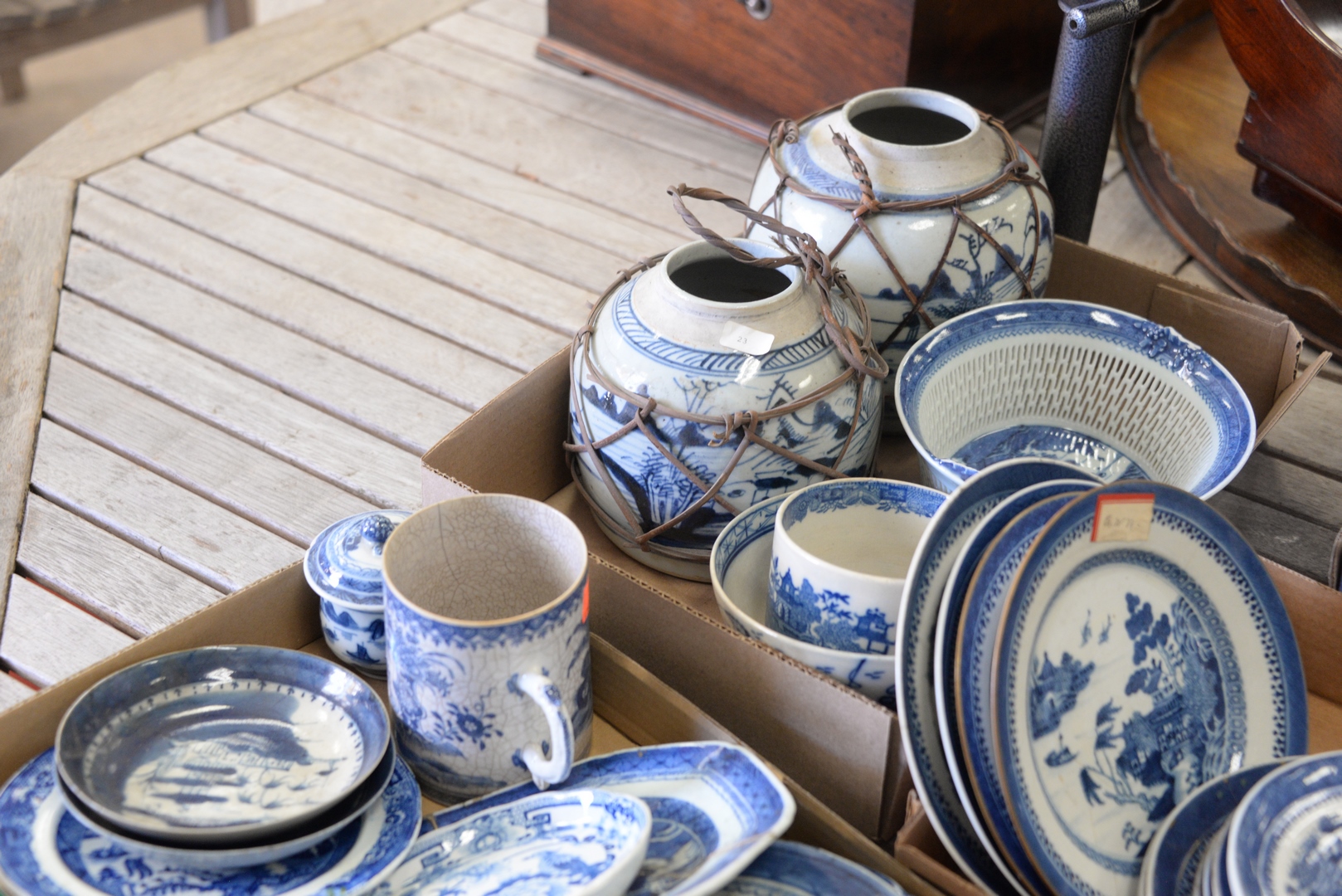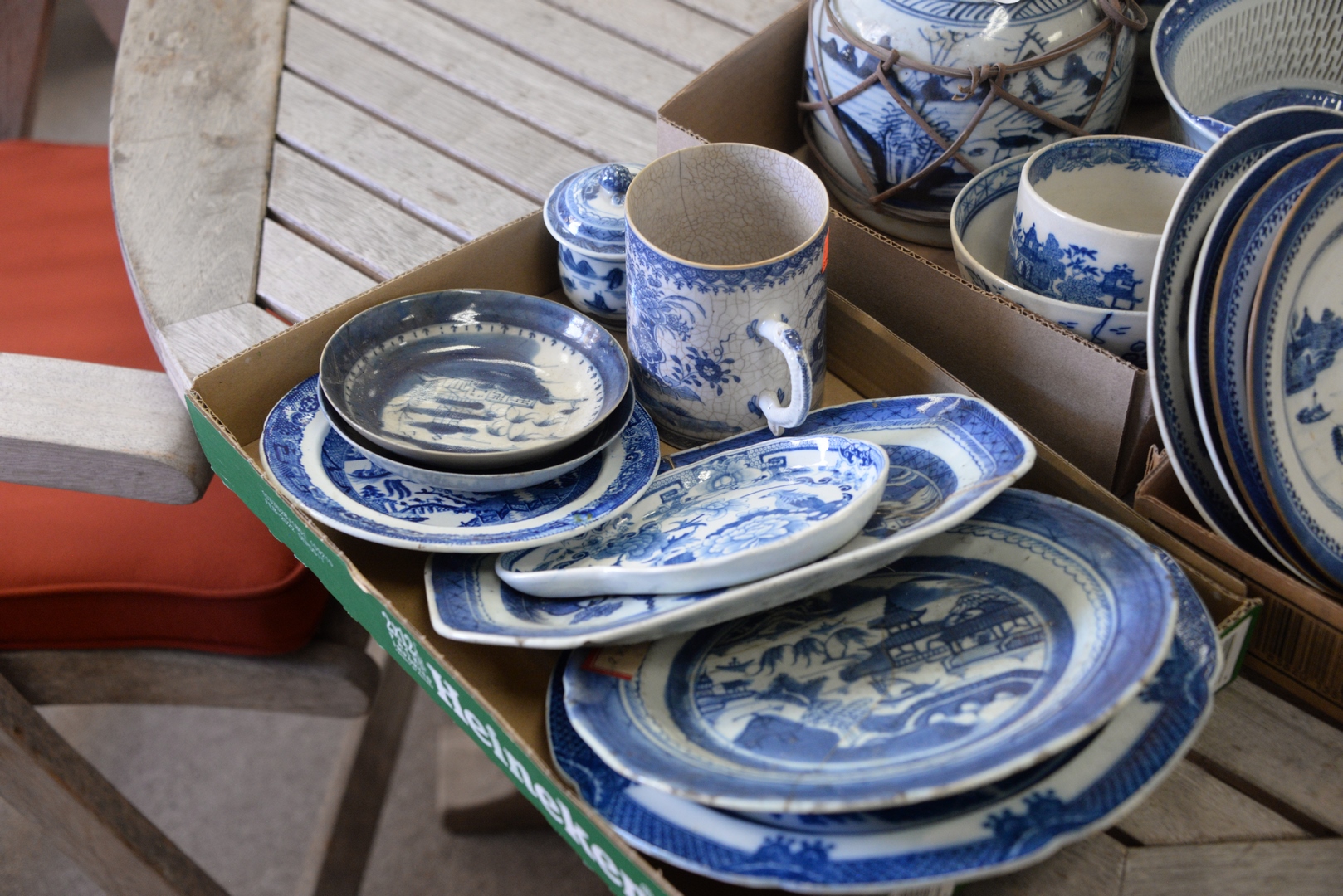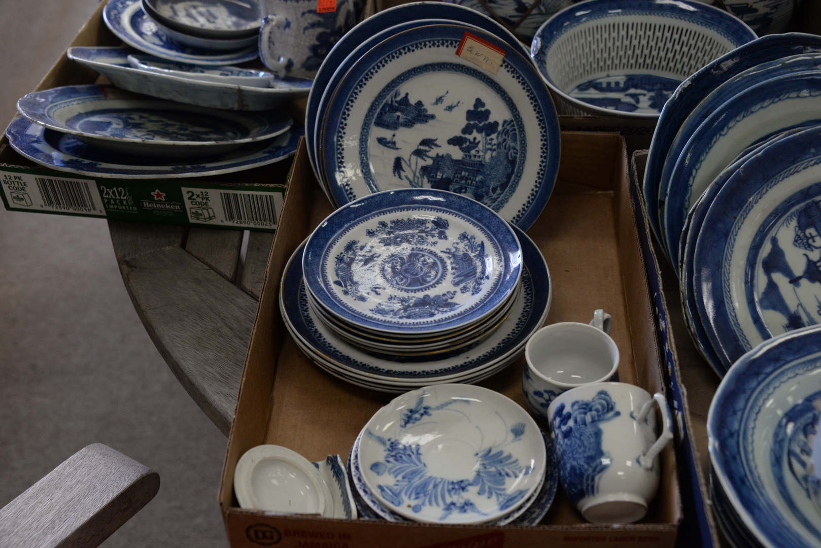 Lot 213: Six Tray Lots of Canton and Fitzhugh Blue and White Export, (some lot damage). Provenance: From a Newport, Rhode Island historic home, in the same family since 1761.