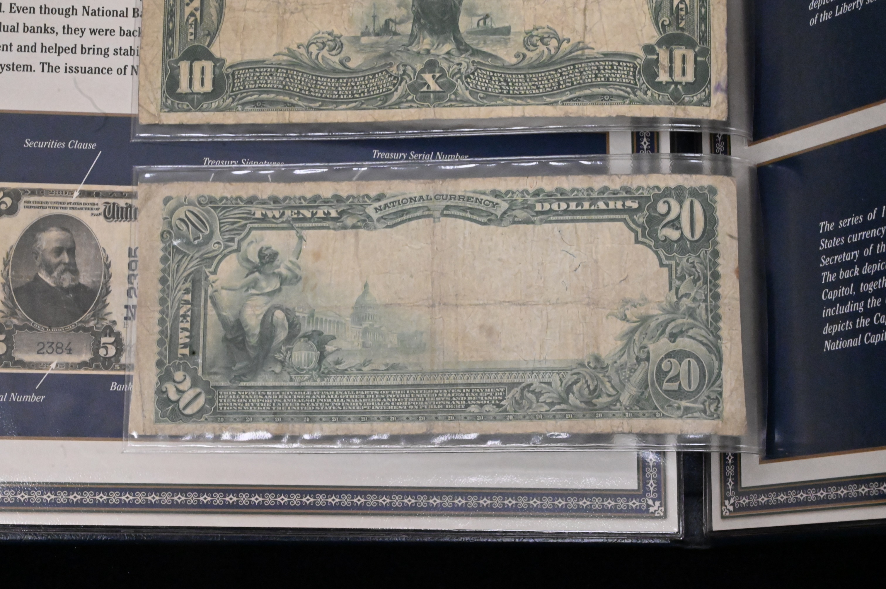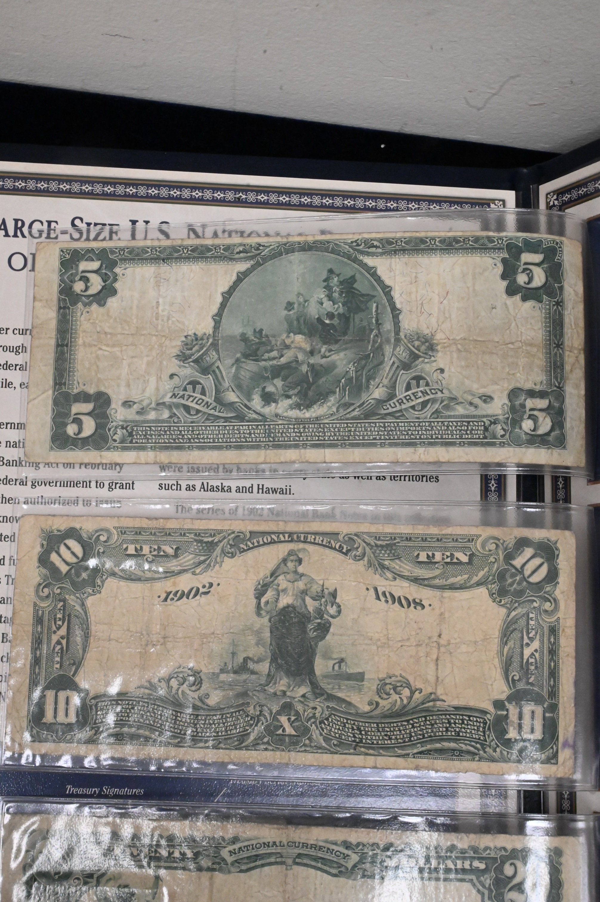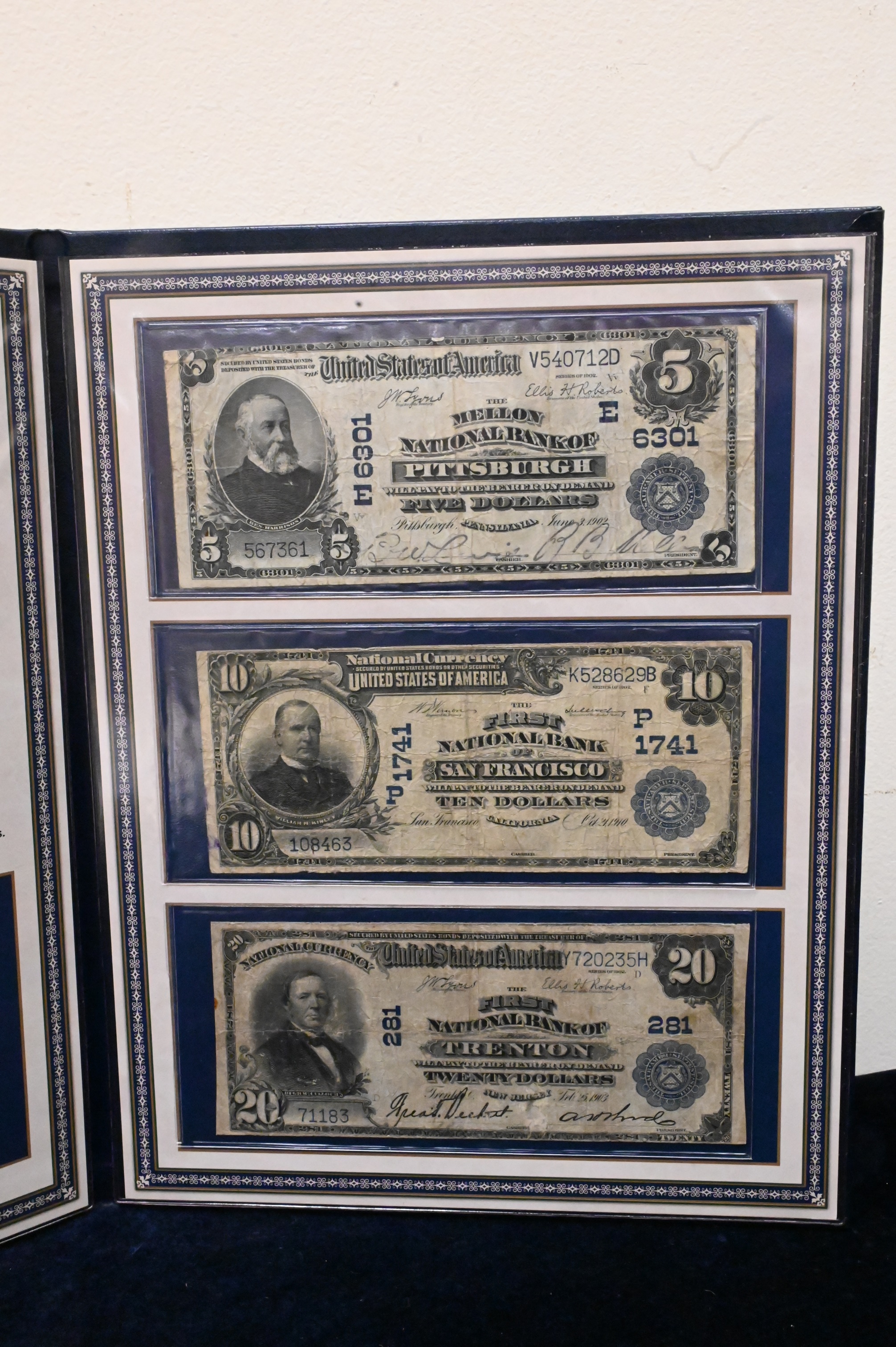 Three National Bank Notes, $5 Pittsburgh second issue #590, $10 1902 #627 third issue San Francisco, $20 1902 #642 third issue Trenton New Jersey