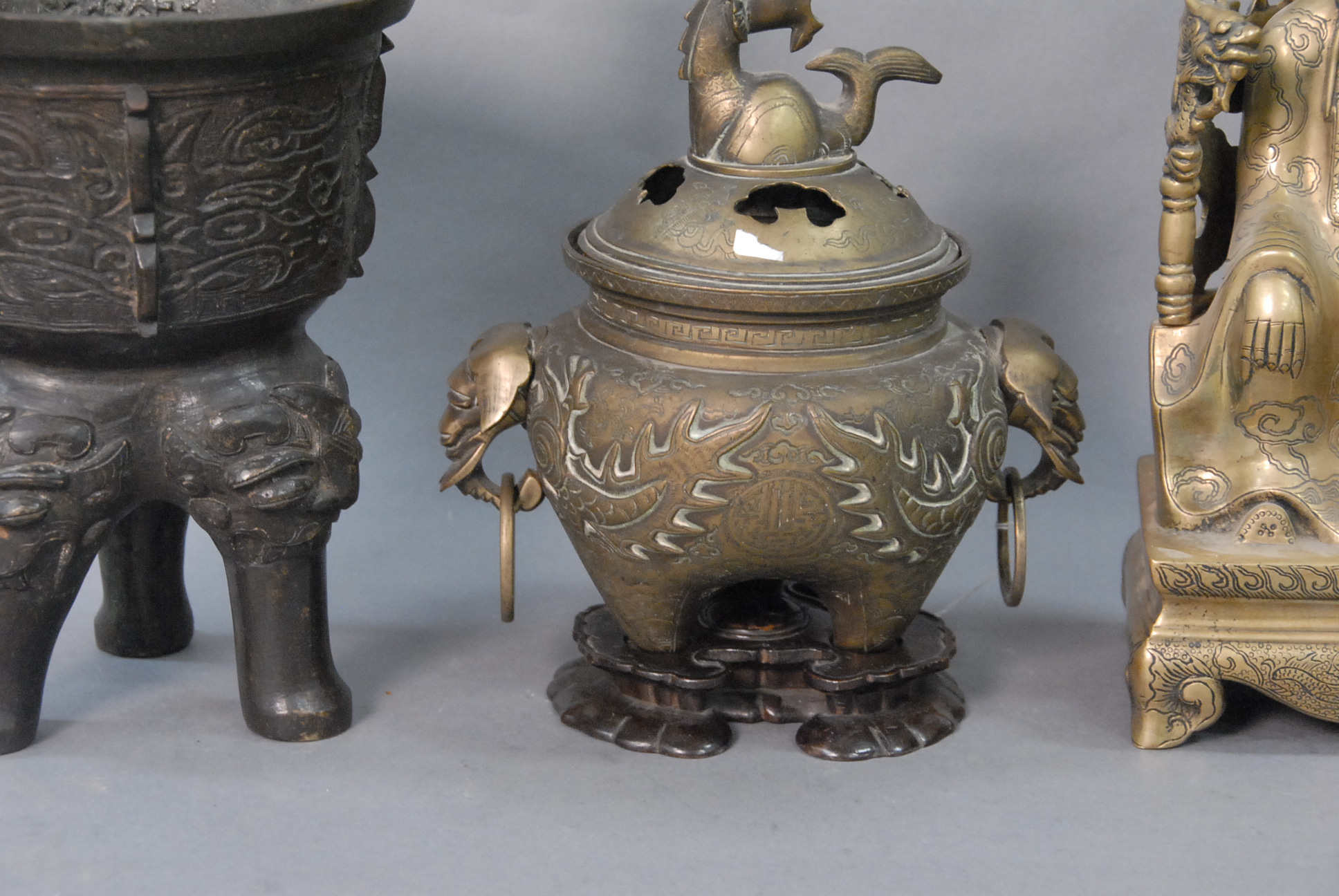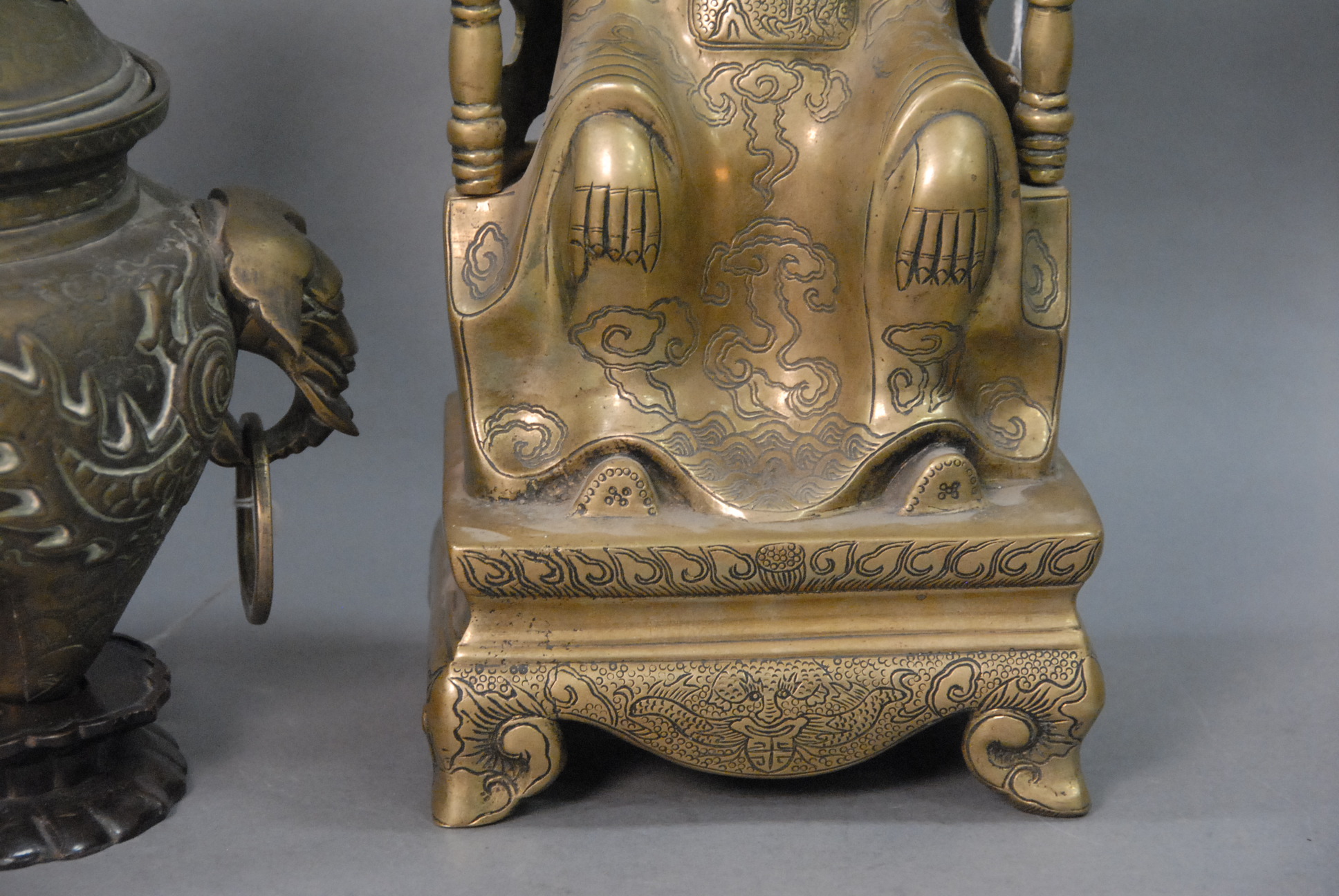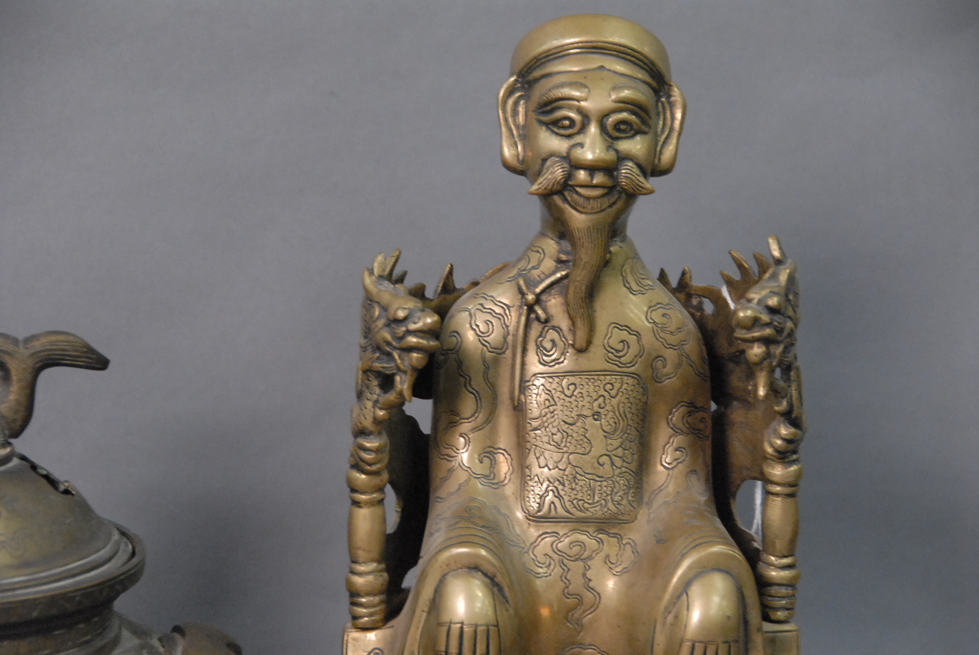 Three piece Asian lot to include a bronze vase, a bronze tri-pod censer, and a brass figure of an Emperor on a dragon throne.