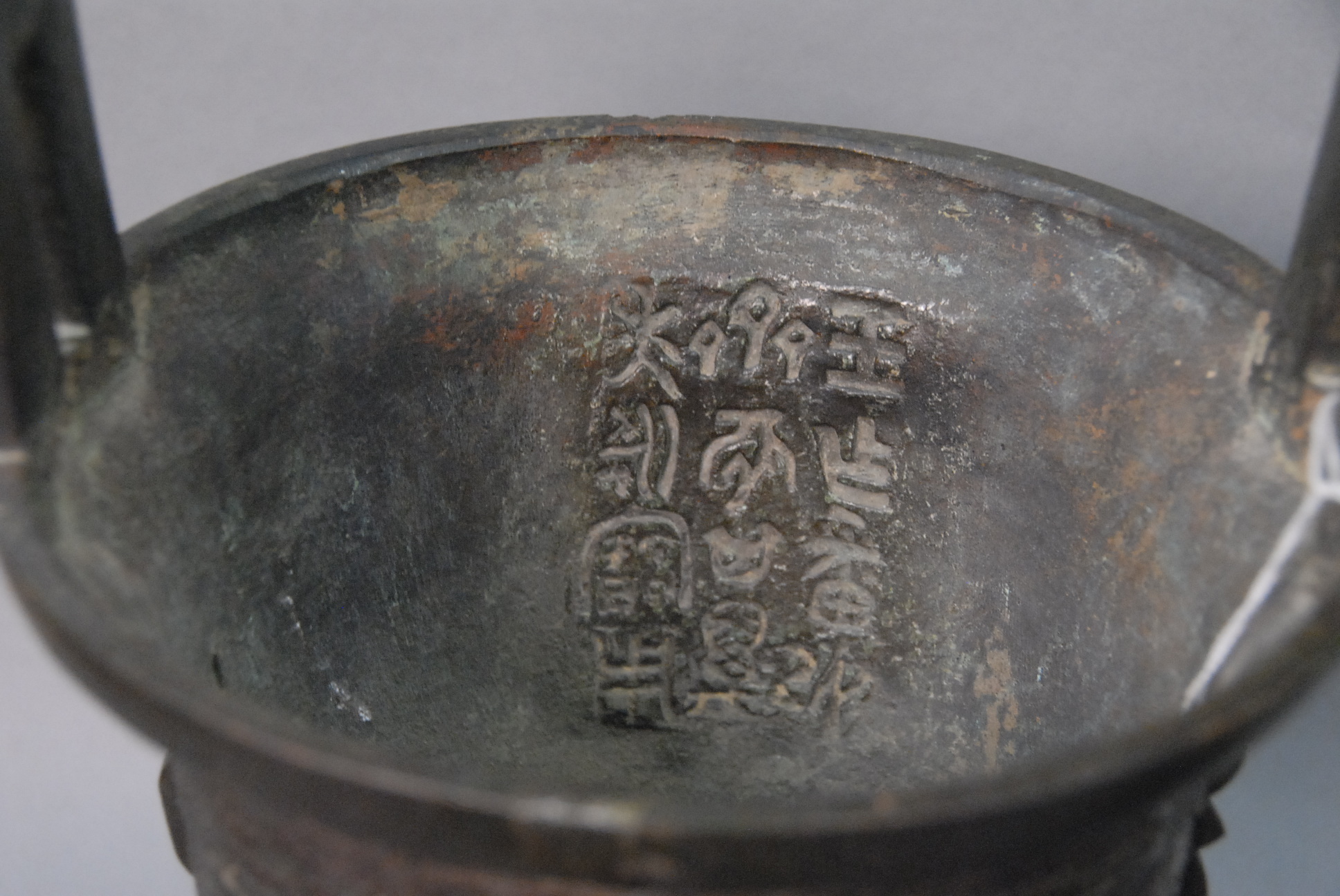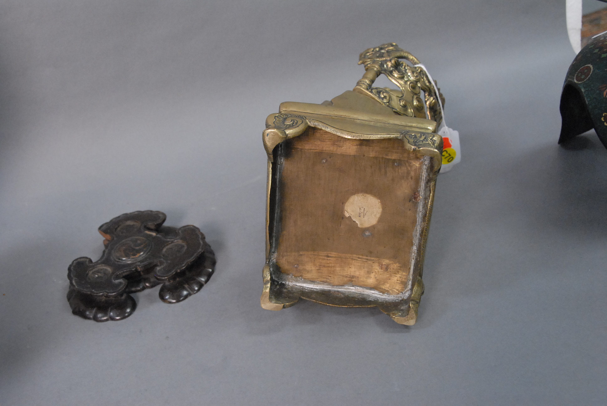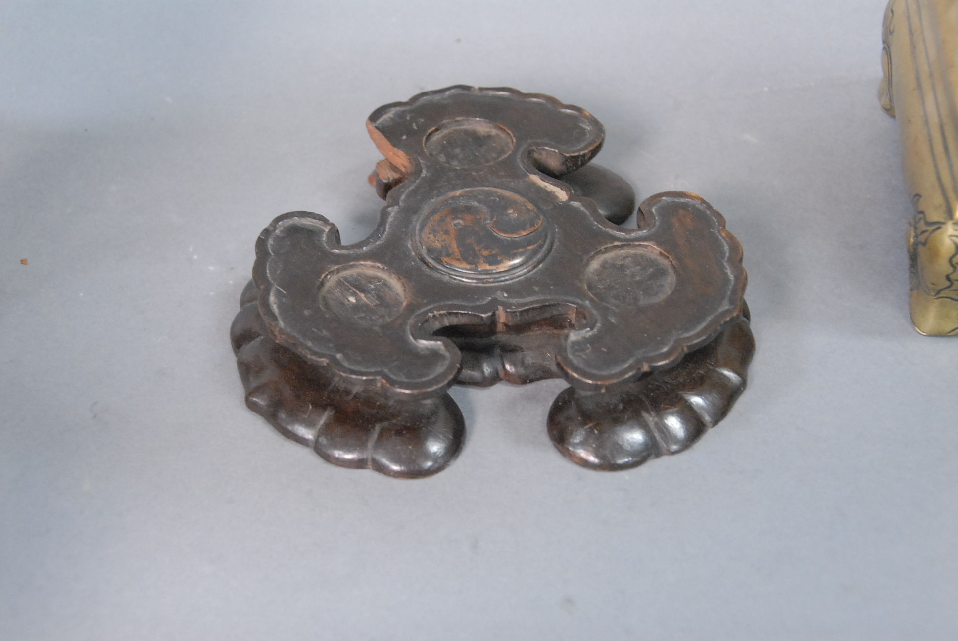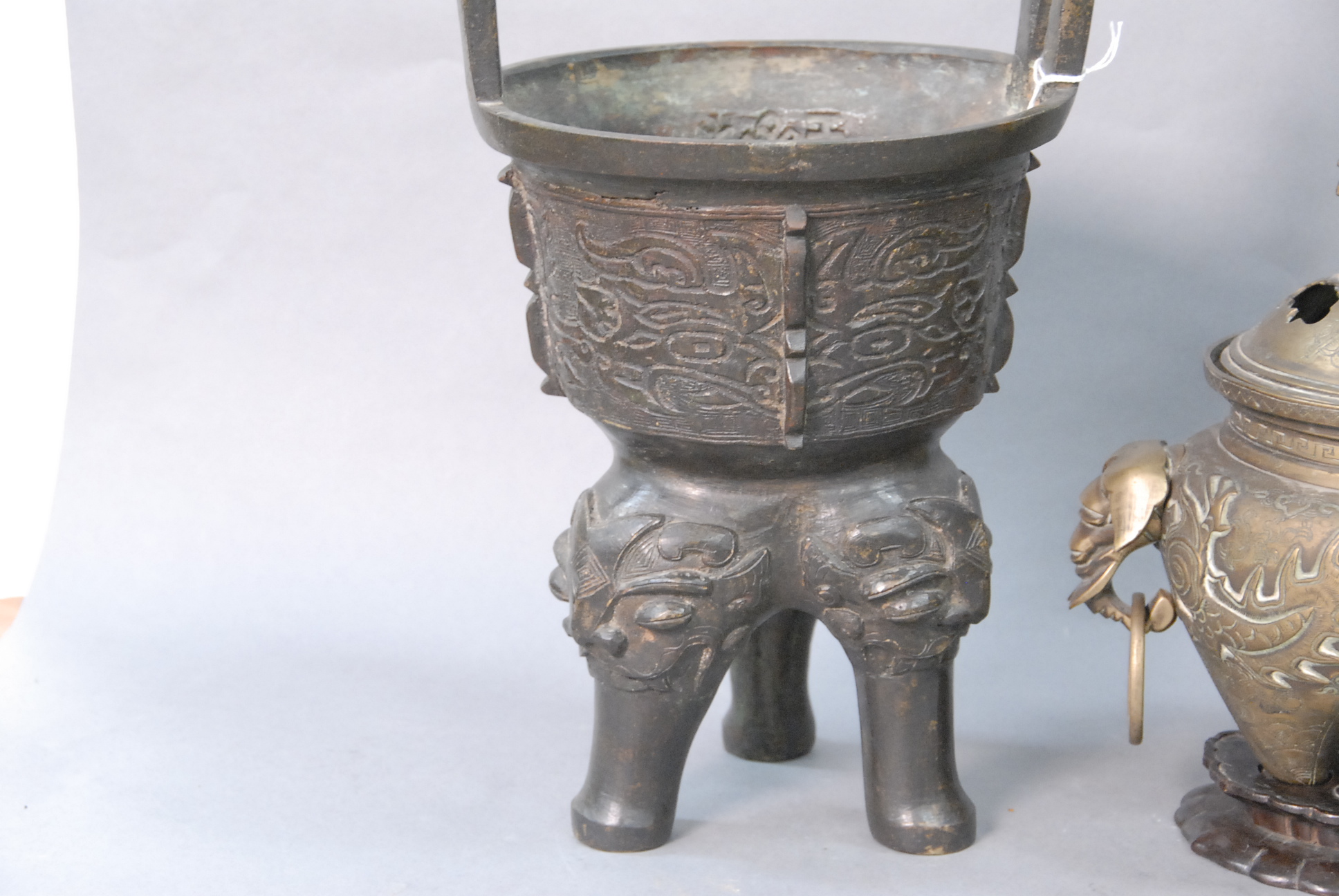 Three piece Asian lot to include a bronze vase, a bronze tri-pod censer, and a brass figure of an Emperor on a dragon throne.