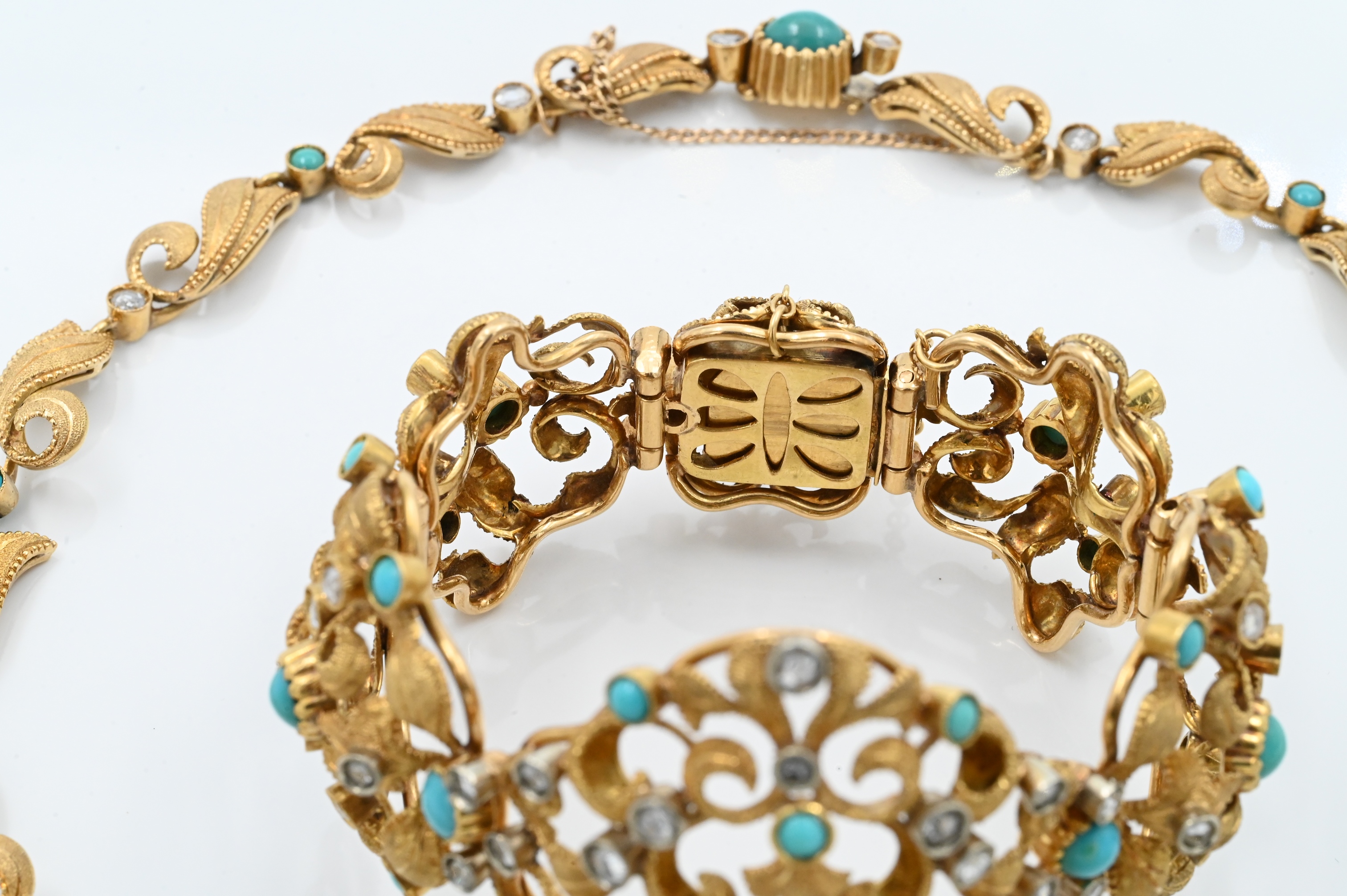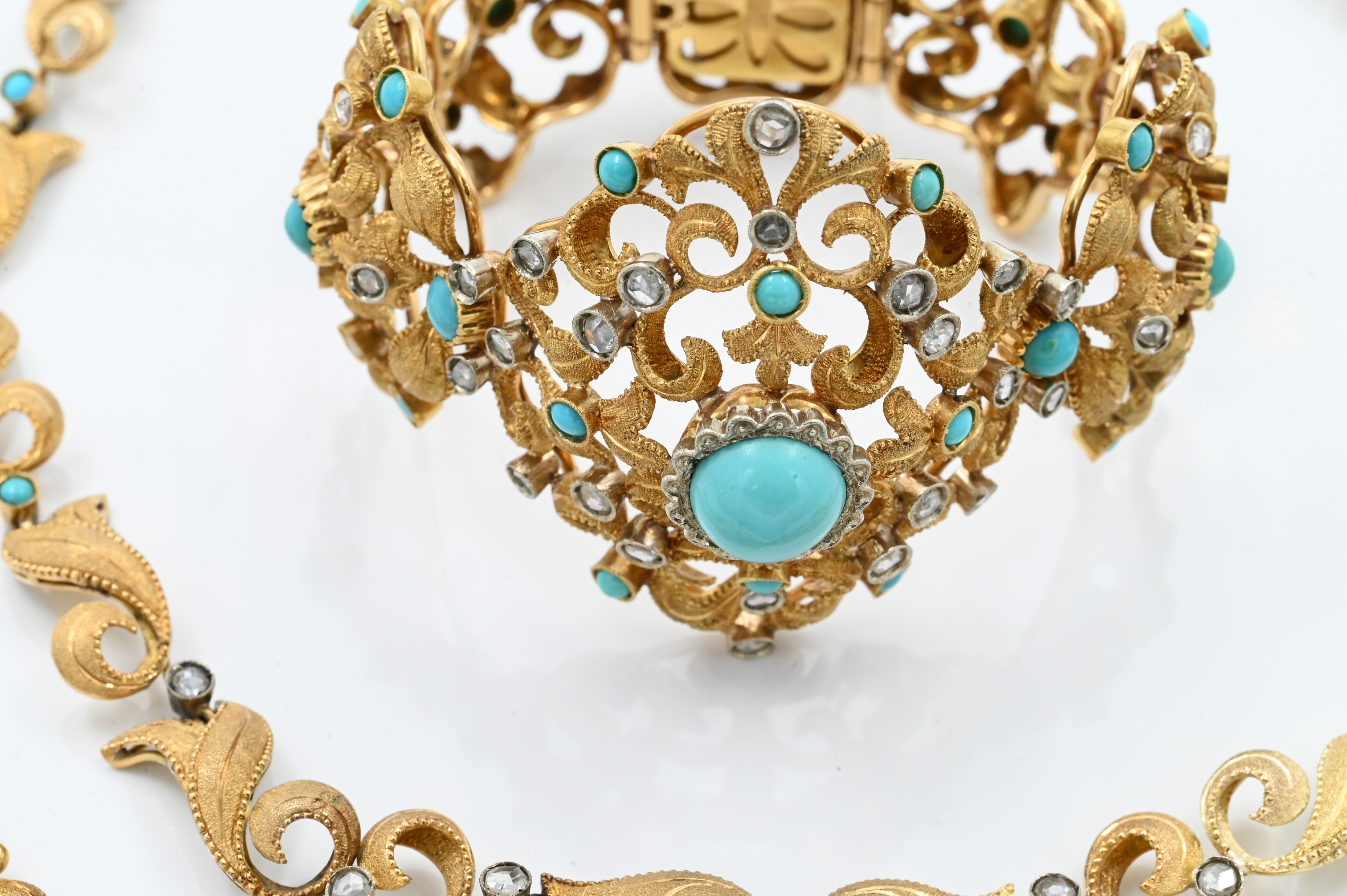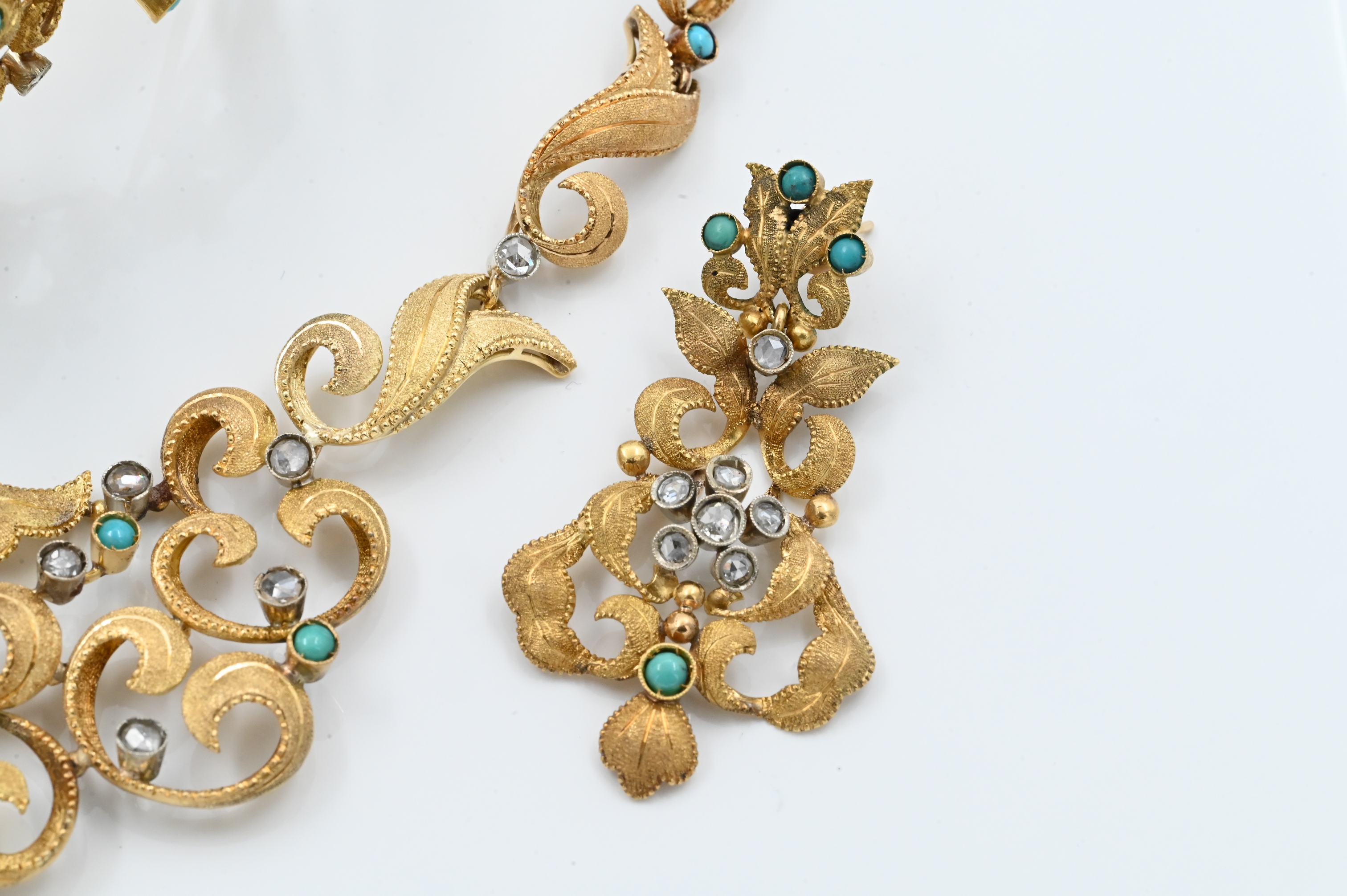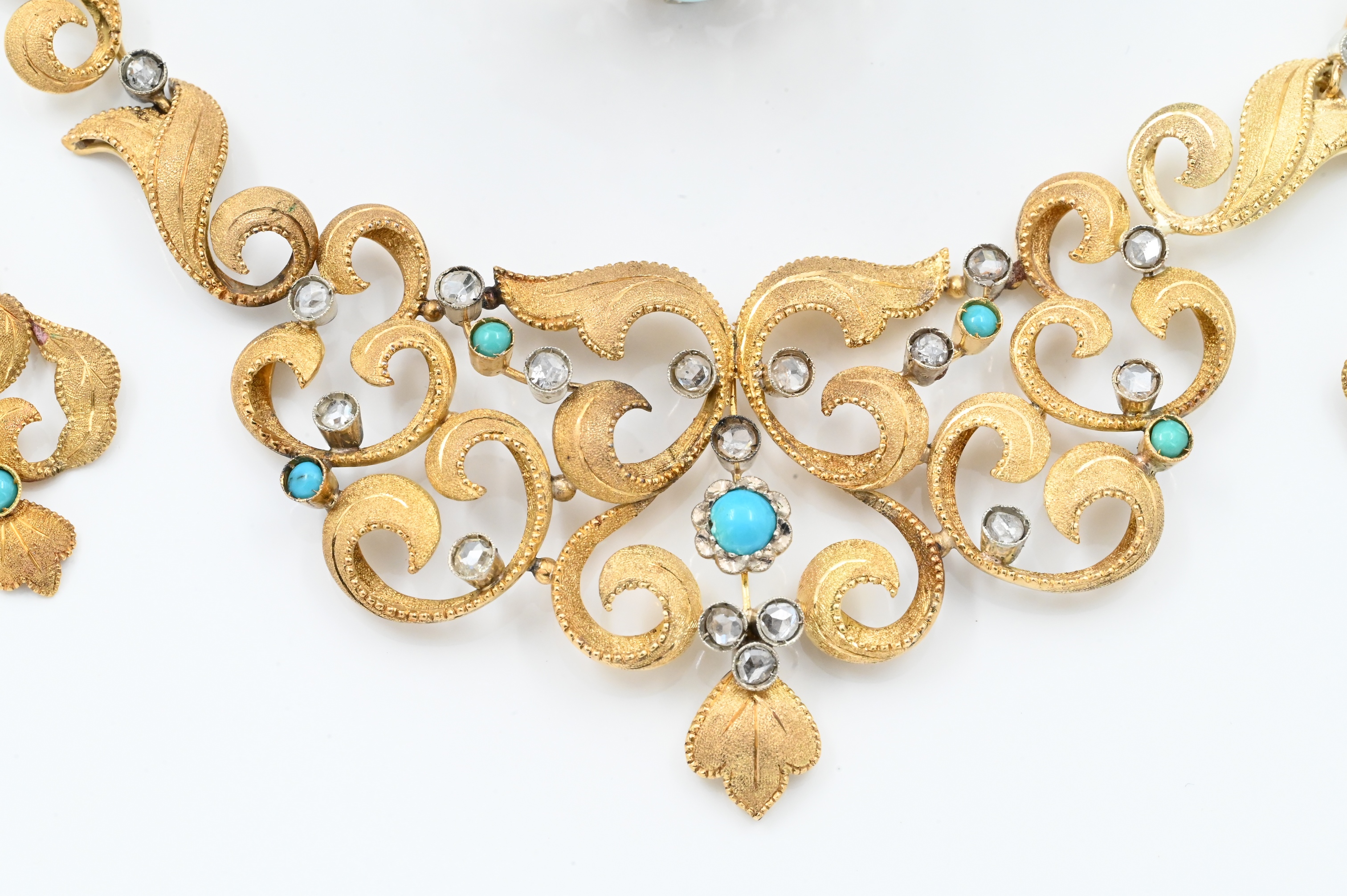 to include necklace, bracelet, and pair of earrings, each set with cabochon turquoise and silver overlay, rose cut diamonds set in a naturalistic foliage backdrop