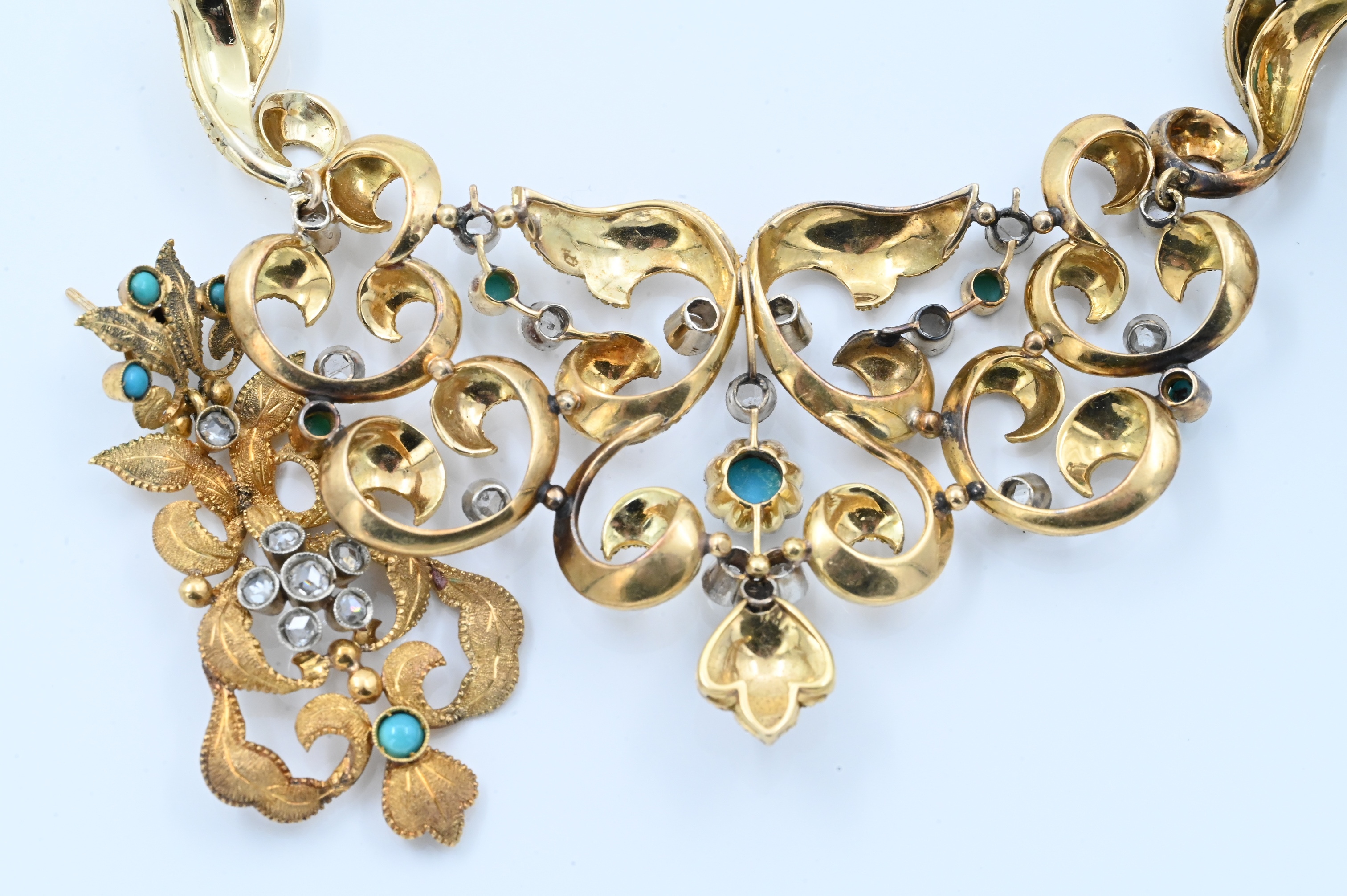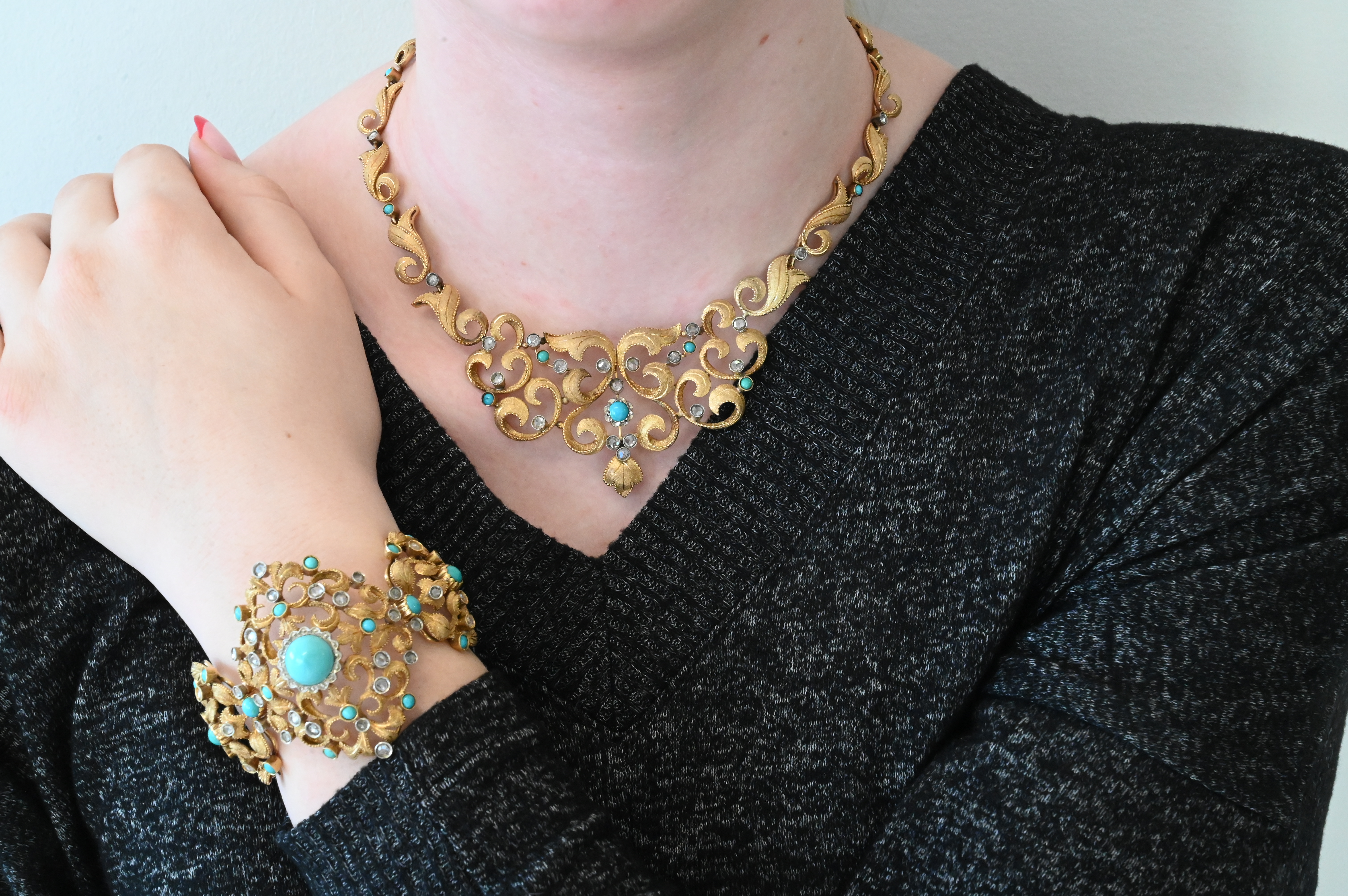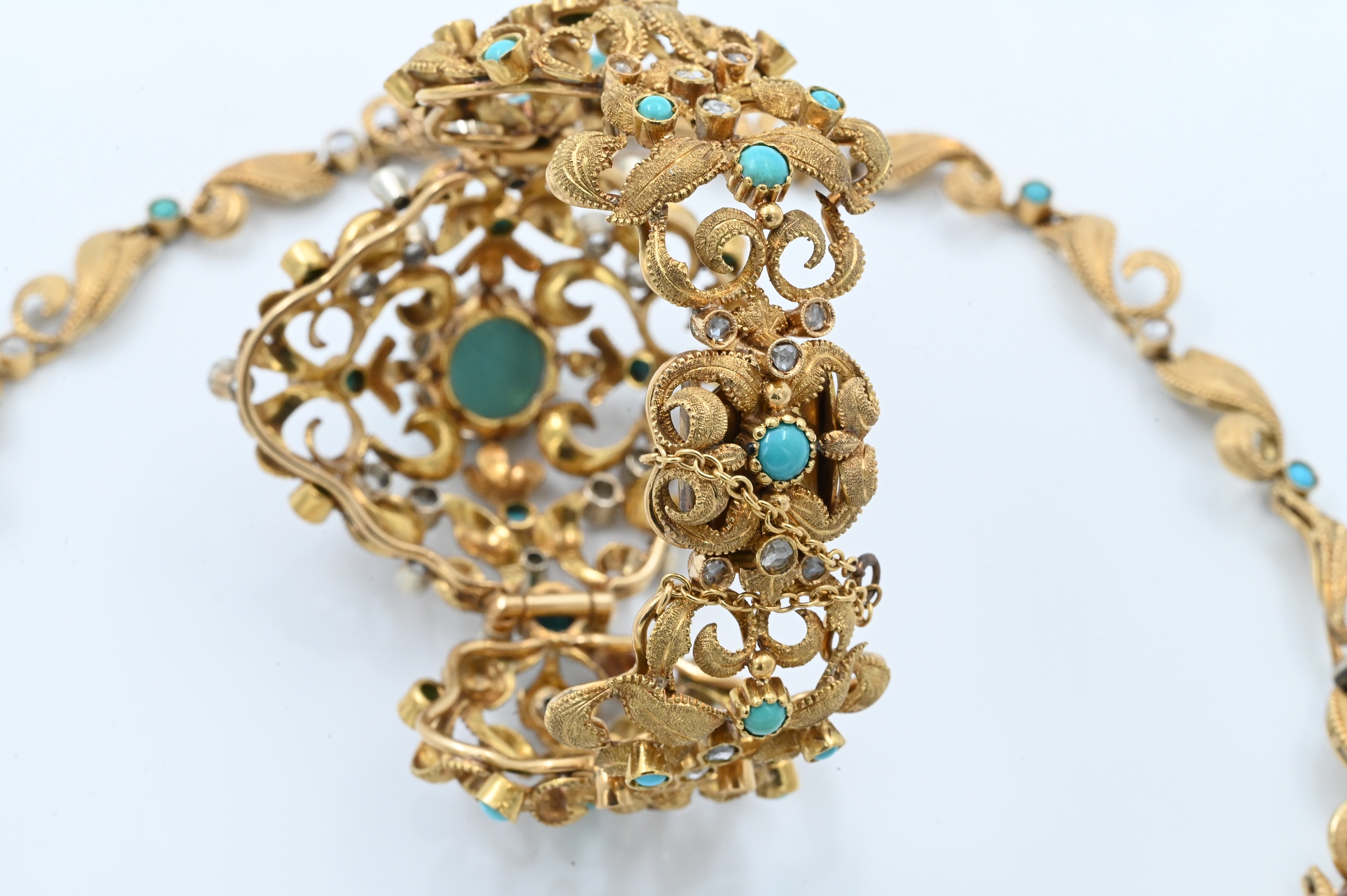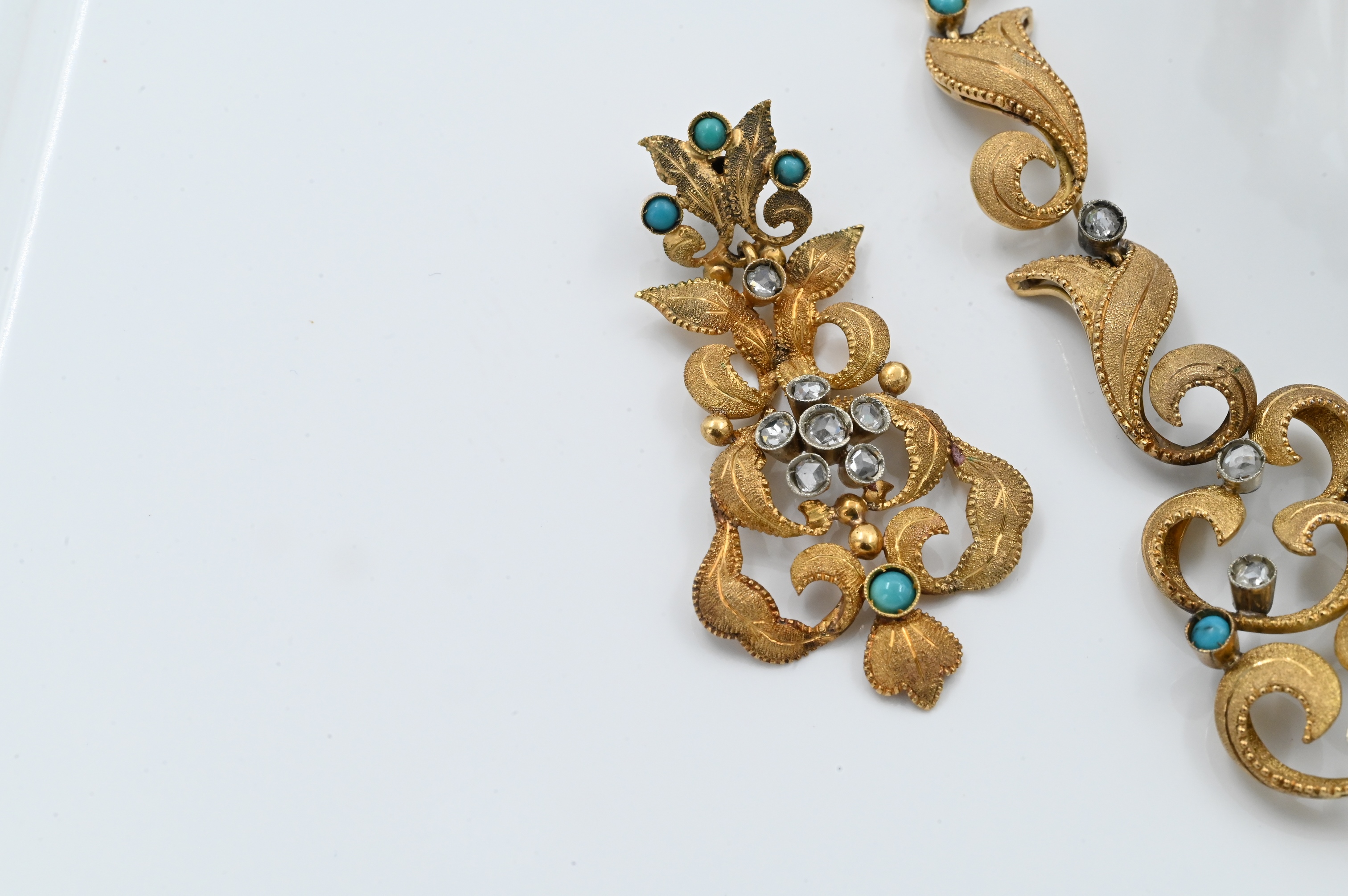 to include necklace, bracelet, and pair of earrings, each set with cabochon turquoise and silver overlay, rose cut diamonds set in a naturalistic foliage backdrop