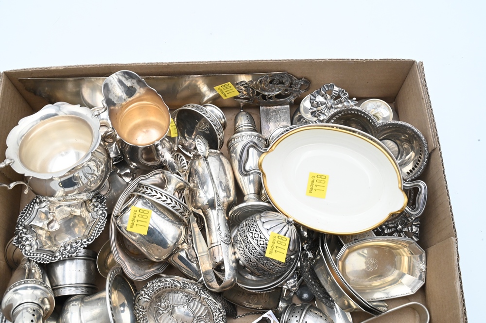 Lot 213: Tray Lot of Sterling Silver, to include salt and pepper shakers, napkin rings, tea balls, salts, ruler, along with assorted flatware…