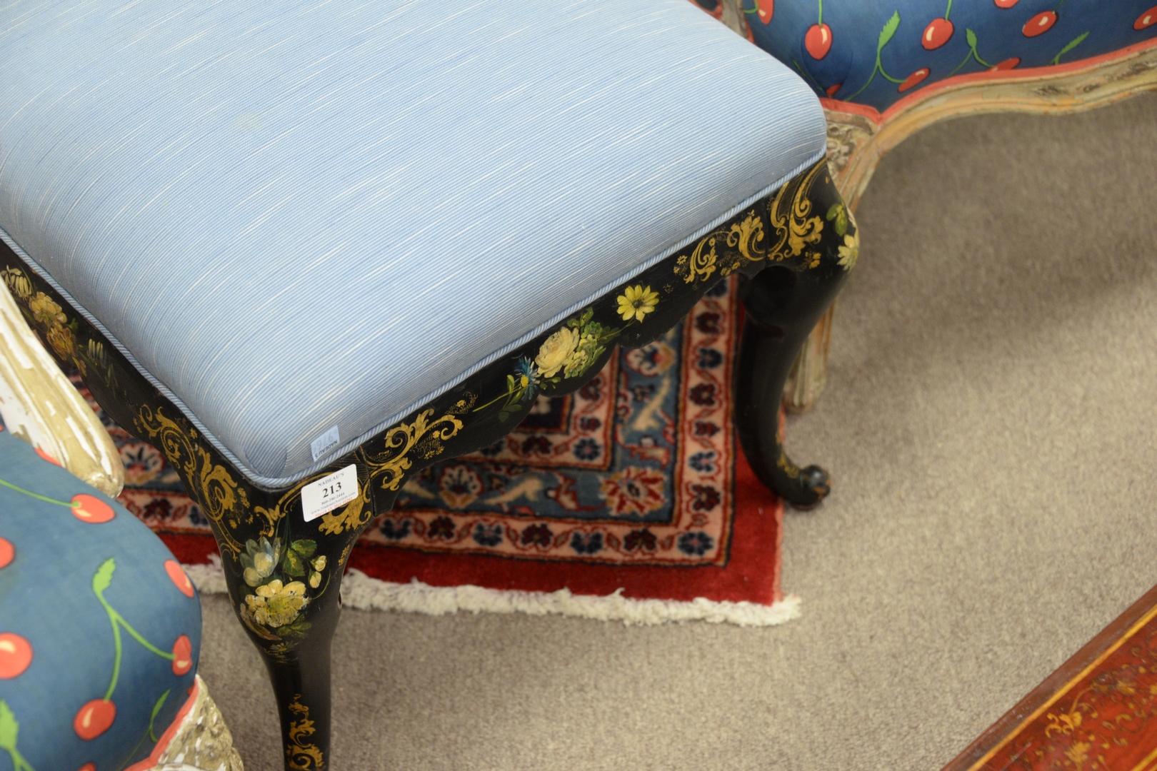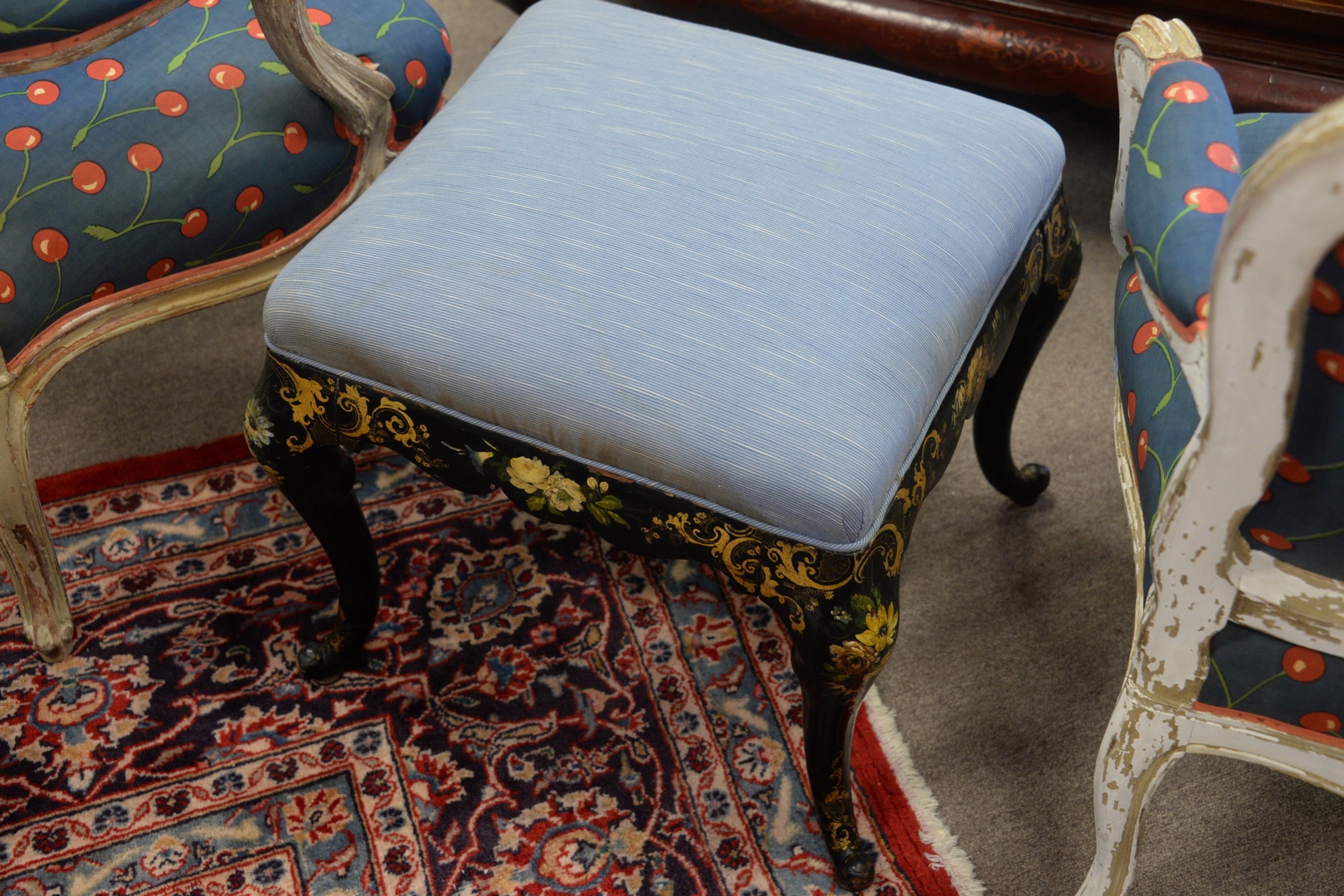 Lot 213: Two Piece Lot to include Louis XV Style Tabouret, having custom blue upholstered top, over ebony, gilt, and paint decorated base and…
