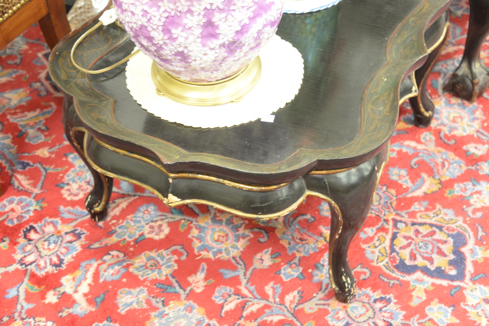 Two Piece Lot to include Louis XV Style Tabouret, having custom blue upholstered top, over ebony, gilt, and paint decorated base and cabriole legs, height 18 inches, top 17 1/2 x 17 1/2 along with coffee table.