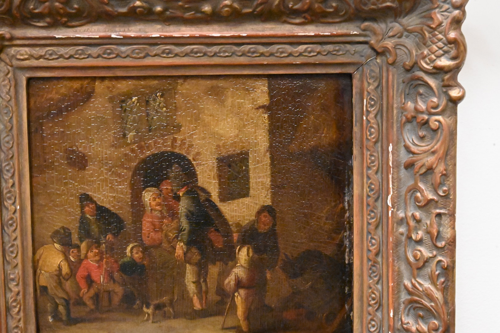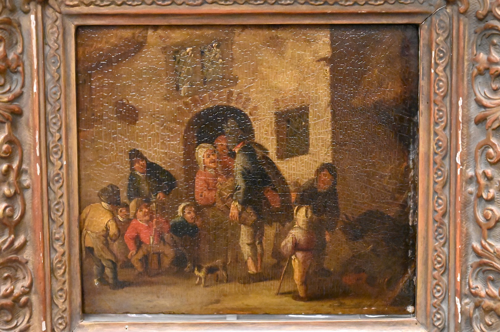 Attributed to Isaac Van Ostade (1621 – 1649), oil on oak panel, courtyard, unsigned, oil paper label on back, 7″ x 8 1/8″.