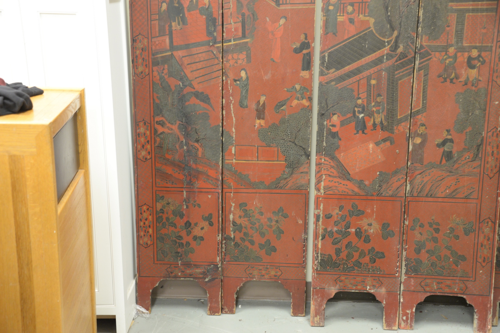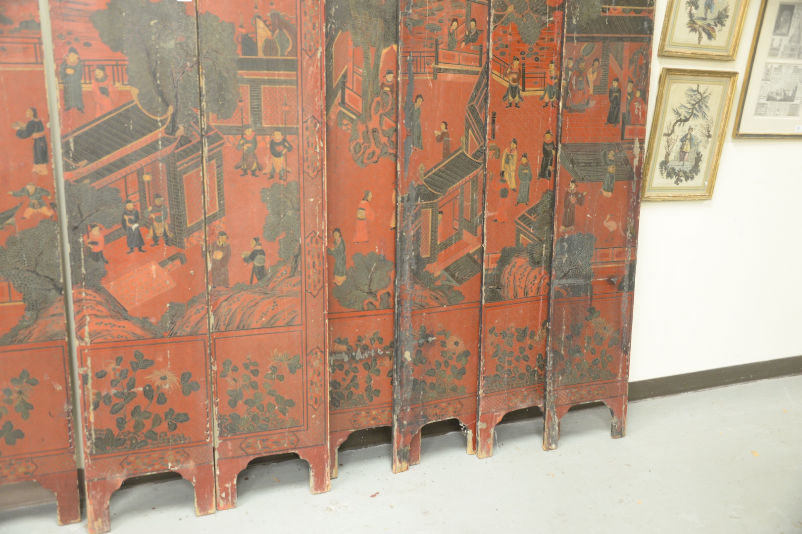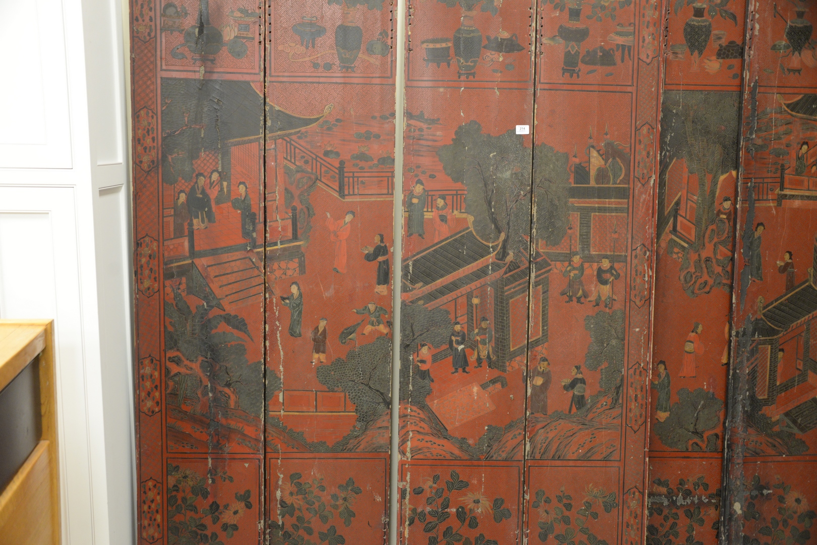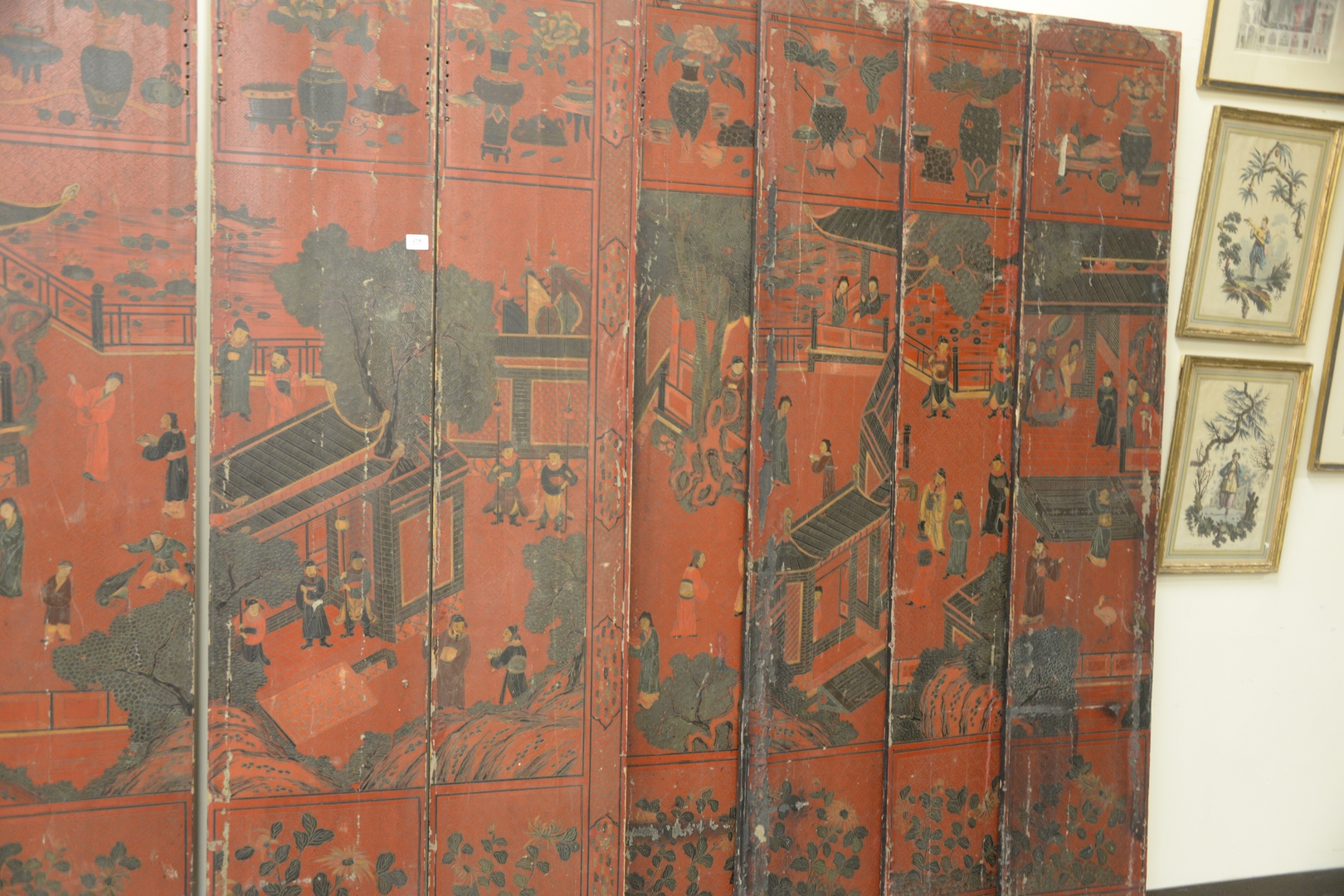 Lot 214: Chinese Eight Panel Screen, red lacquered with painted courtyard and figures, height 84 inches, total length 120 inches.