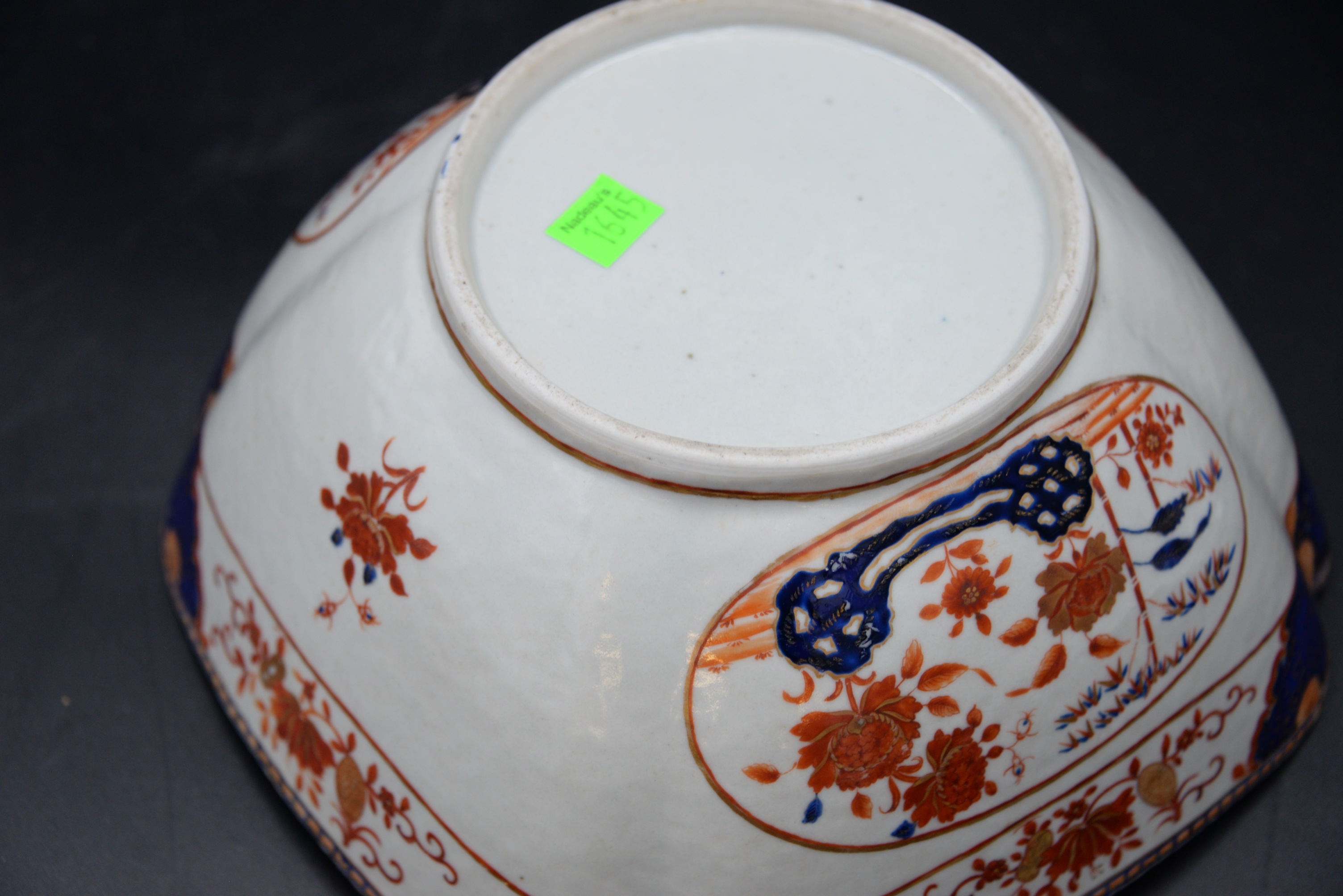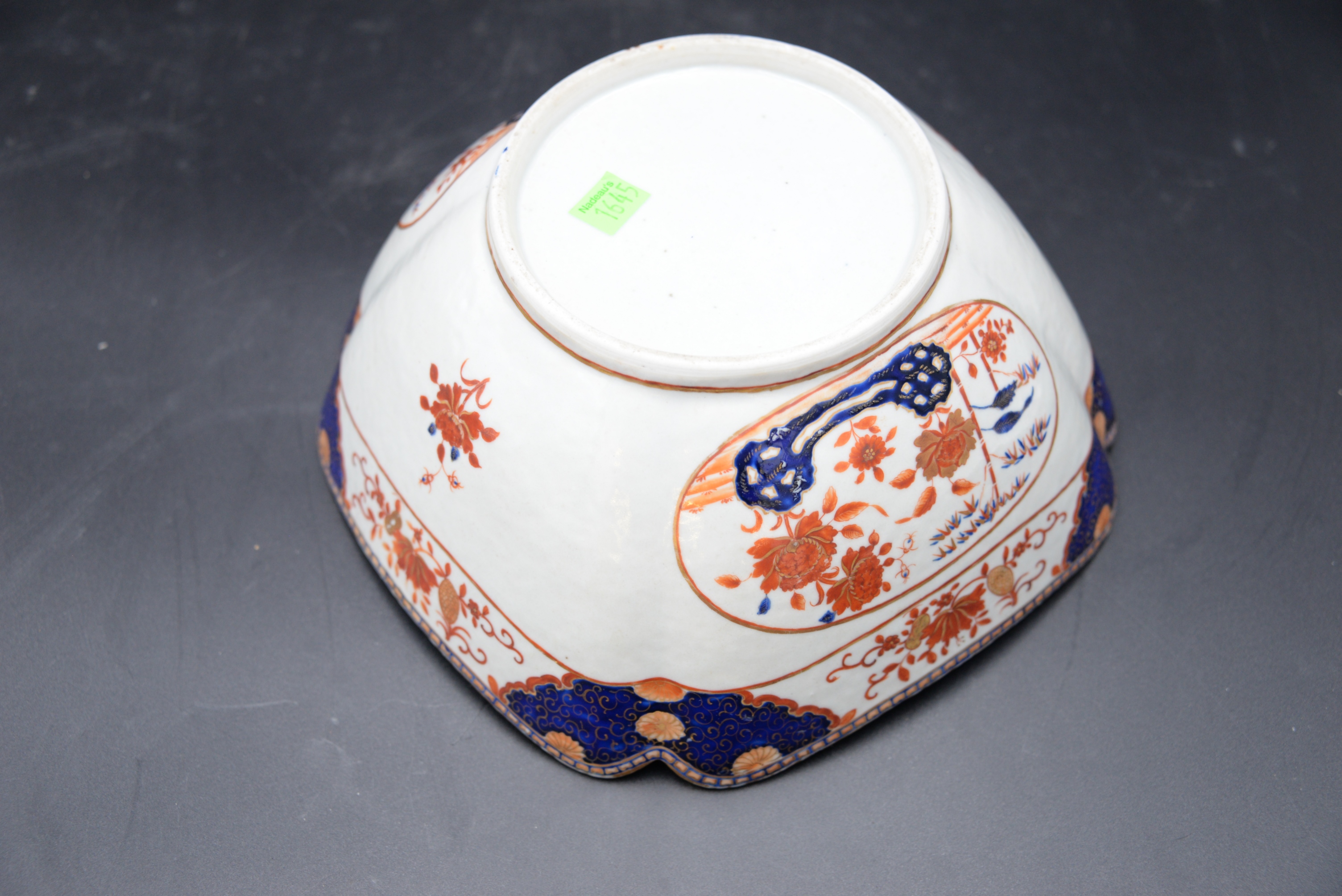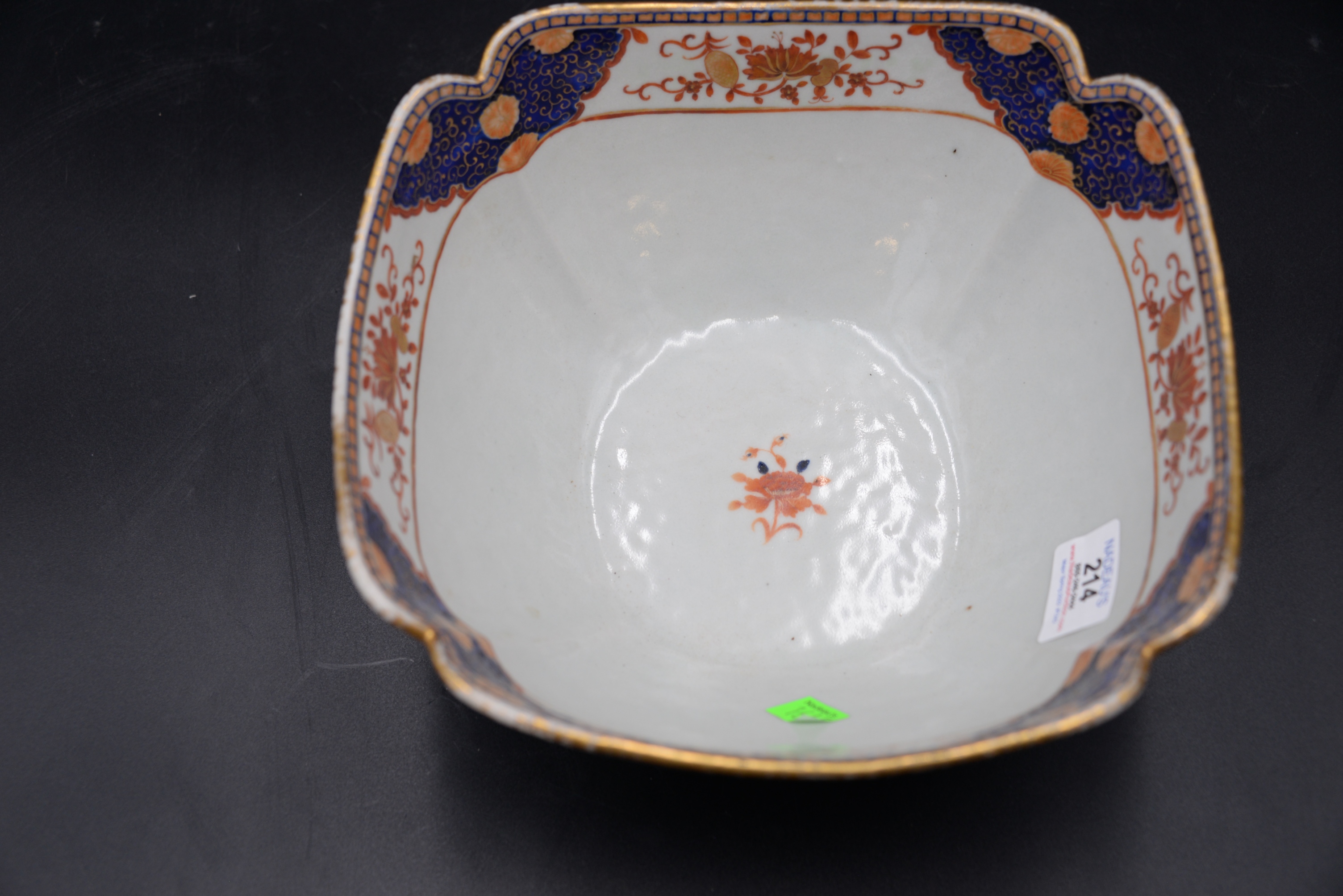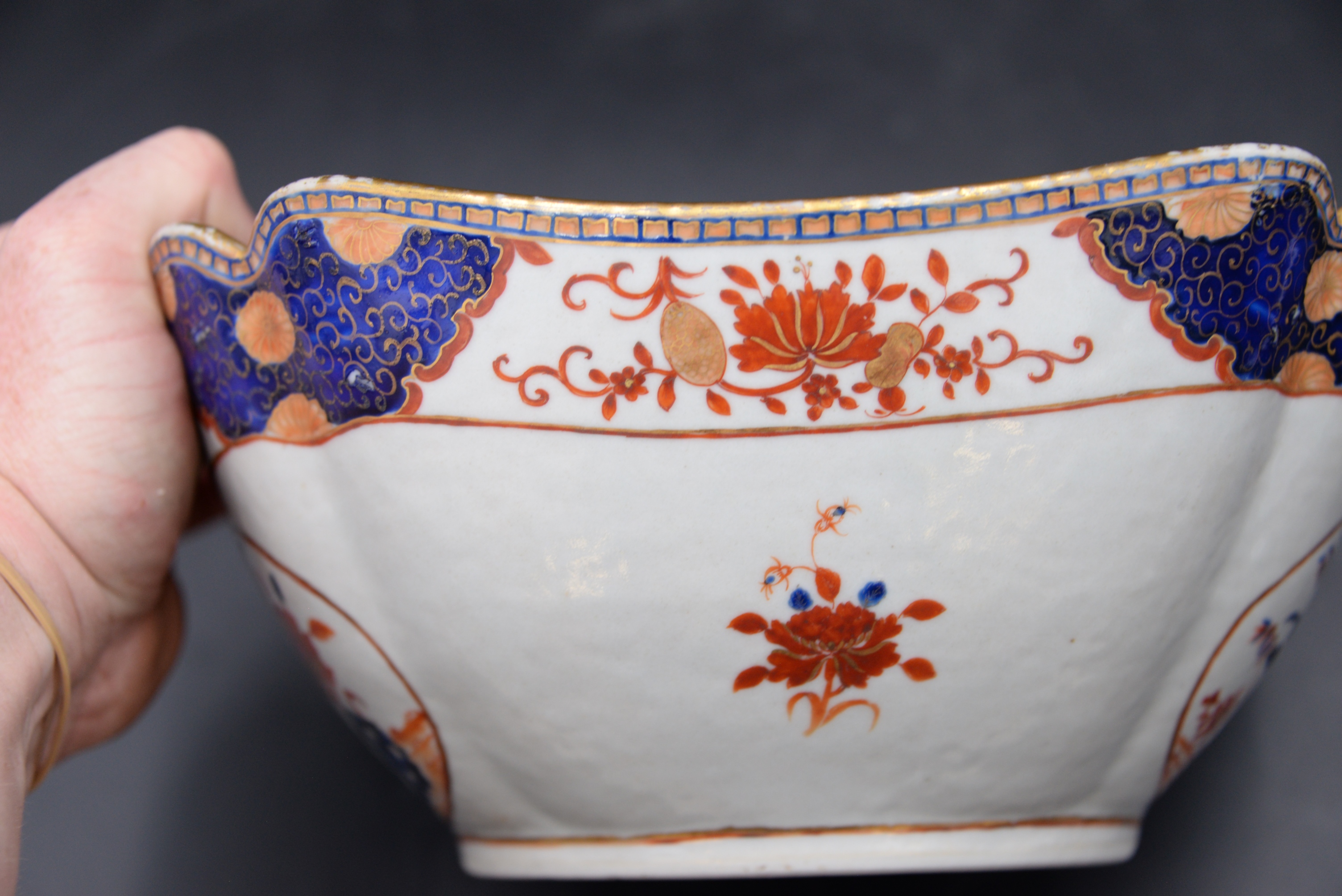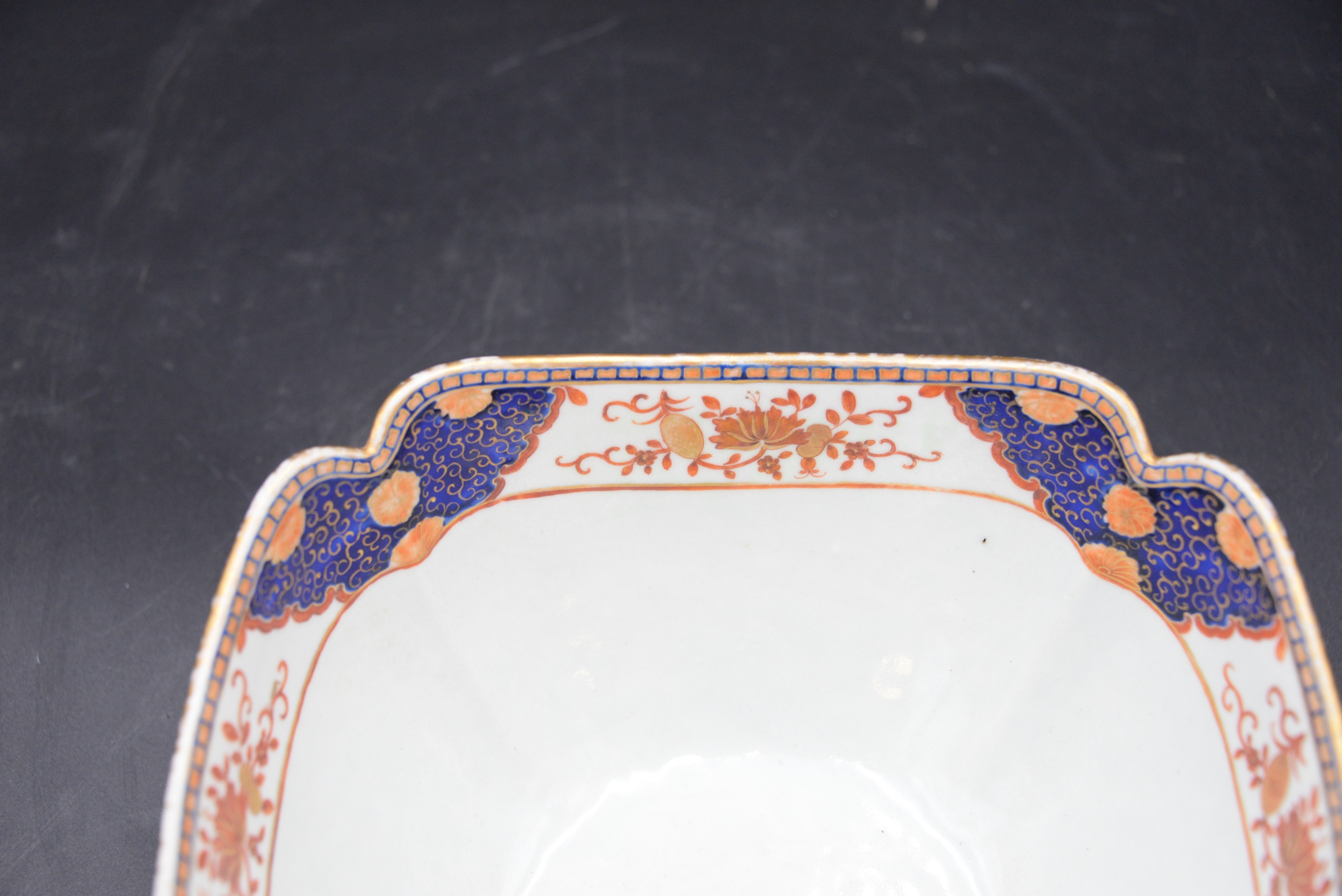 Chinese Export Porcelain Bowl, square form with iron red, blue and gold decoration, height 5 inches, width 10 inches.
