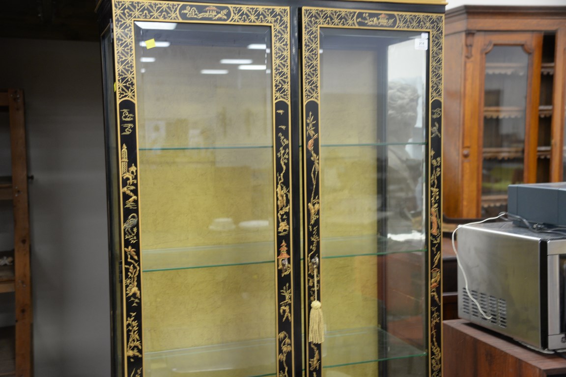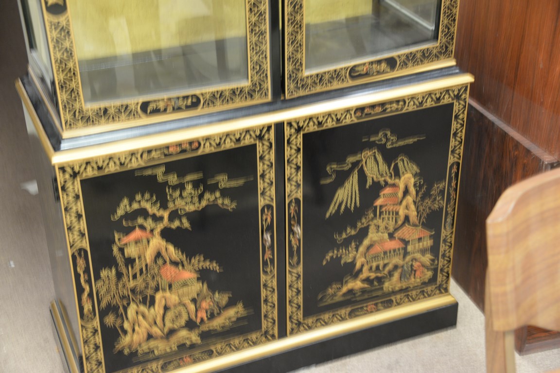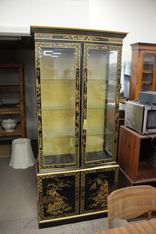 Chinoiserie decorated bevel glass cabinet. ht. 80 in. wd. 32 in. dp. 14 in.