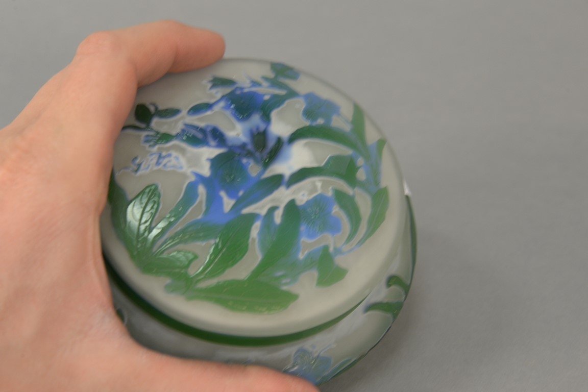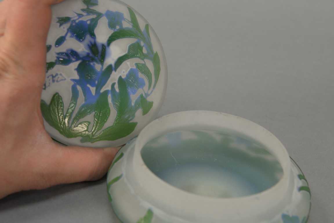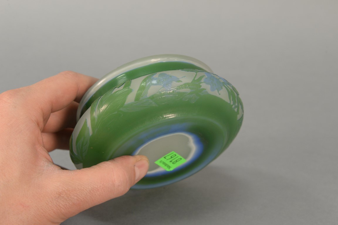 Lot 214: Emile Galle cameo box, circular form green and blue overlaid glass covered box. ht. 2 1/4in., dia. 5in.