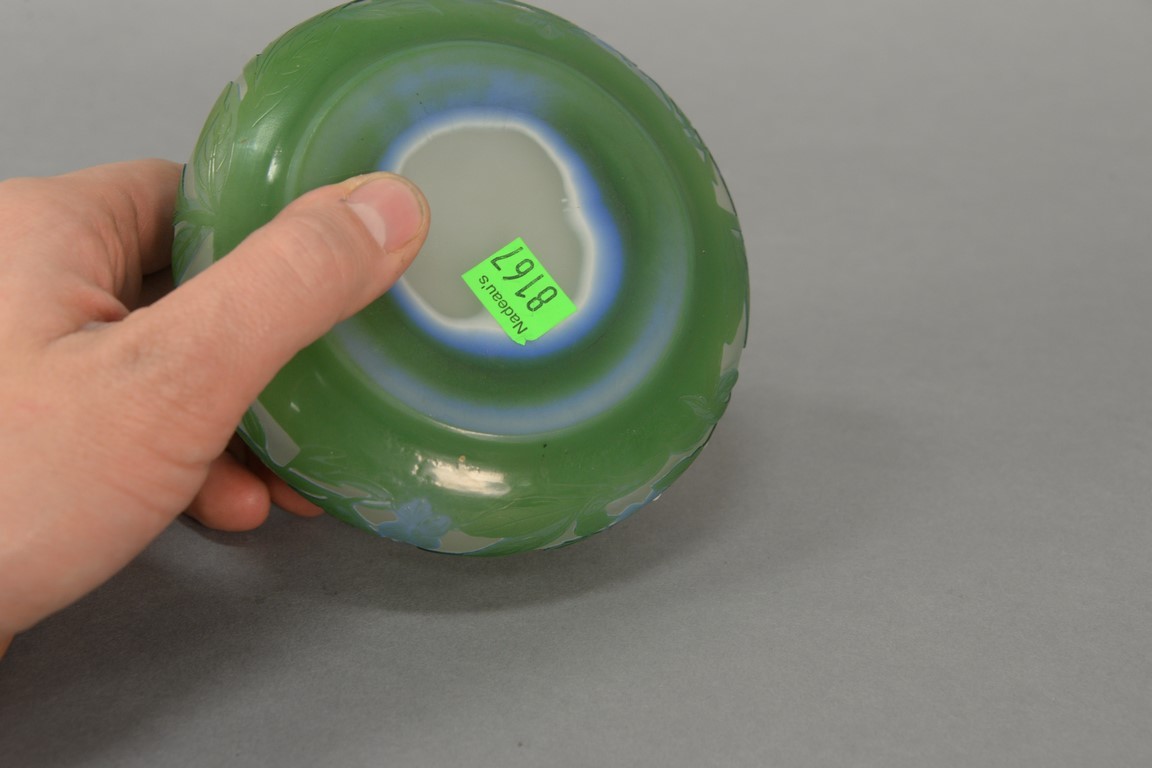 Emile Galle cameo box, circular form green and blue overlaid glass covered box. ht. 2 1/4in., dia. 5in.