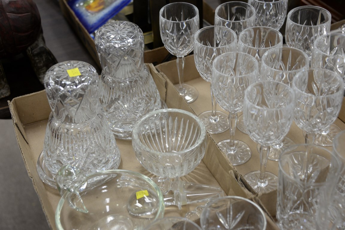 Four box lots of crystal to include a set of matching stems, tall and short glasses, several dishes, two Baccarat underplates with two crystal Bedside carafes and tumblers.