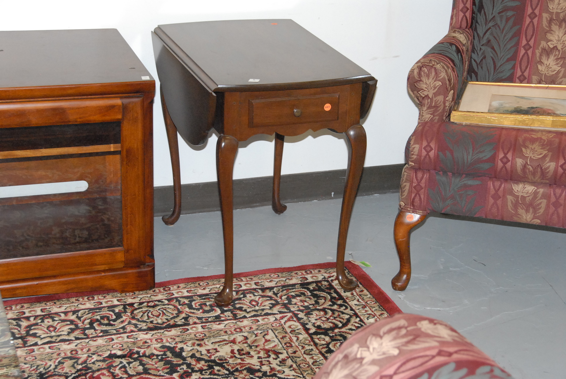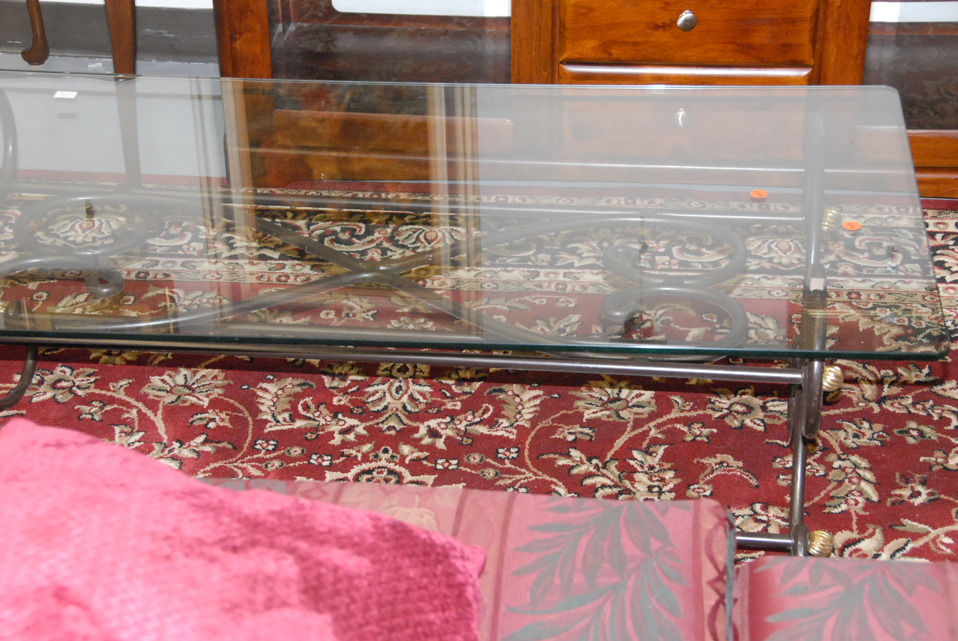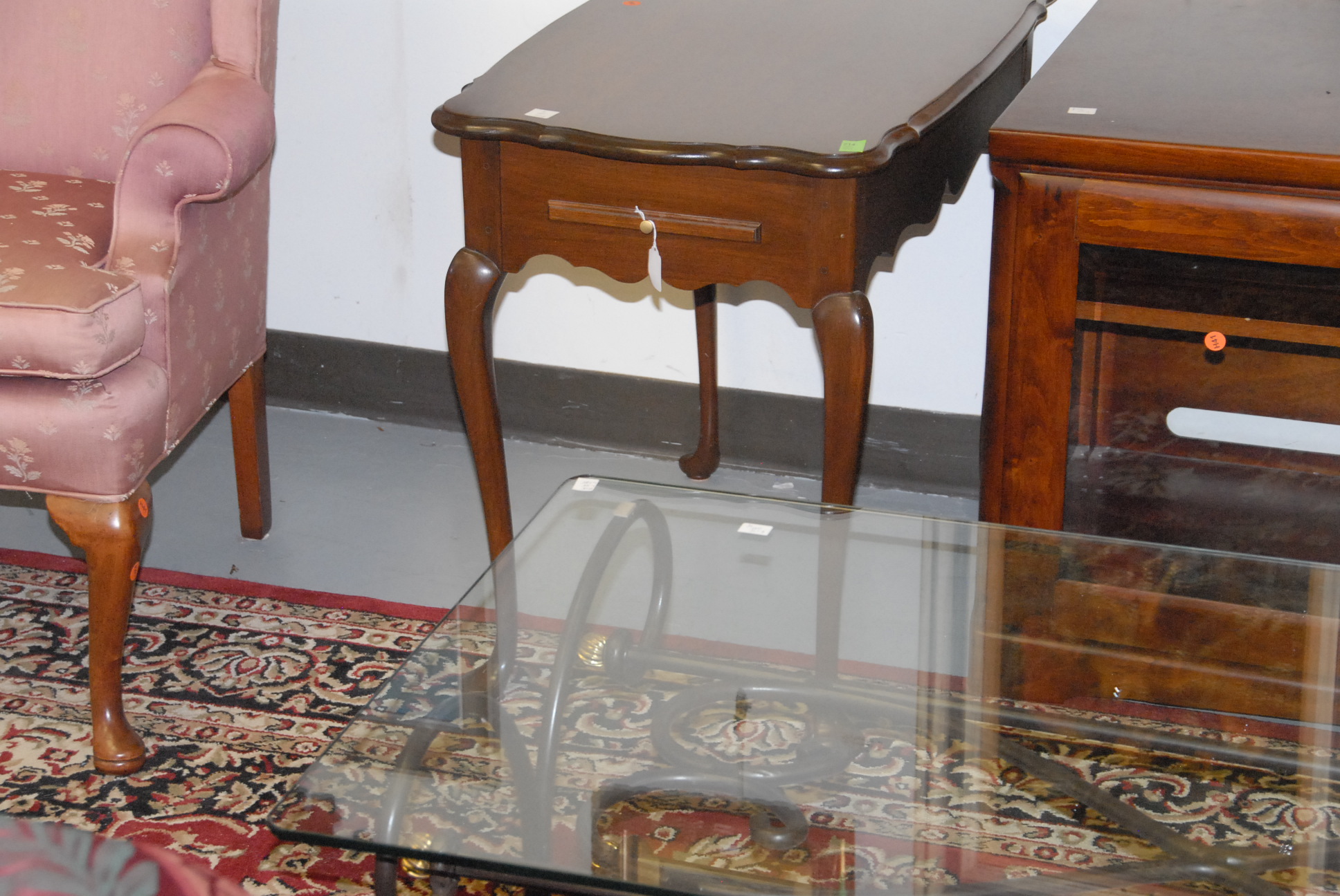 Four living room tables in a glass top and metal table, coffee table, and two Queen Anne end tables.