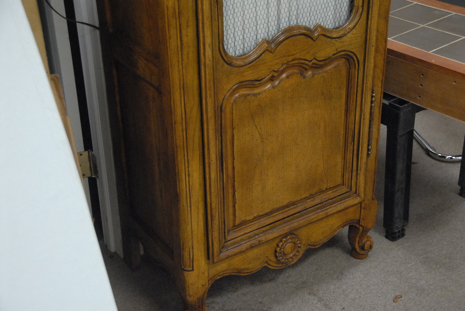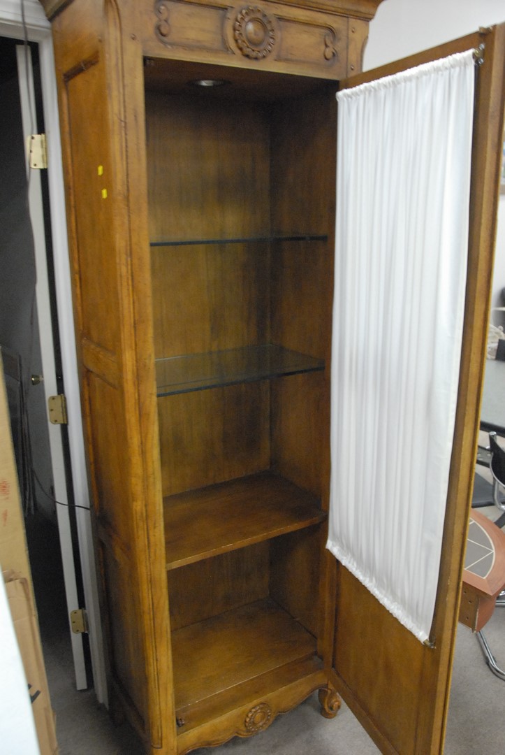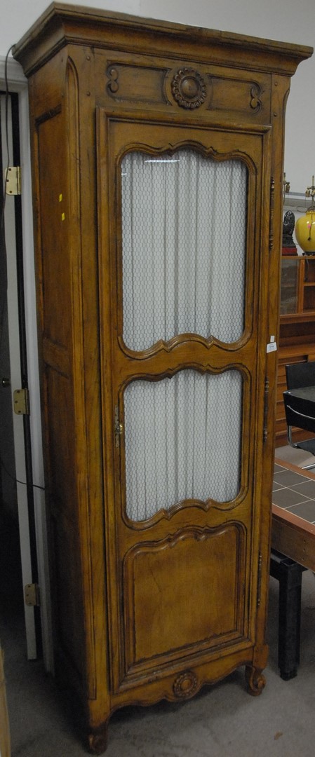 French style one door cabinet with glass paneled door opening to glass shelf inside. ht. 84 in. wd. 29 in. dp. 18 in.