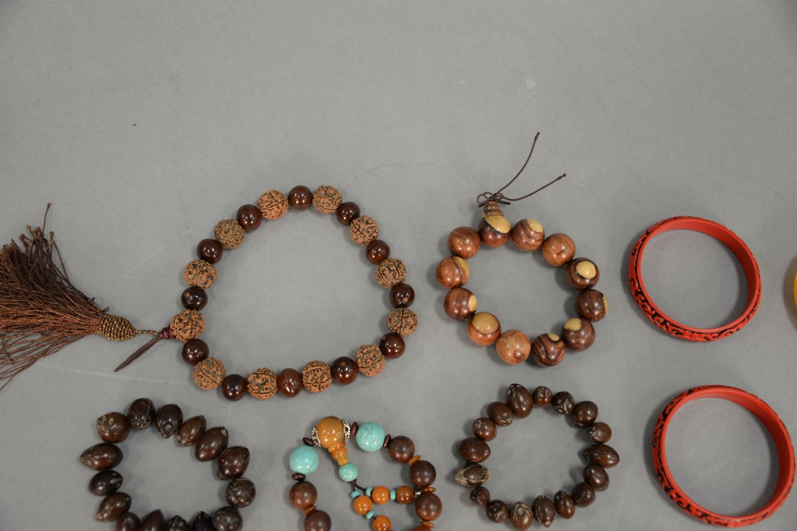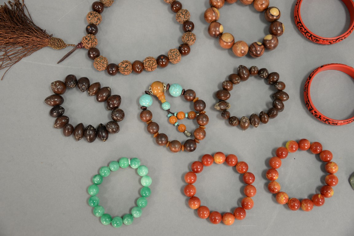 Lot 214: Group of fifteen Oriental jewelry to include eight hardwood and resin and hardstone beaded bracelets, jadeight bracelet, two cinnaba…