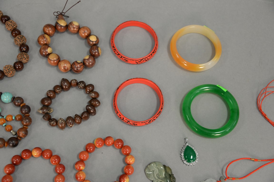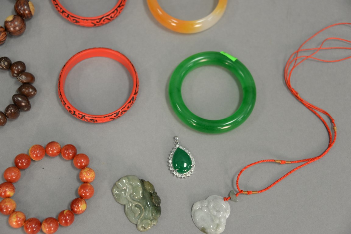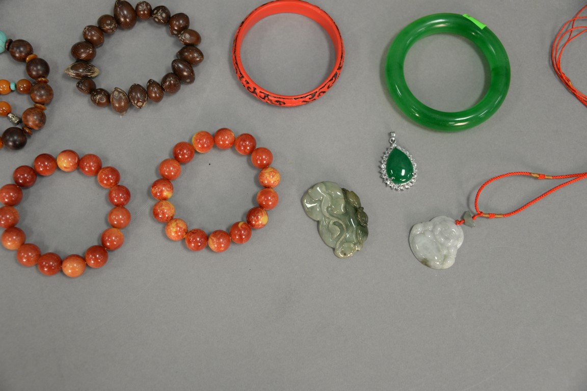 Group of fifteen Oriental jewelry to include eight hardwood and resin and hardstone beaded bracelets, jadeight bracelet, two cinnabar style bracelets, hardstone bracelet, and three jade or jadeight pendants.