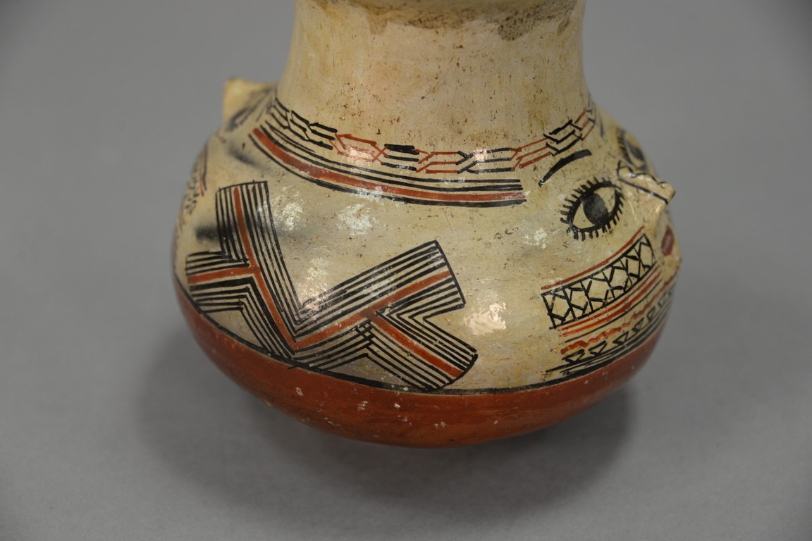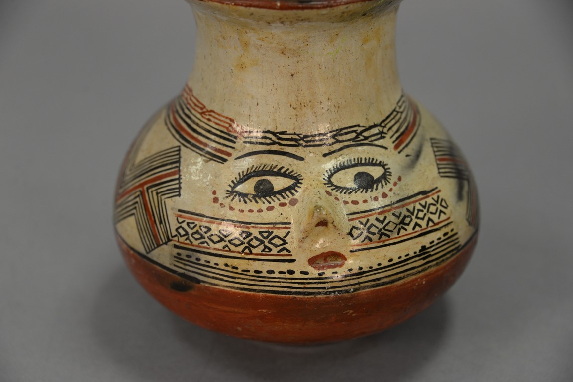 Indian pottery vase, possibly Shipibo polychrome with a face on each side. ht. 6in.