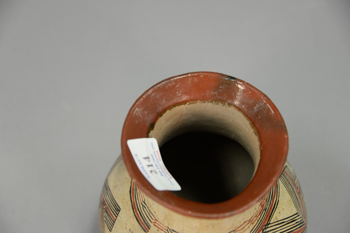 Lot 214: Indian pottery vase, possibly Shipibo polychrome with a face on each side. ht. 6in.