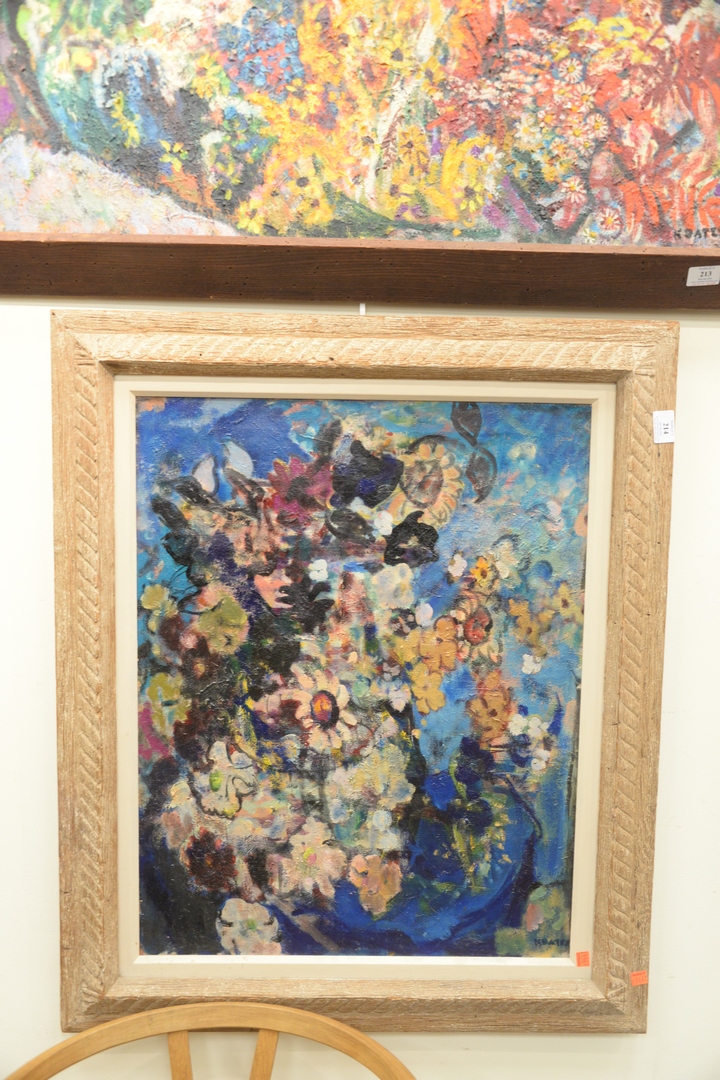 Lot 214: Kenneth Earl Bates (American, 1895 – 1973), Flowers, oil on canvas, signed lower right K. Bates, 28″ x 22″. Provenance: Matthes-Theriault Collection, Woodbridge, Connecticut.