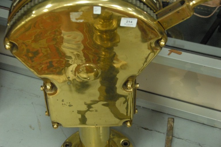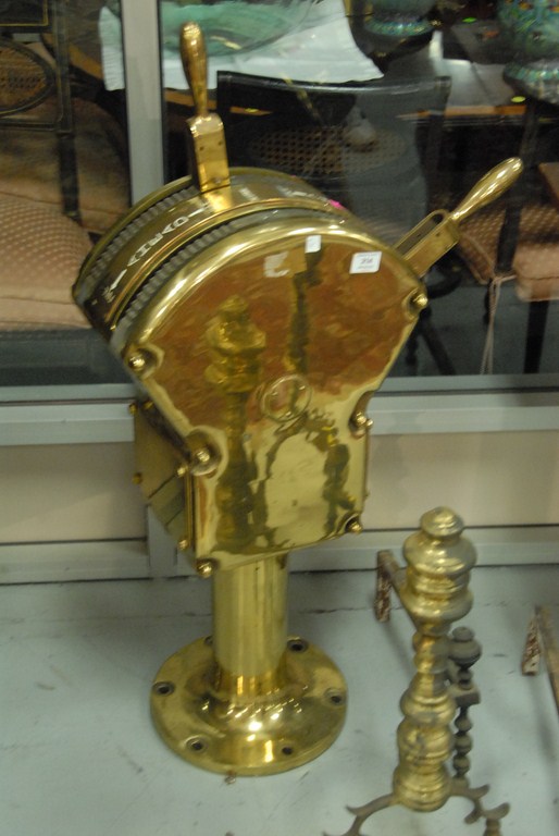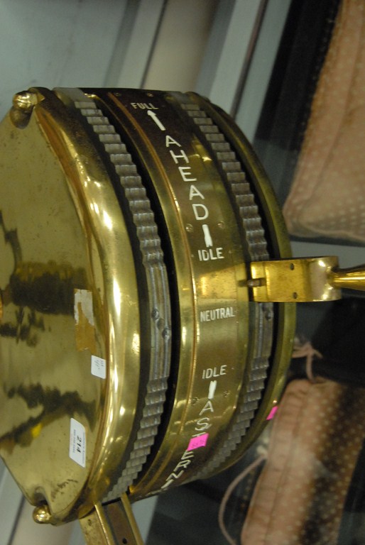 Lot 214: Large bronze ship’s telegraph / throttle control with double handle control mounted on large thick brass base. ht. 41in.