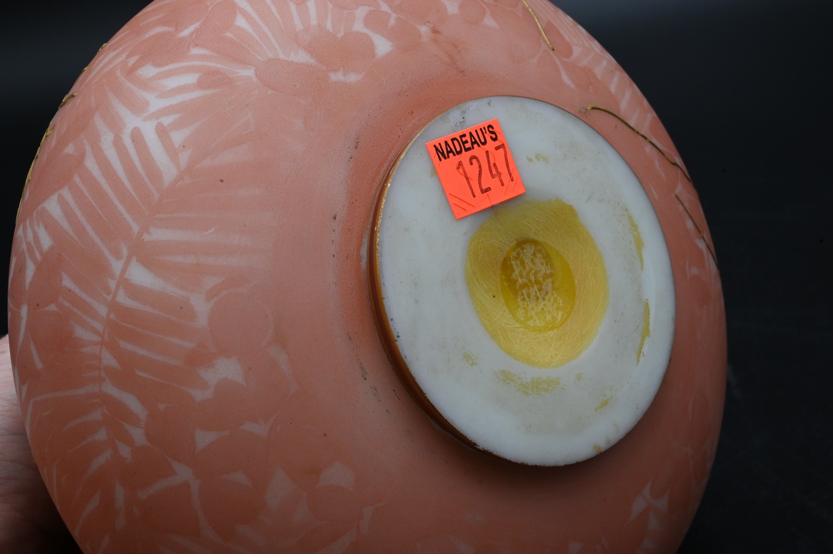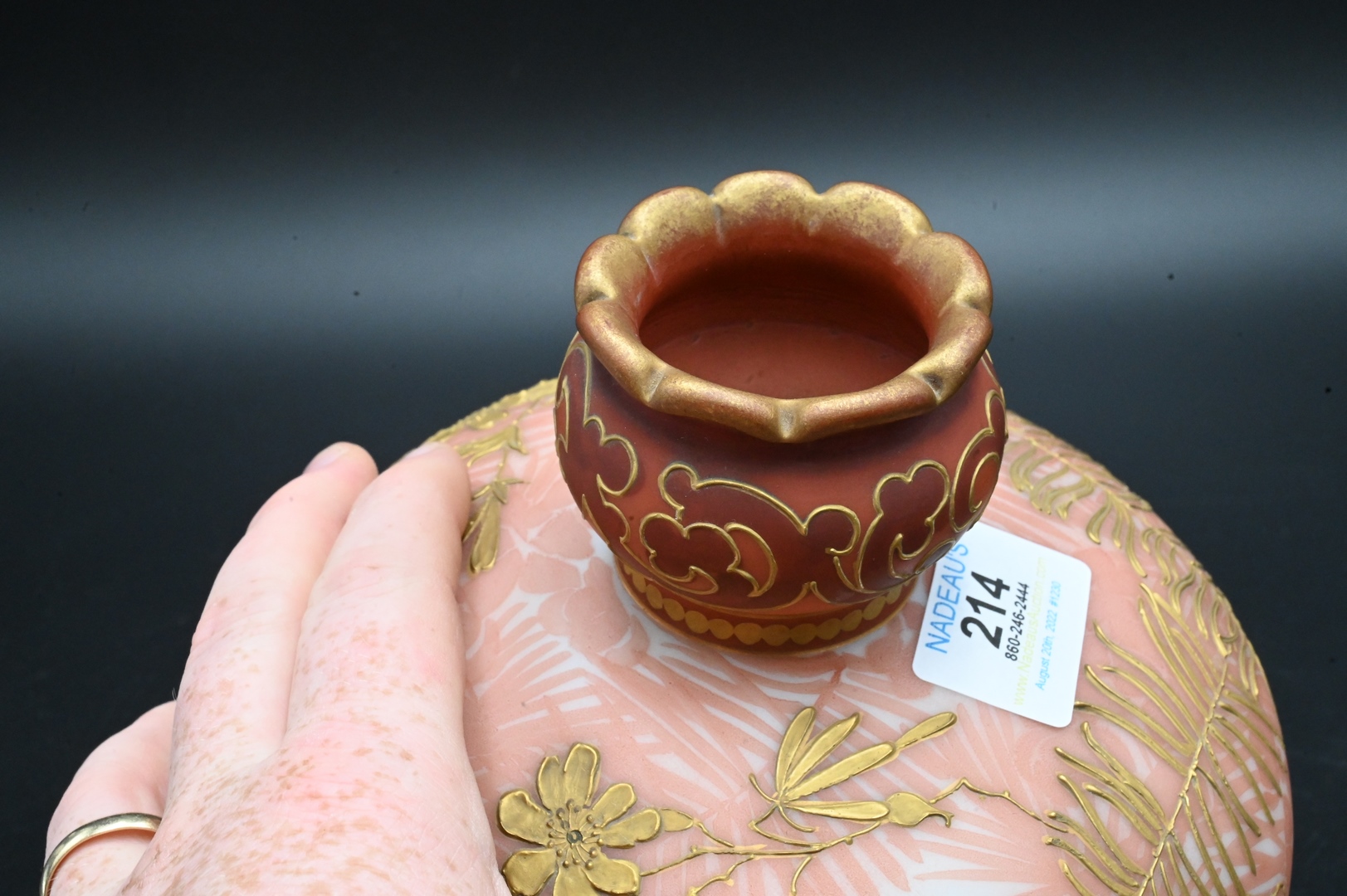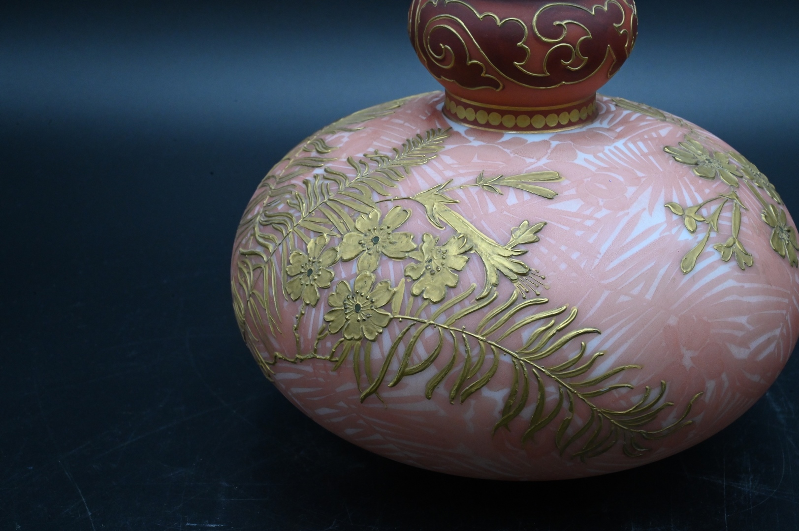 Mt. Washington Crown Milano Glass Vases, having raised gold fern leaf decoration, height 6 inches. Provenance: From the Estate of Elwyn W. Lemon, Enfield, Connecticut.