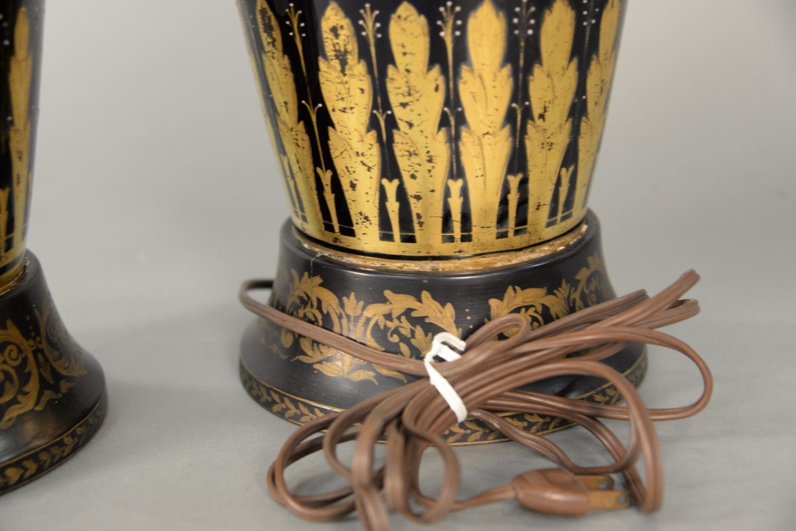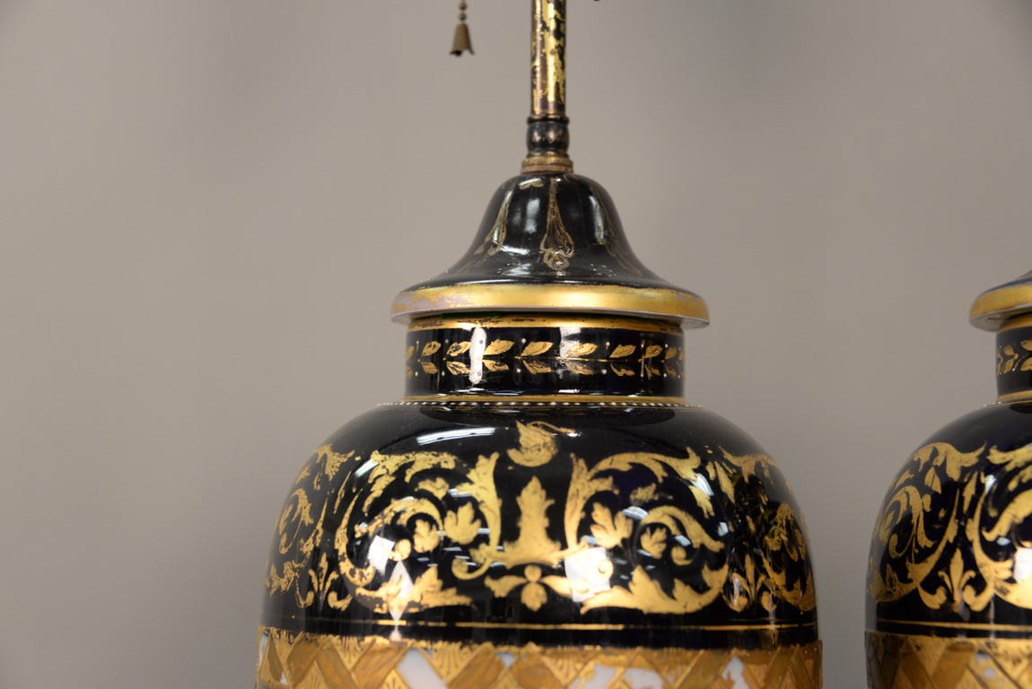Lot 214: Pair of Sevres type urns made into table lamps, each with gold highlighted cobalt bodies and hand painted panels with people and animals some gold worn, 1 cover repaired, drilled. vase ht. 19 1/2 in. total ht. 36 in.