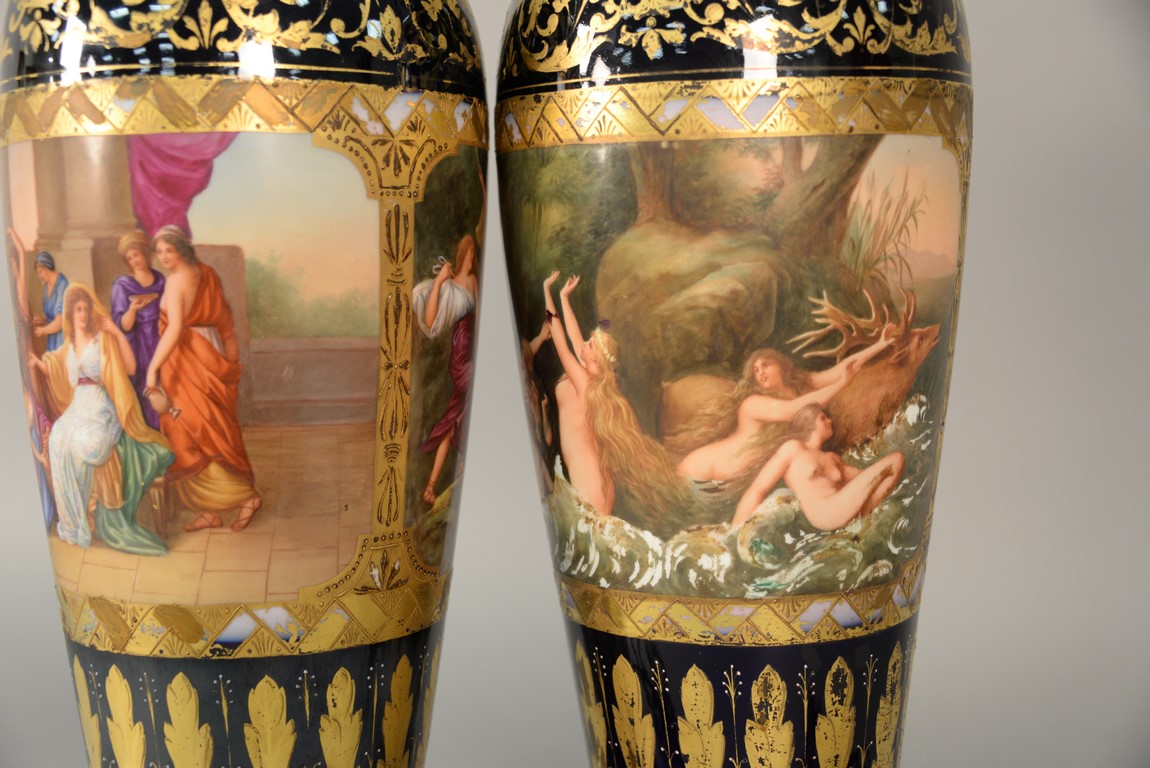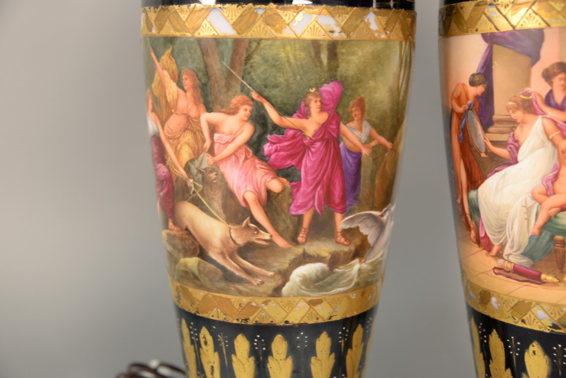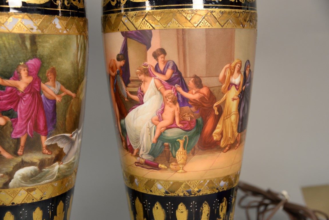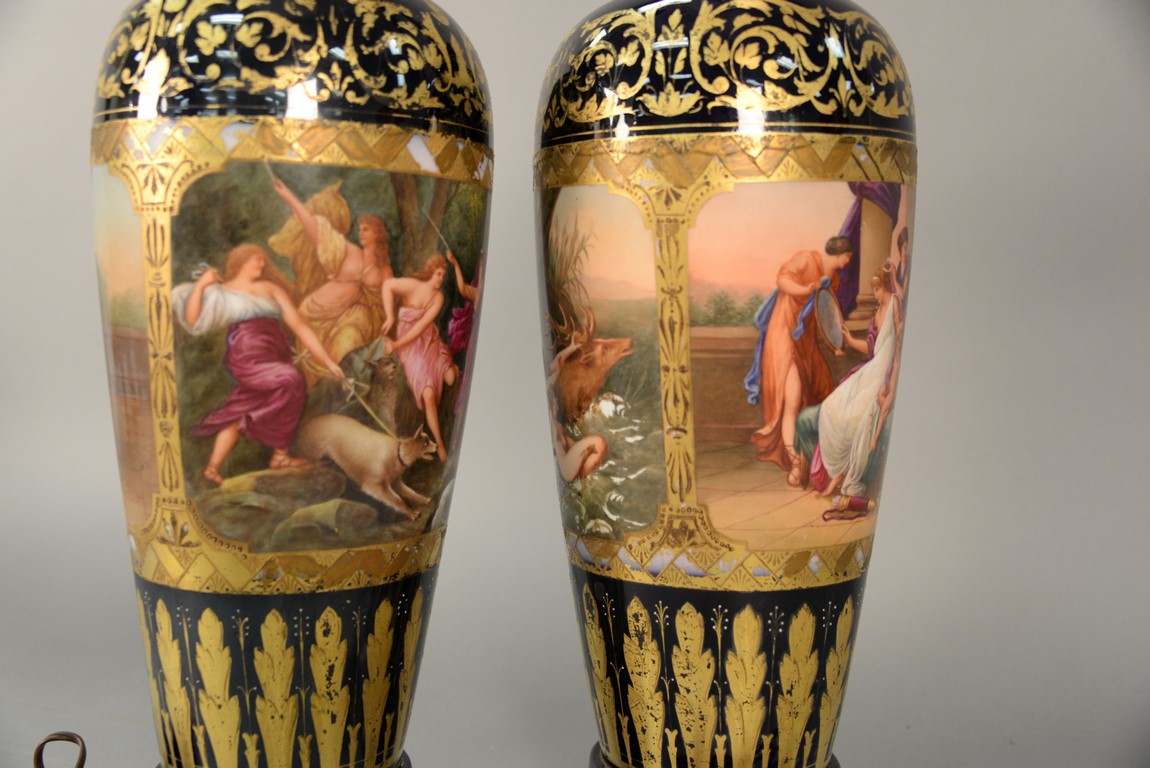 Pair of Sevres type urns made into table lamps, each with gold highlighted cobalt bodies and hand painted panels with people and animals some gold worn, 1 cover repaired, drilled. vase ht. 19 1/2 in. total ht. 36 in.