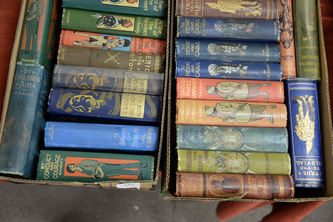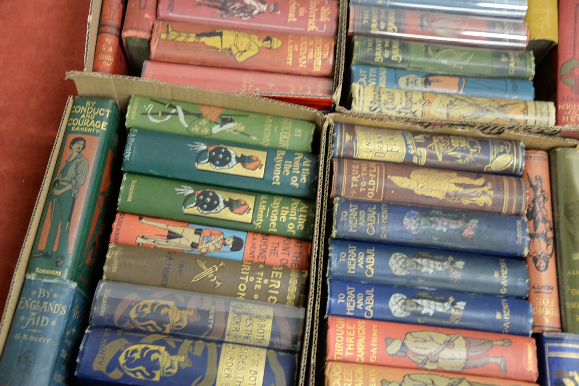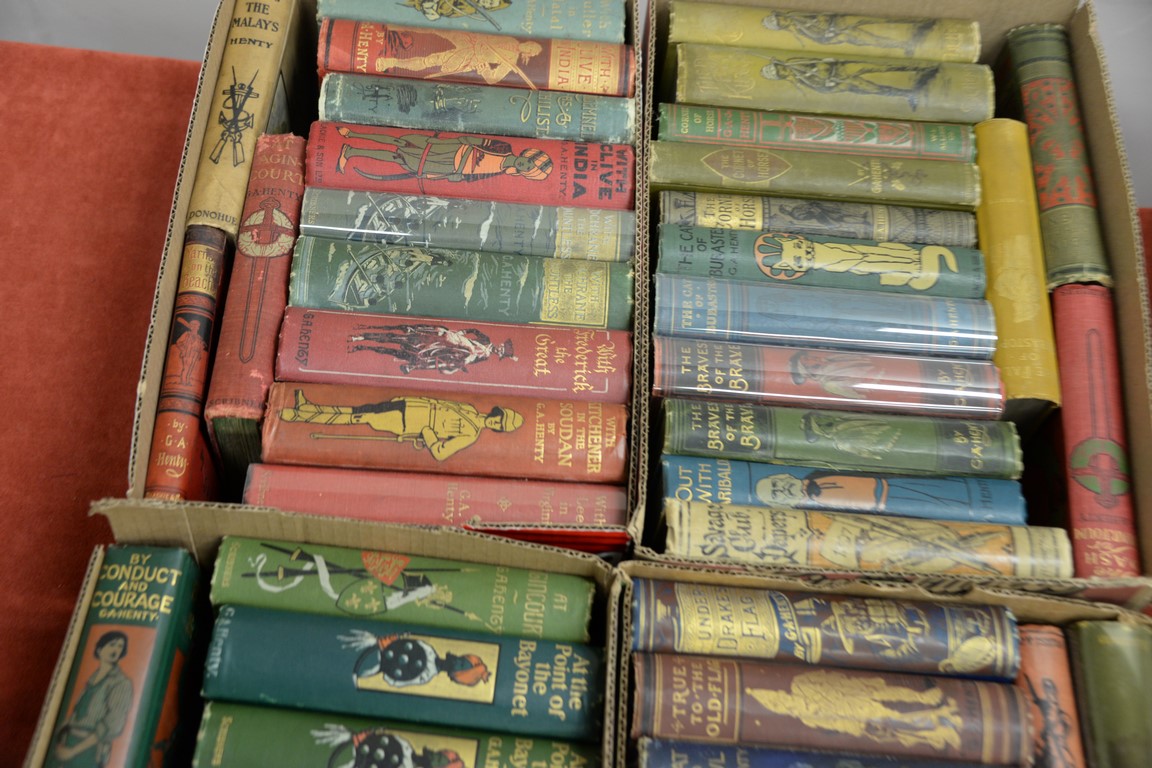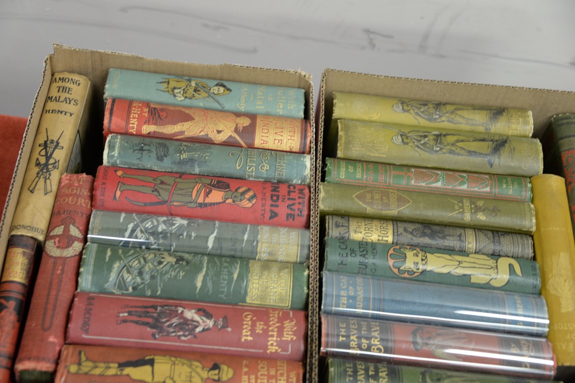 Set of 50 G.A. Henty books with colored and gilt bindings, some first editions.