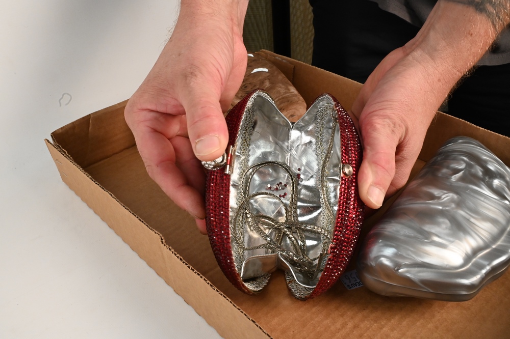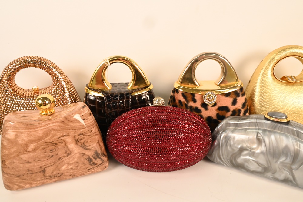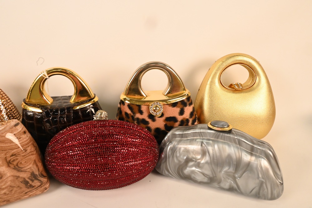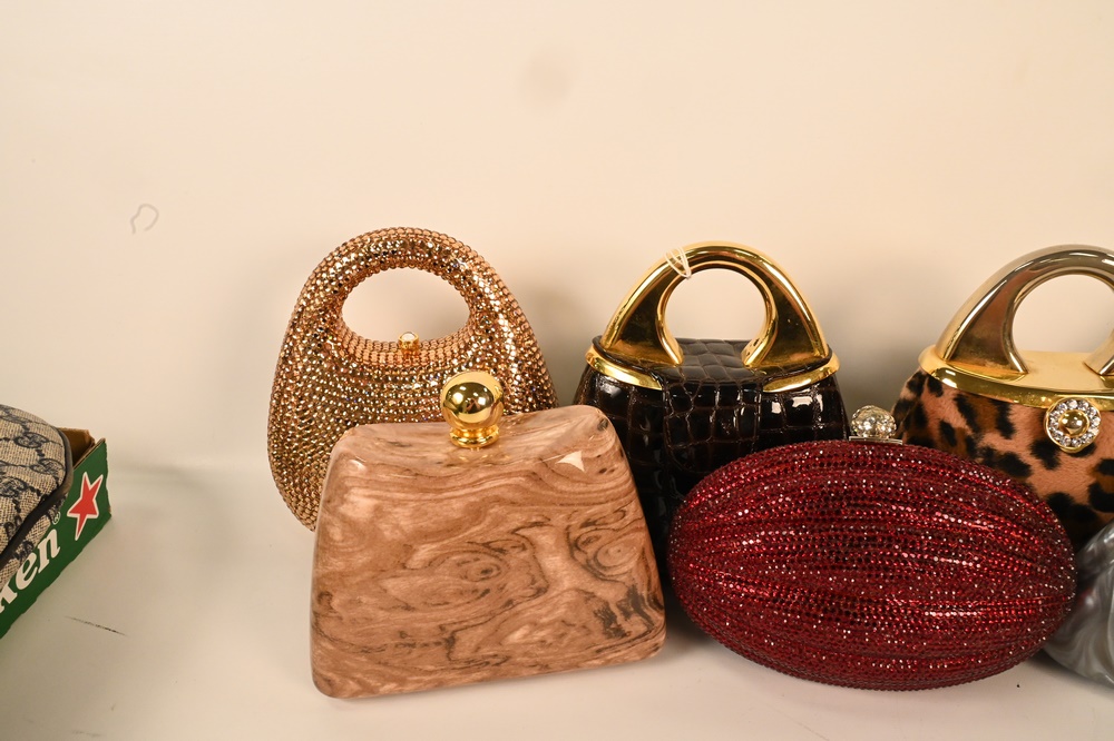 Lot 214: Seven Piece Lot of Minaudiere Evening Purses, to include jewelled, leather and plastic, some scratches to leather, minimal stone loss.