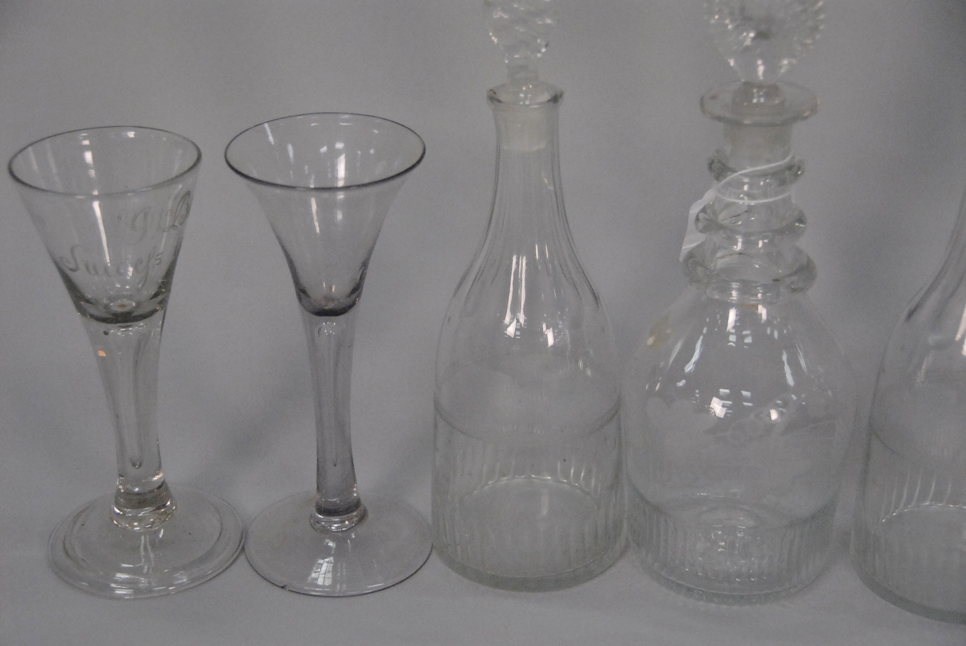 Seven piece lot to include four early clear glass stems, one etched Success to the Unity and three decanters. ht. 10in. – 10 1/2in.