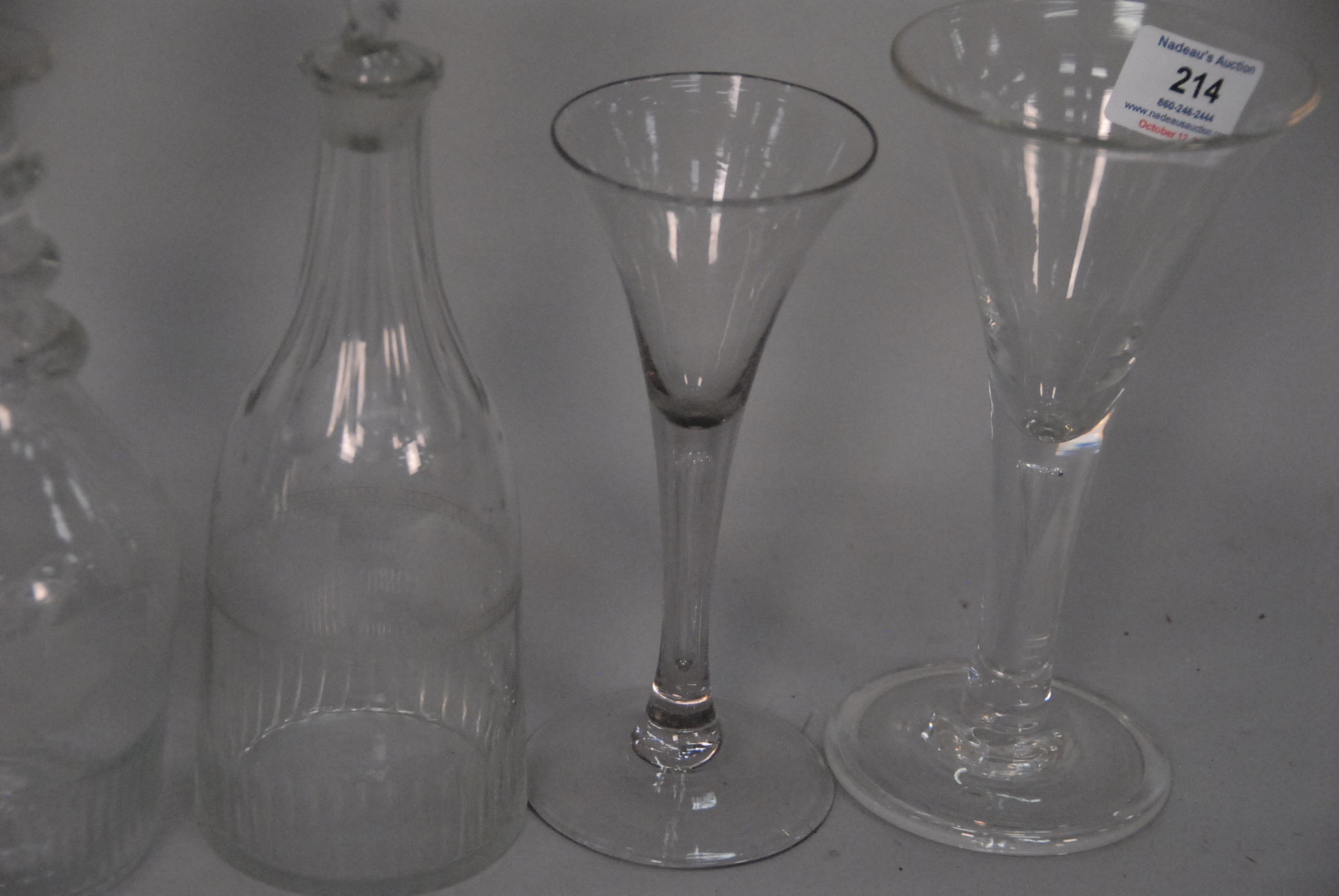 Lot 214: Seven piece lot to include four early clear glass stems, one etched Success to the Unity and three decanters. ht. 10in. – 10 1/2in.