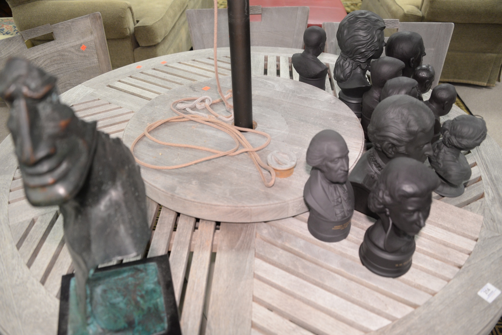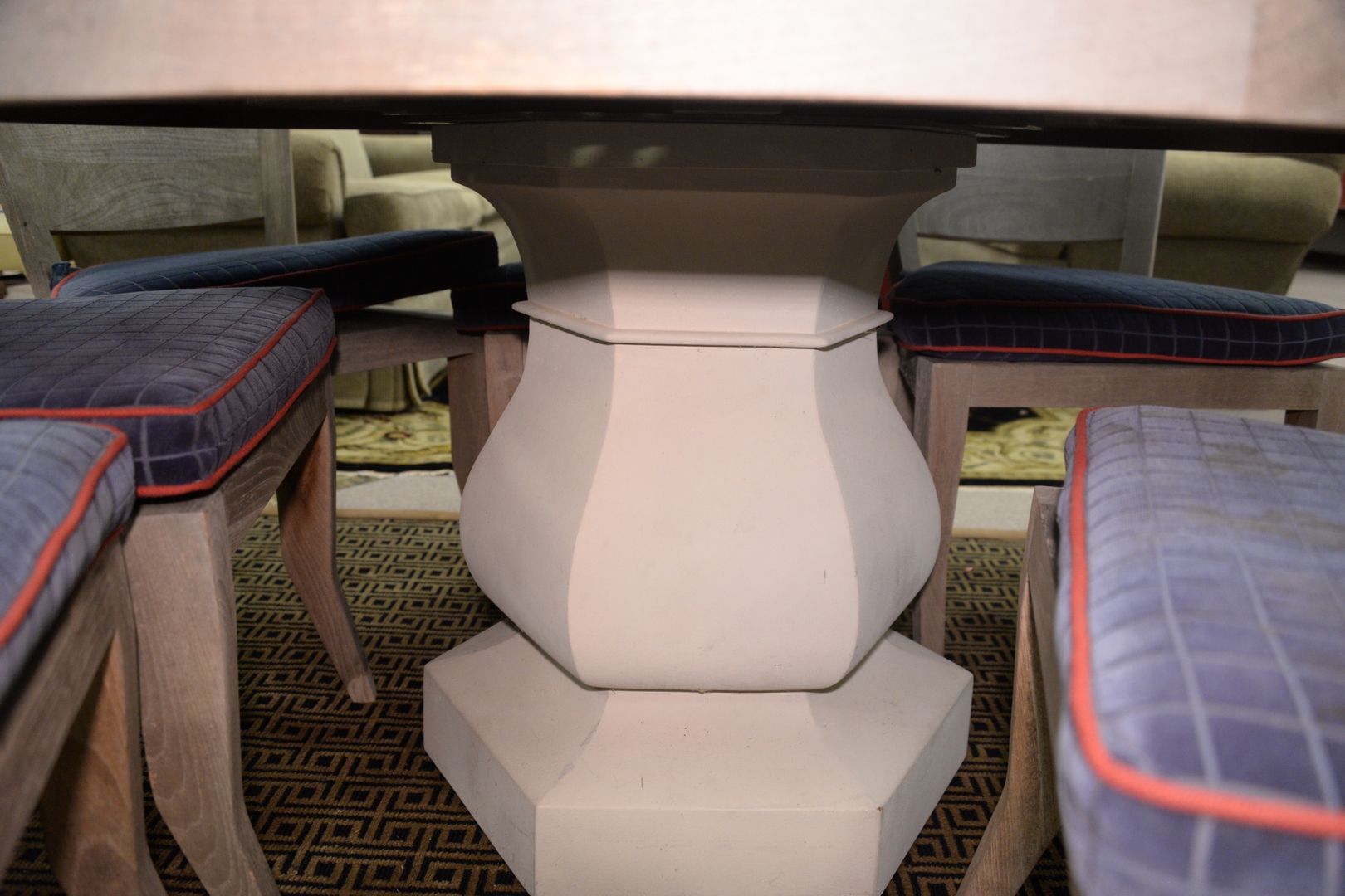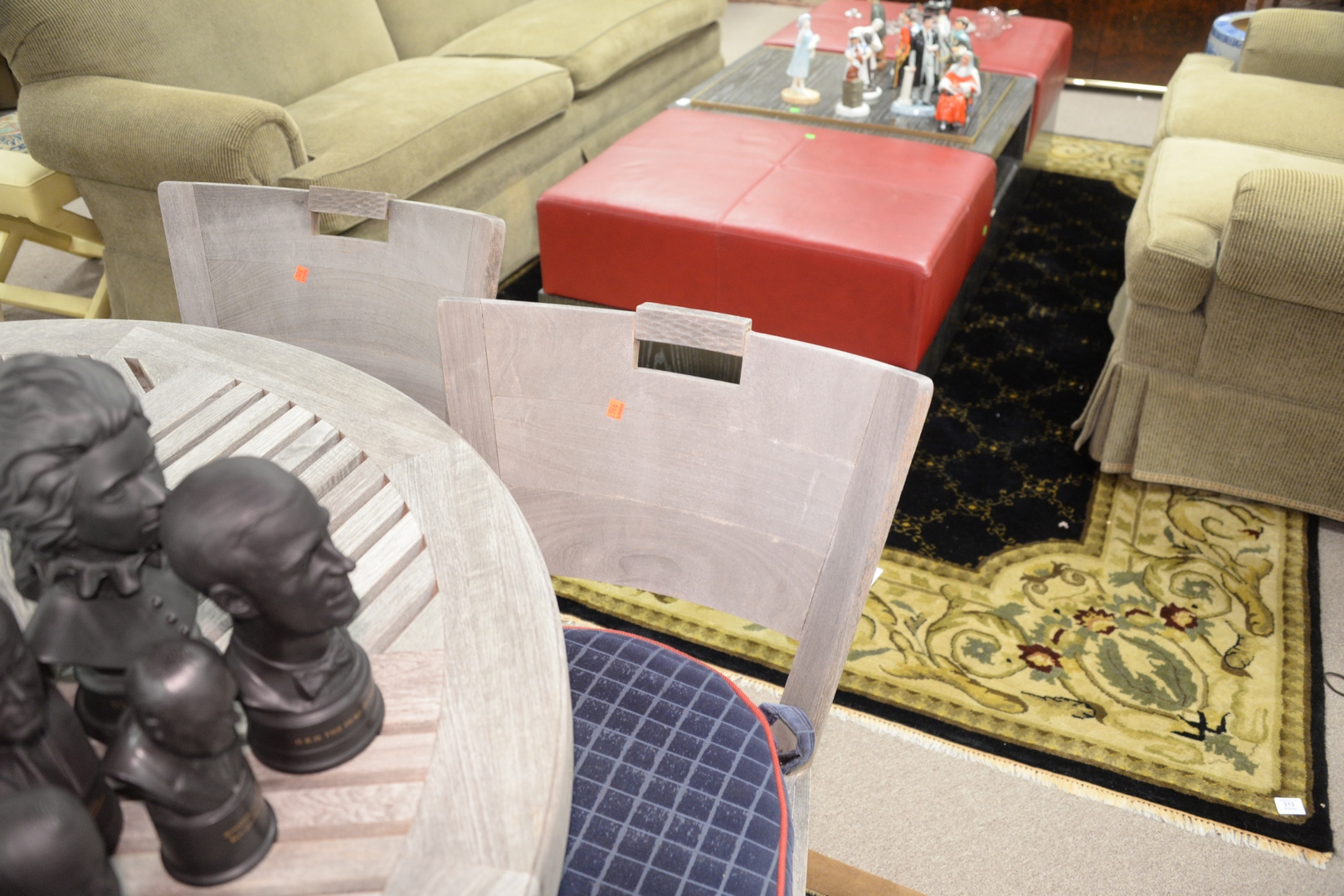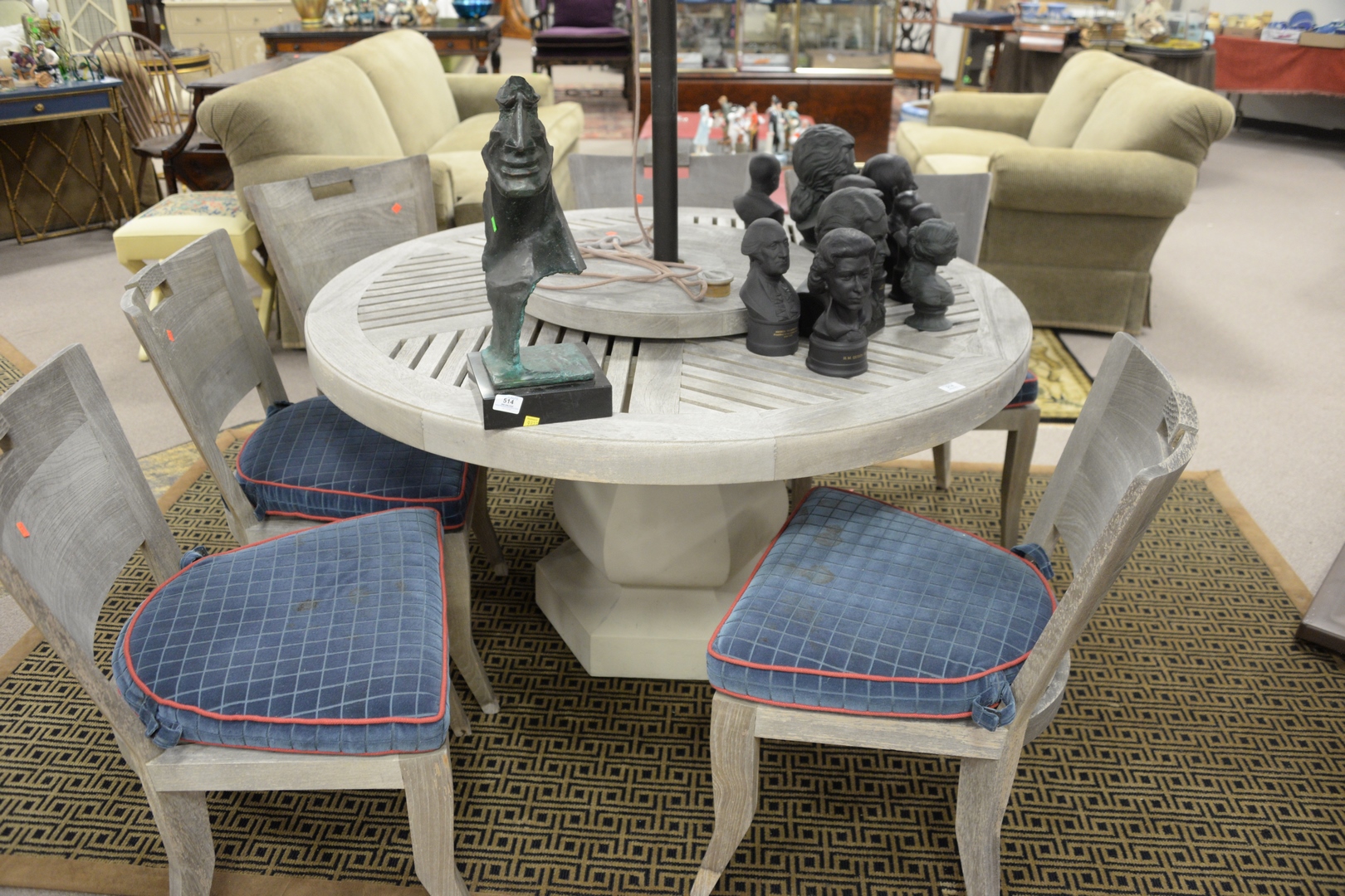 Lot 214: Seven Piece Sutherland Teak Outdoor Patio Set, having six matching side chairs with custom seat cushions, round table on cement pedestal and lazy Susan, diameter 54 inches. Provenance: David and Cynthia Kim, 22 Stoney Wylde Lane, Greenwich, Connecticut. View home by visiting: https://www.zillow.com/homedetails/22-Stoney-Wylde-Ln-Greenwich-CT-06830/177238281_zpid/
