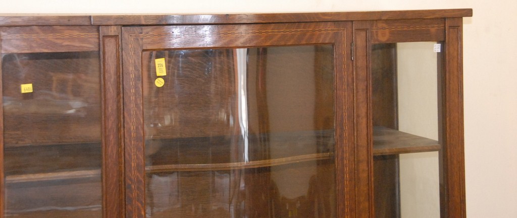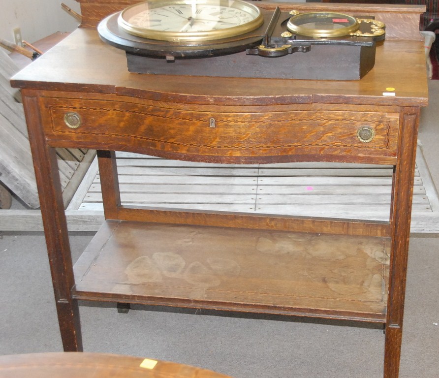 Three piece lot oak Victorian inlaid china cabinet, round oak table, and server.