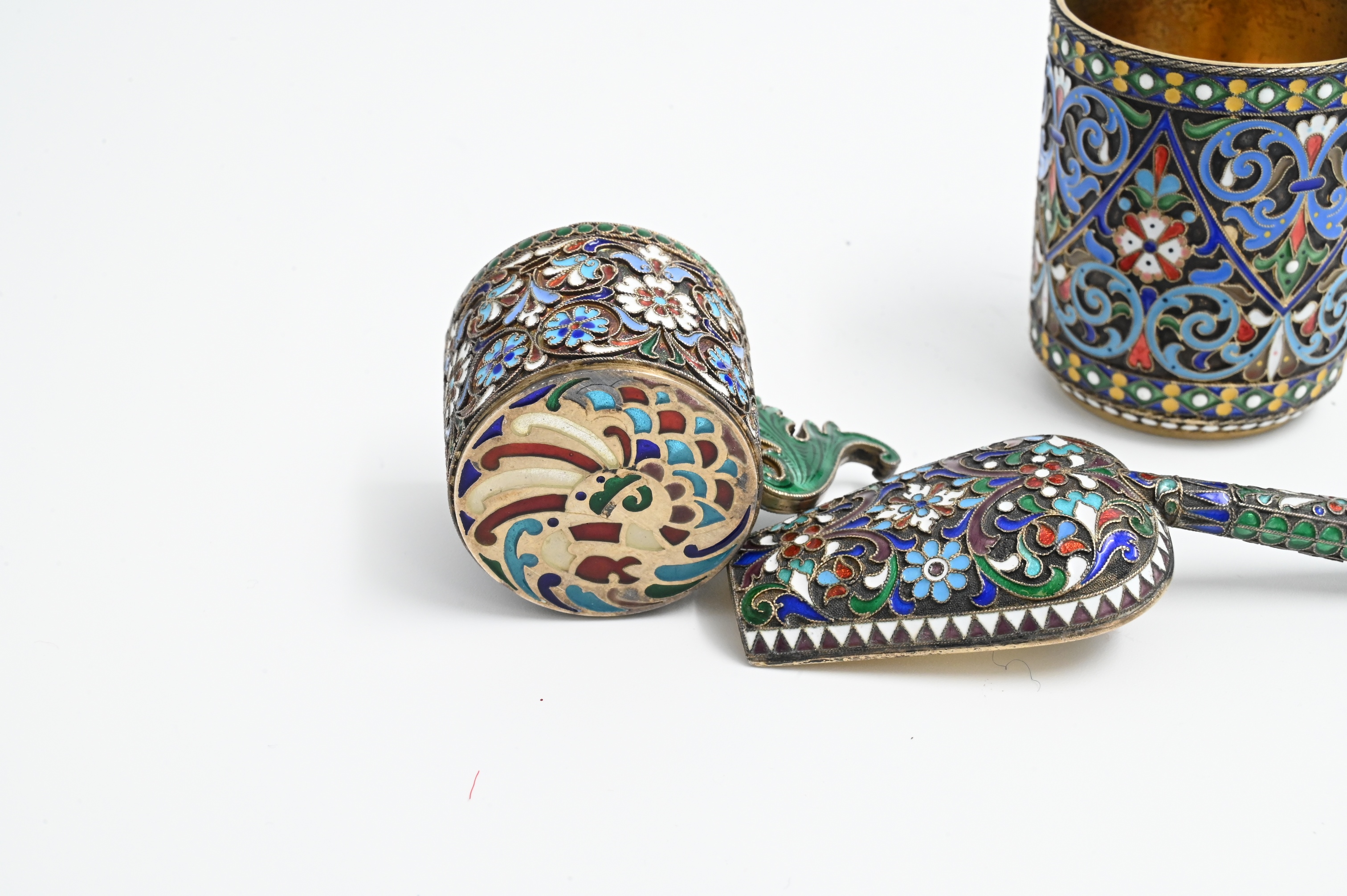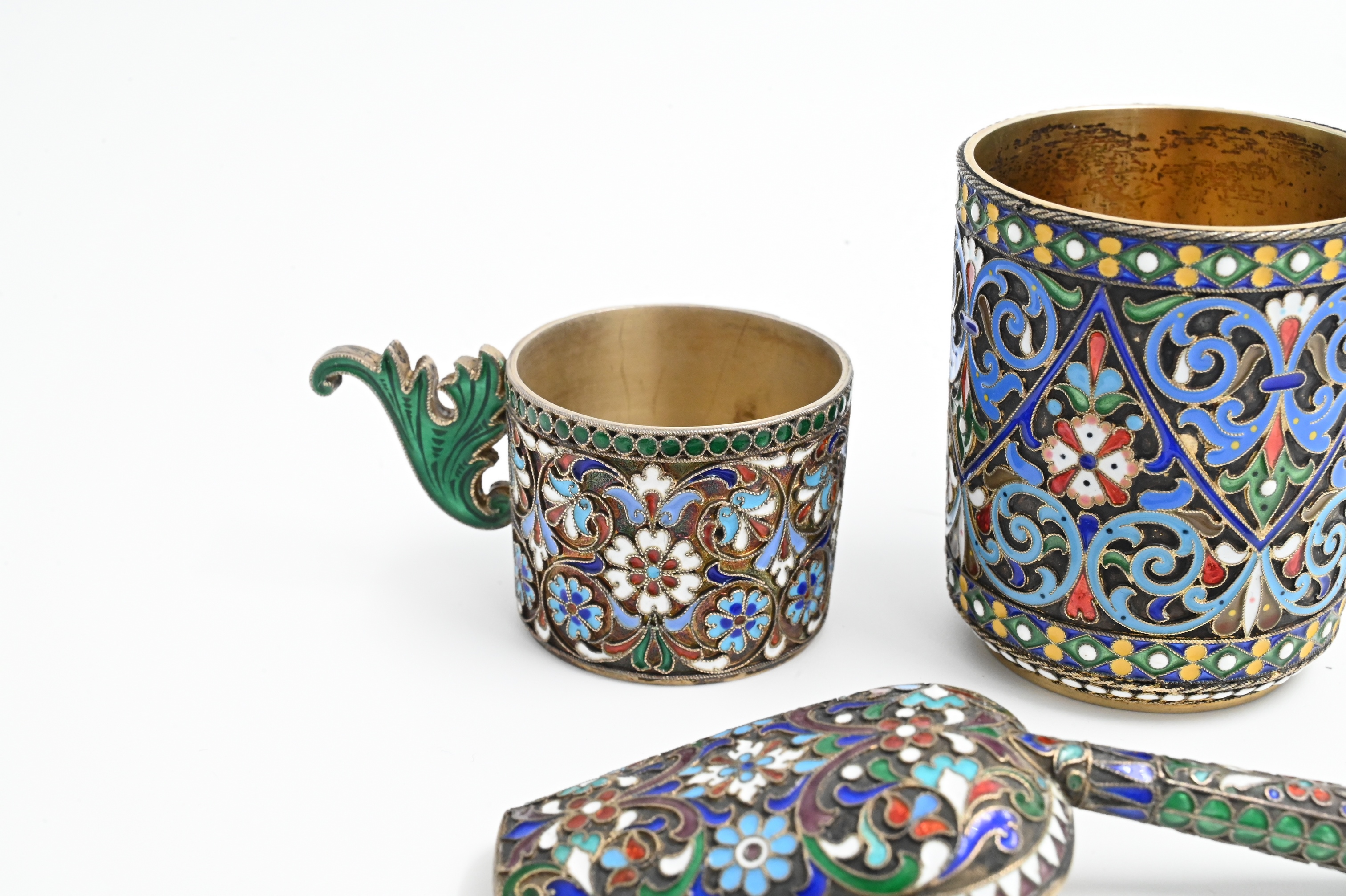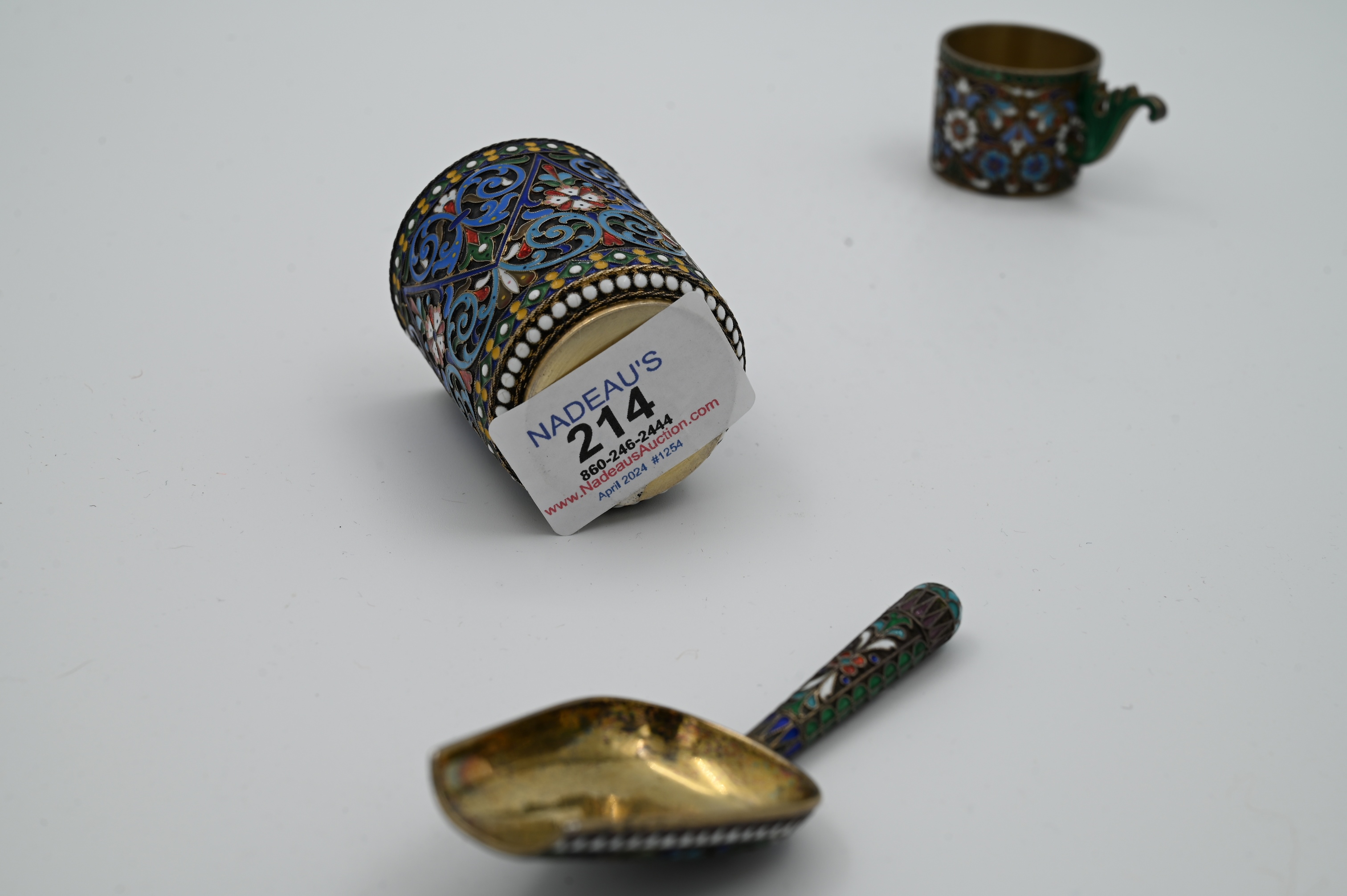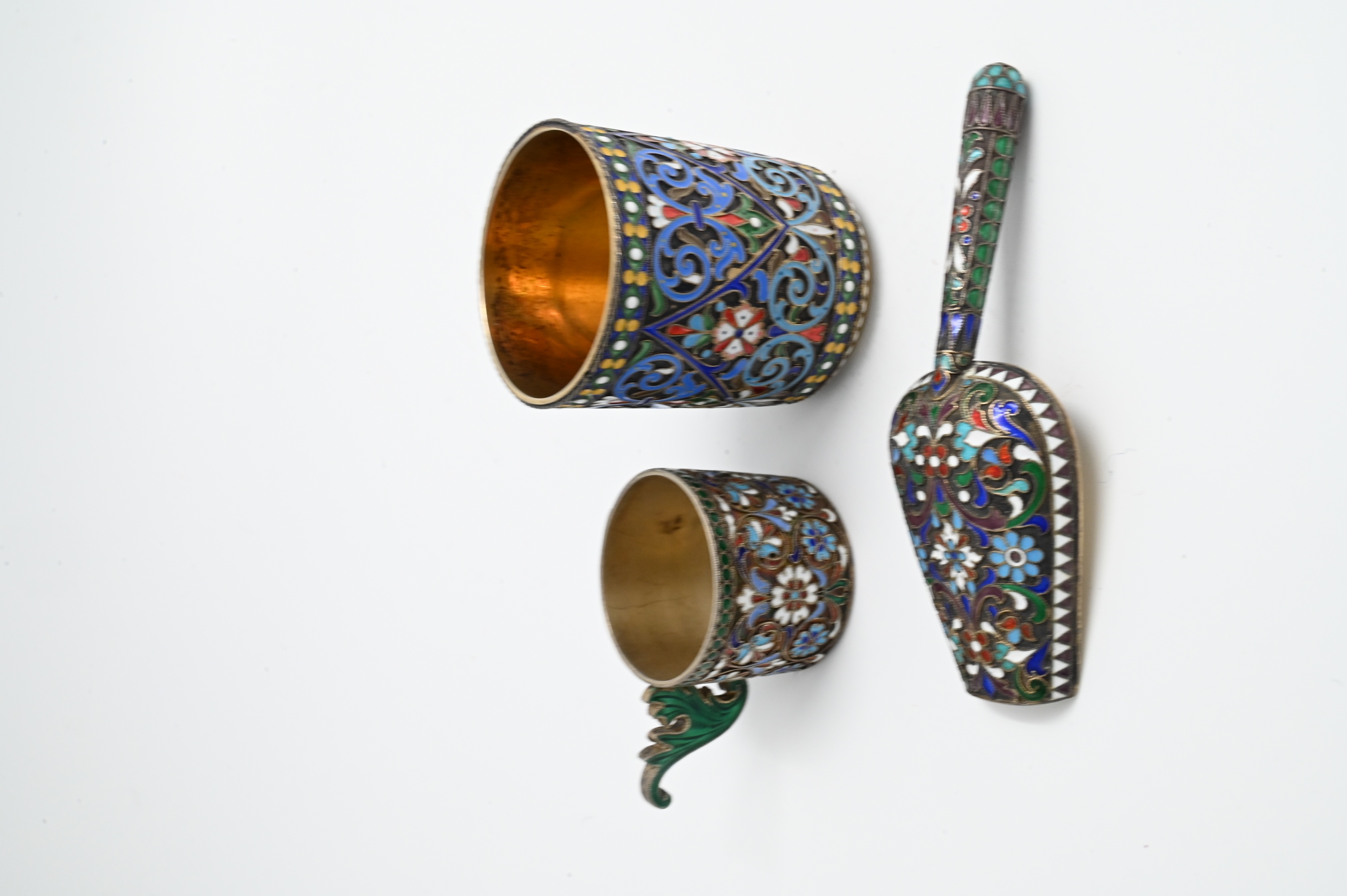 to include sugar shovel having gold wash length 4 3/4 inches, tea glass holder, and vodka cup (shot glass) marked 88, having makers hallmark height 2 inches