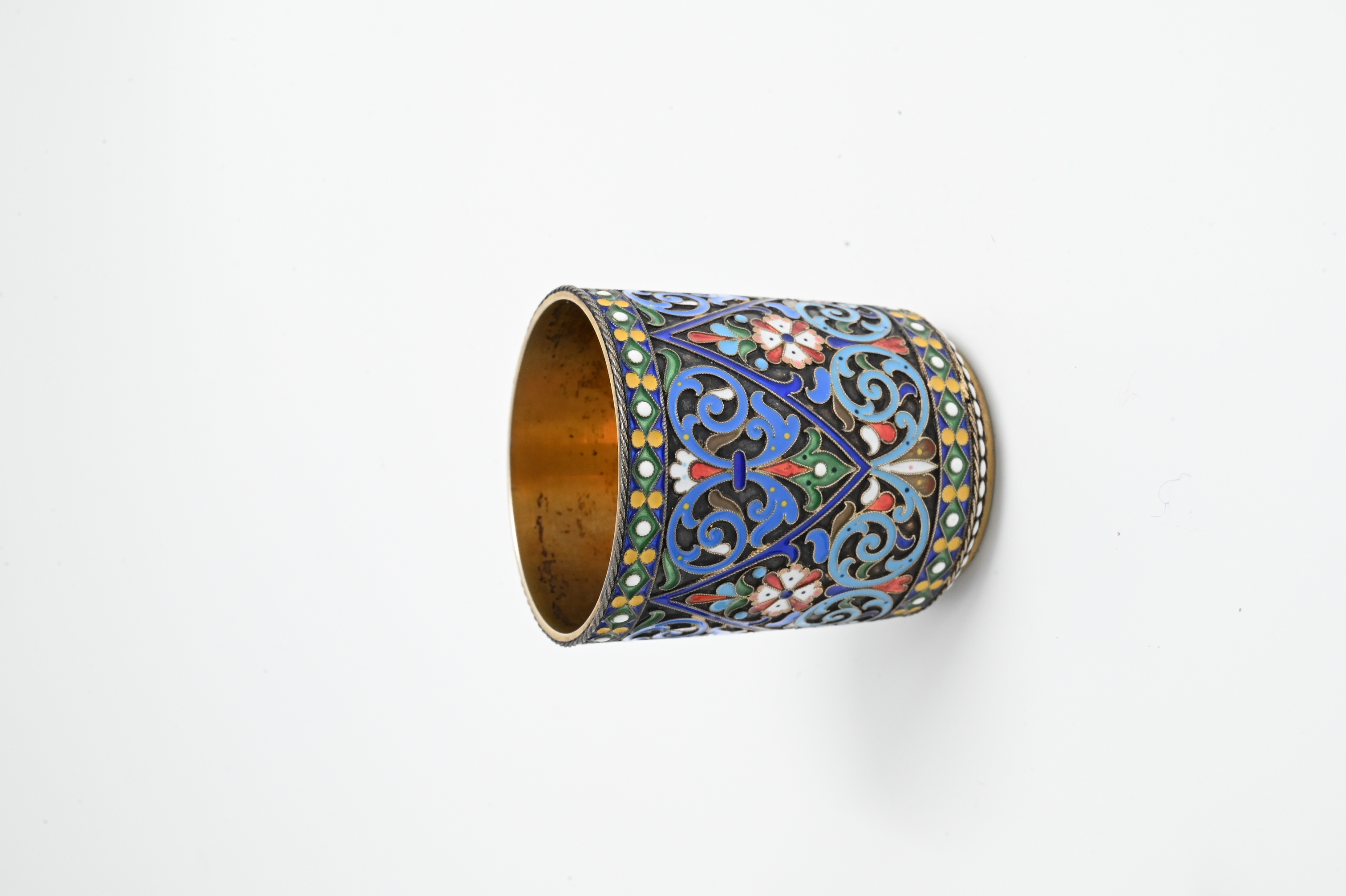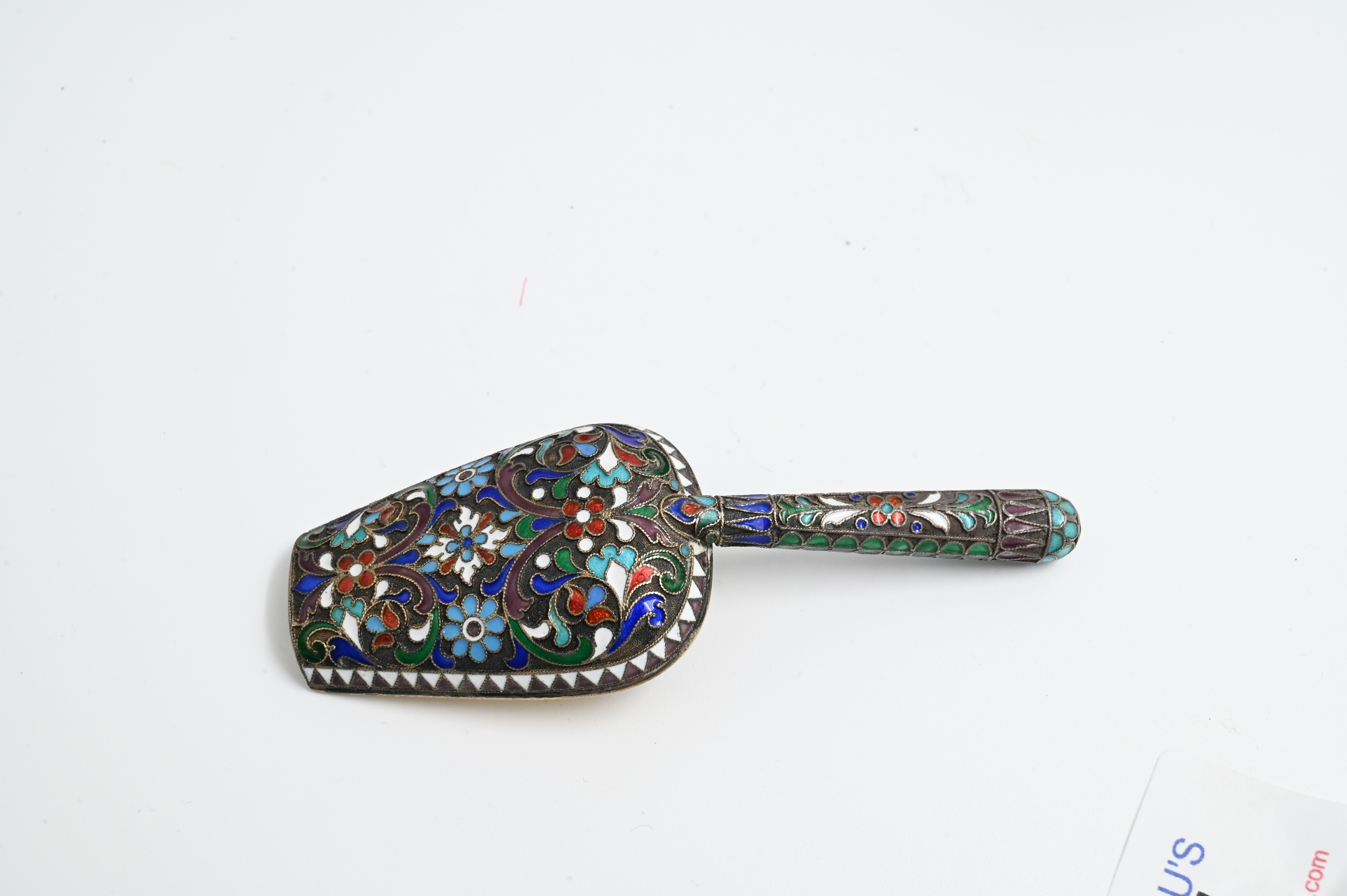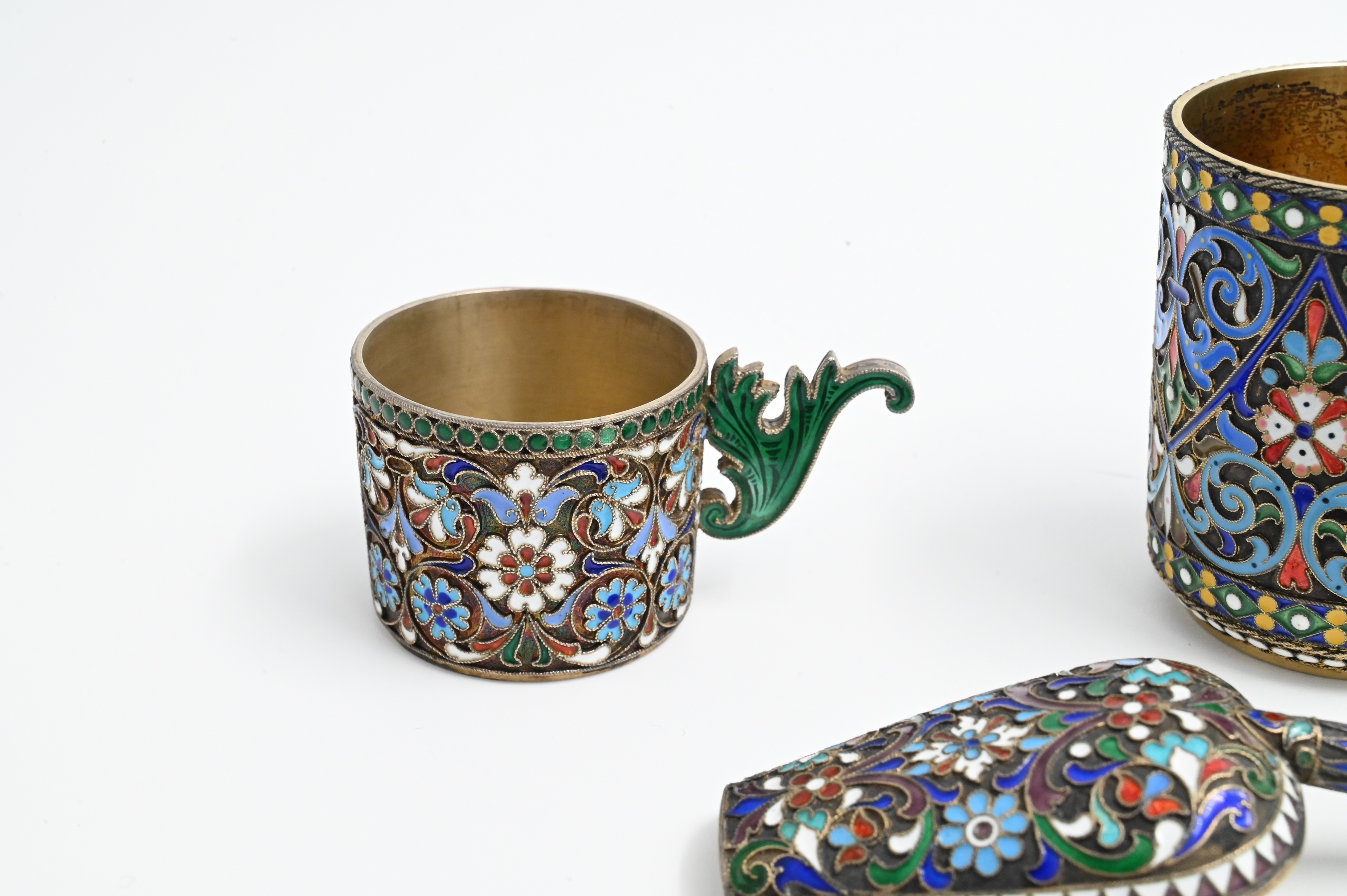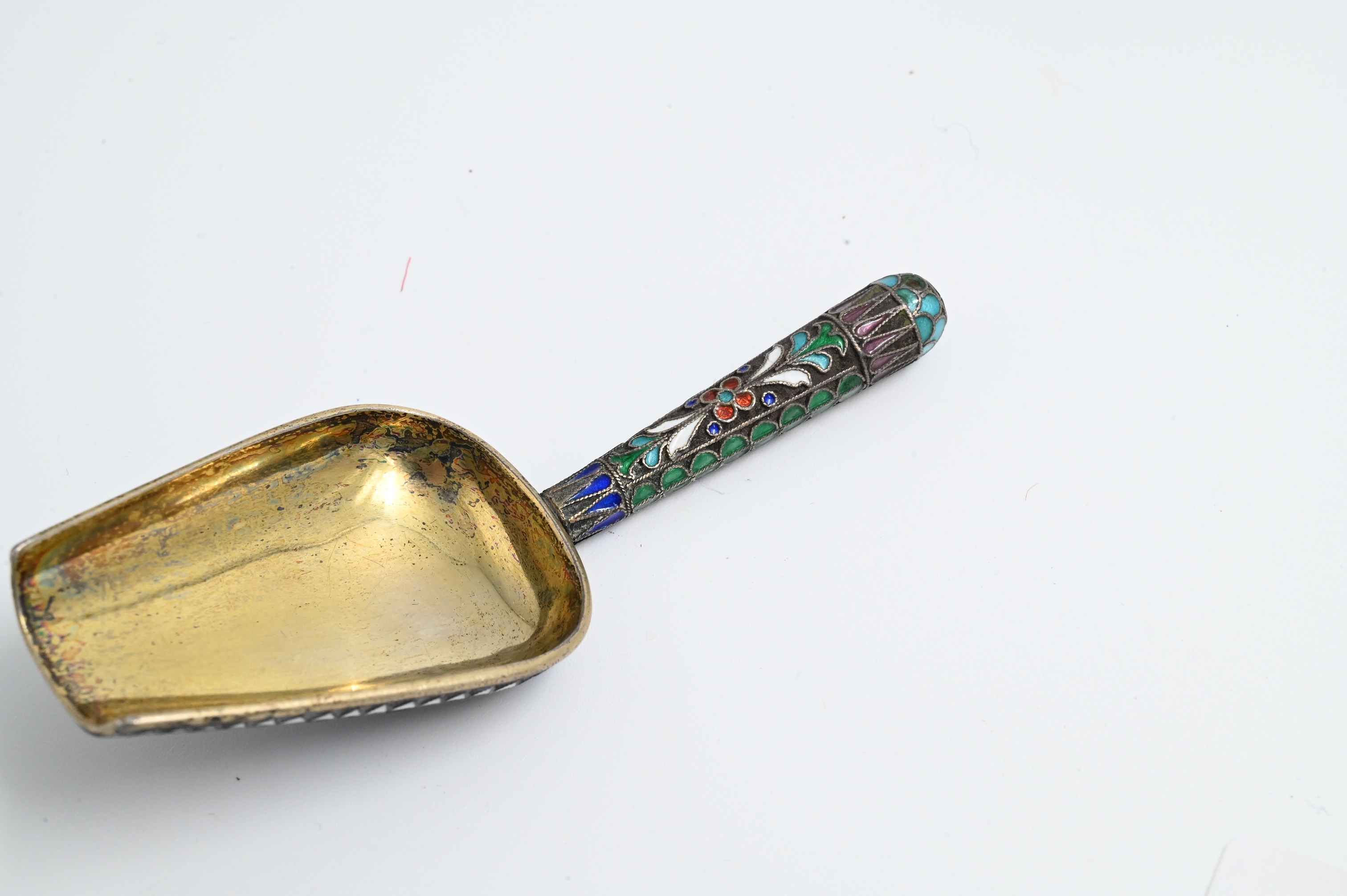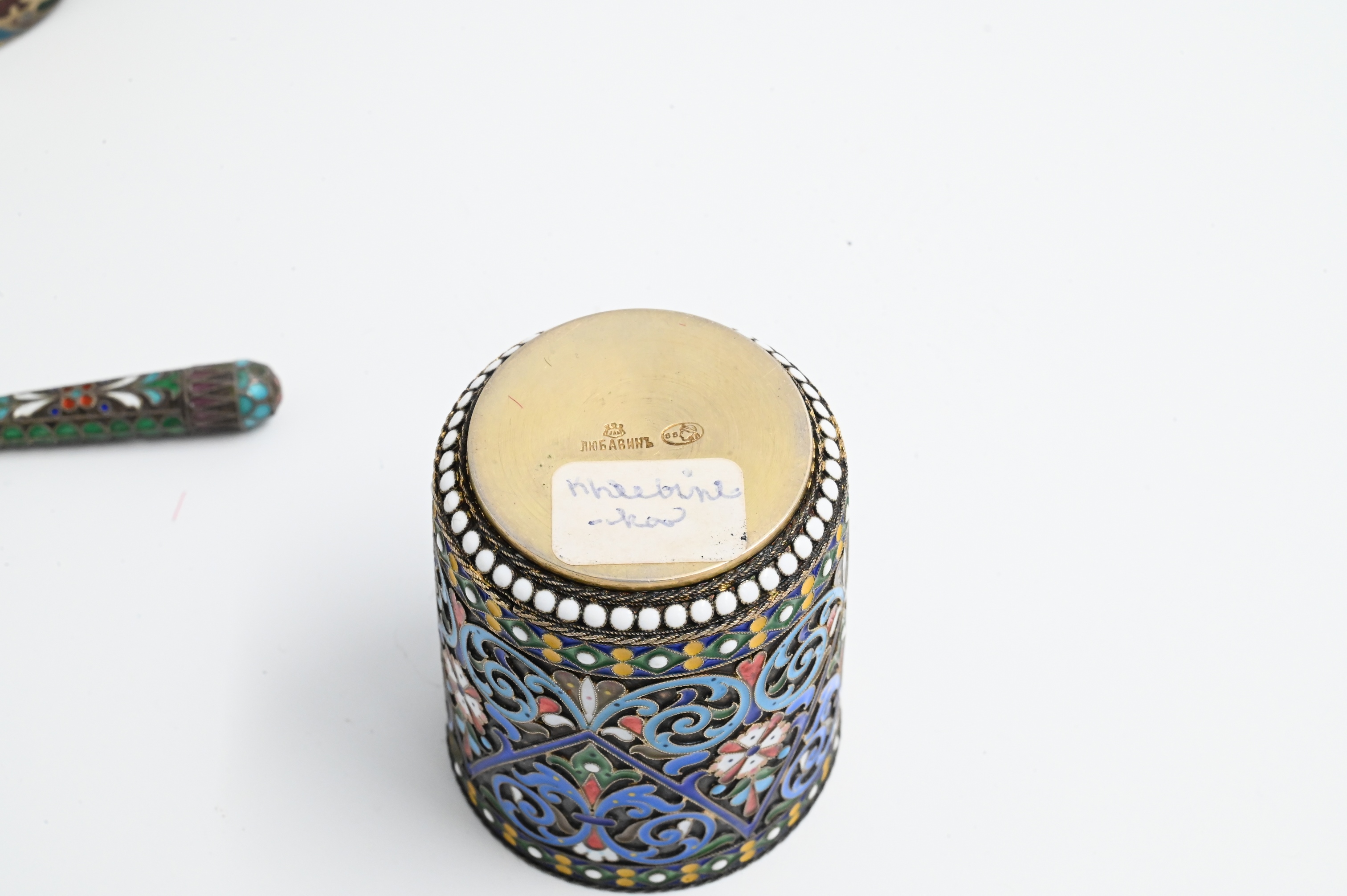 to include sugar shovel having gold wash length 4 3/4 inches, tea glass holder, and vodka cup (shot glass) marked 88, having makers hallmark height 2 inches