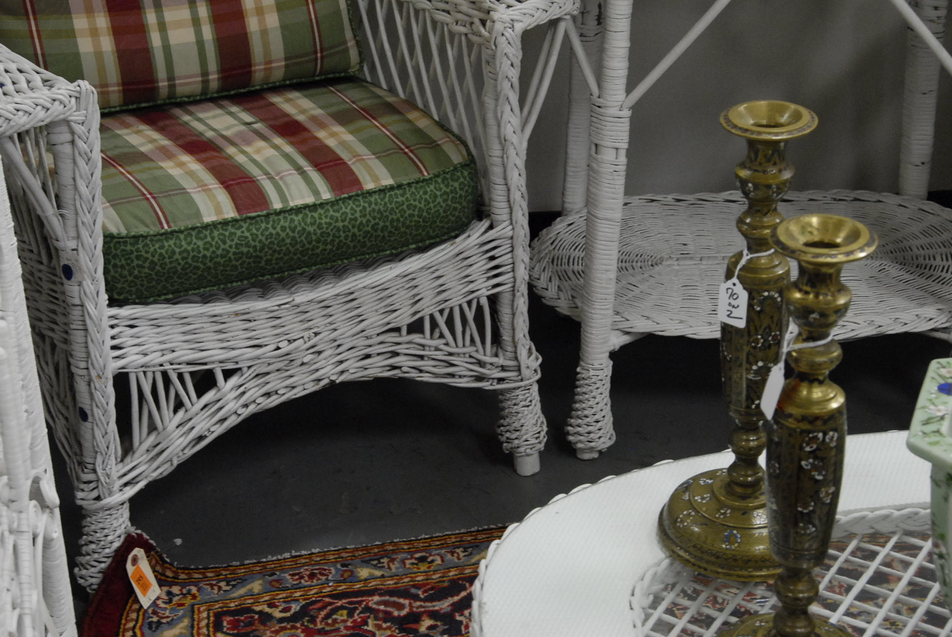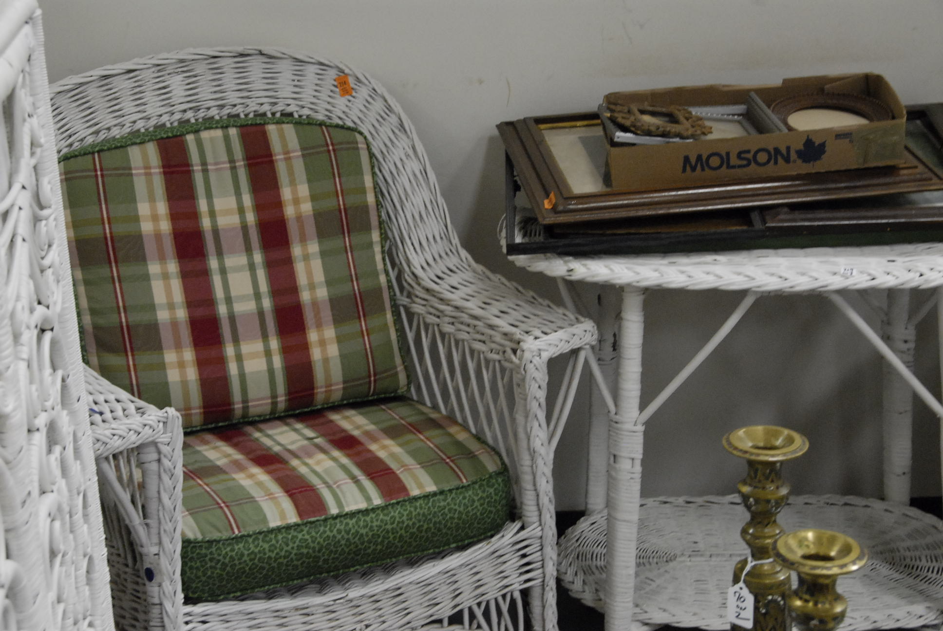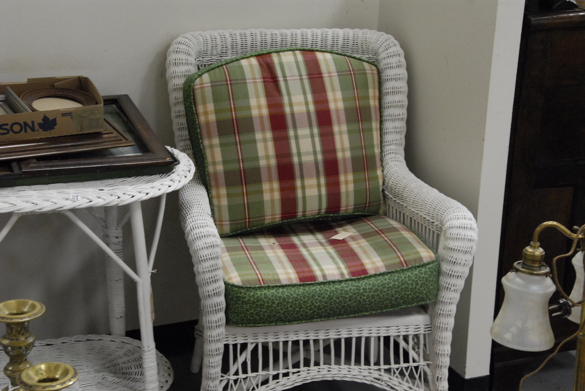Two wicker armchairs, various patterns plus a wicker oval table