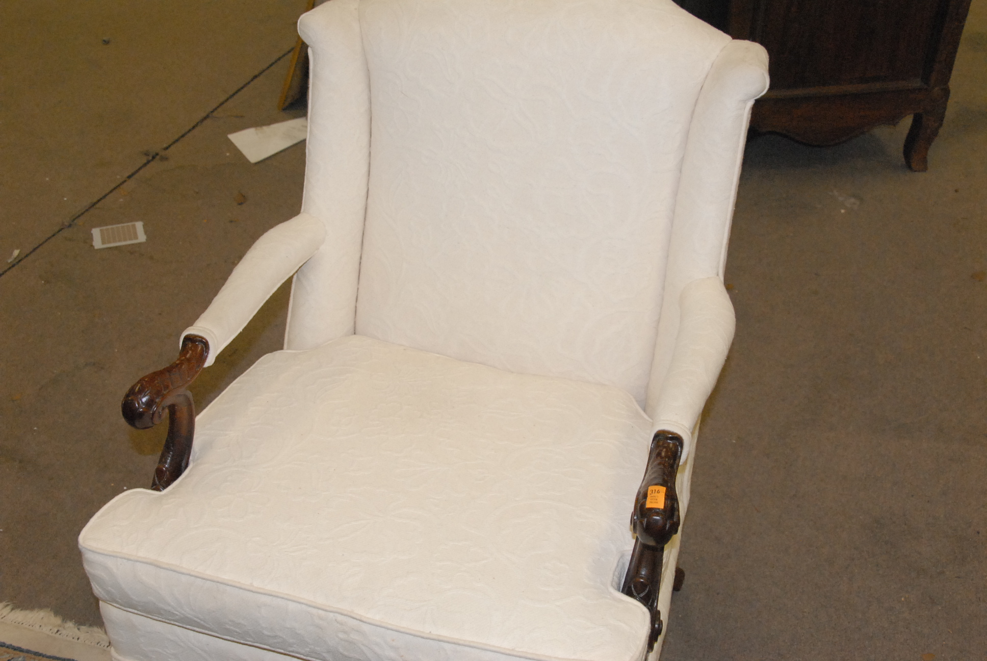 Upholstered armchair with cabriole legs and exposed arms with clean upholstery