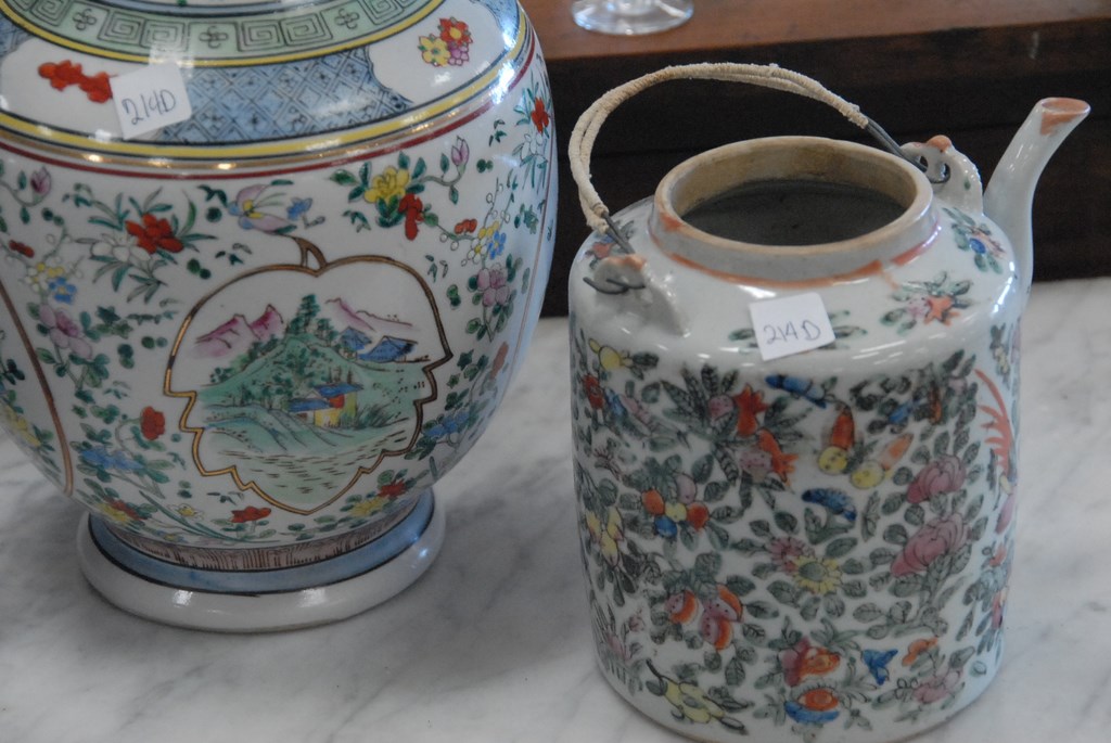 Lot 214D: Group of three Oriental porcelain pieces: vase, teapot, and planter.