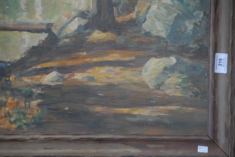 Lot 215: Alex Poplaski 1906-1988 oil on board fall woods with stream signed lower right A. Poplaski, 21 x 26.