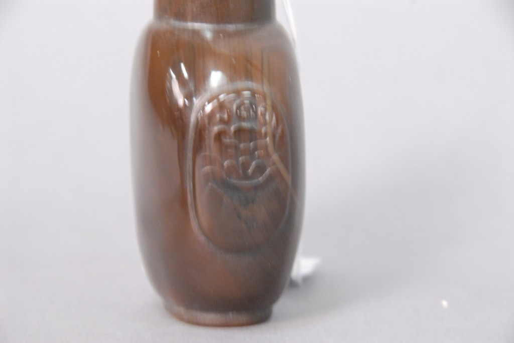Lot 215: Brown agate floater master snuff bottle, having carved foo dog head sides, and conforming agate top, ht 3 .