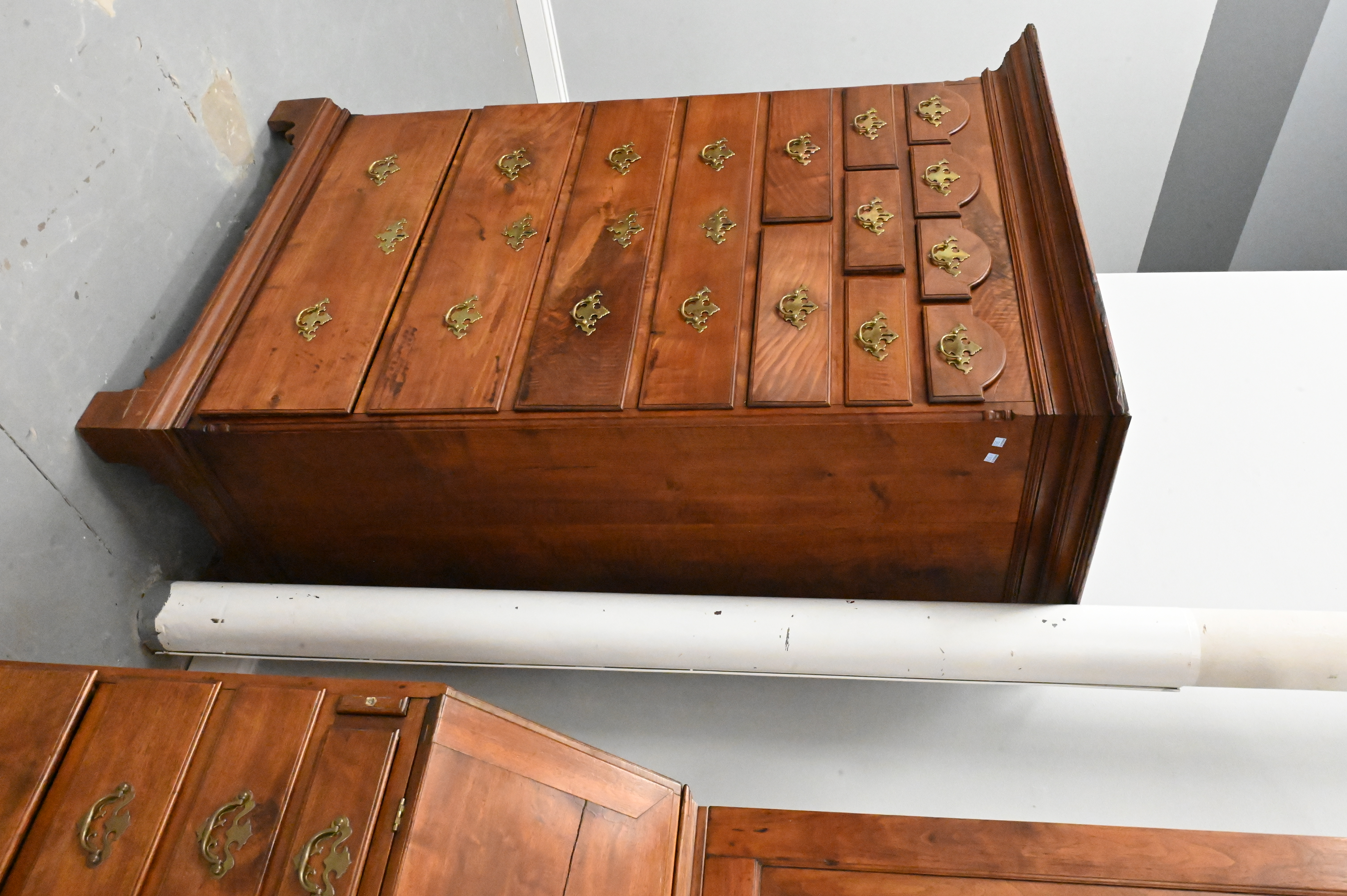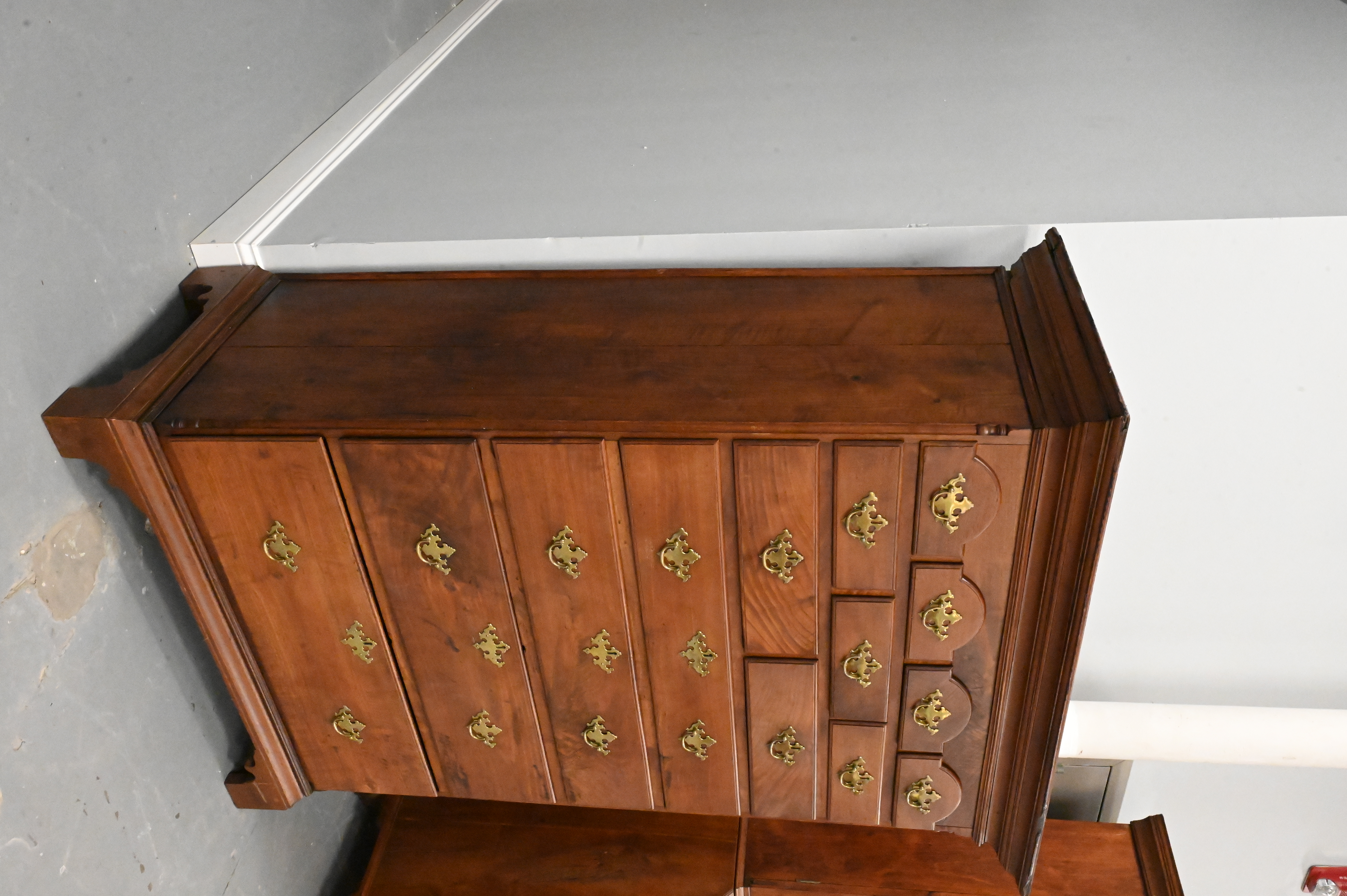 having large cornice molding above case fitted with four arched top drawers over three short drawers over two drawers over four drawers flanked by turned 1 /4 columns, all in figured walnut set on replaced bracket base, 18th century, chips to cornice, molding, brasses not original