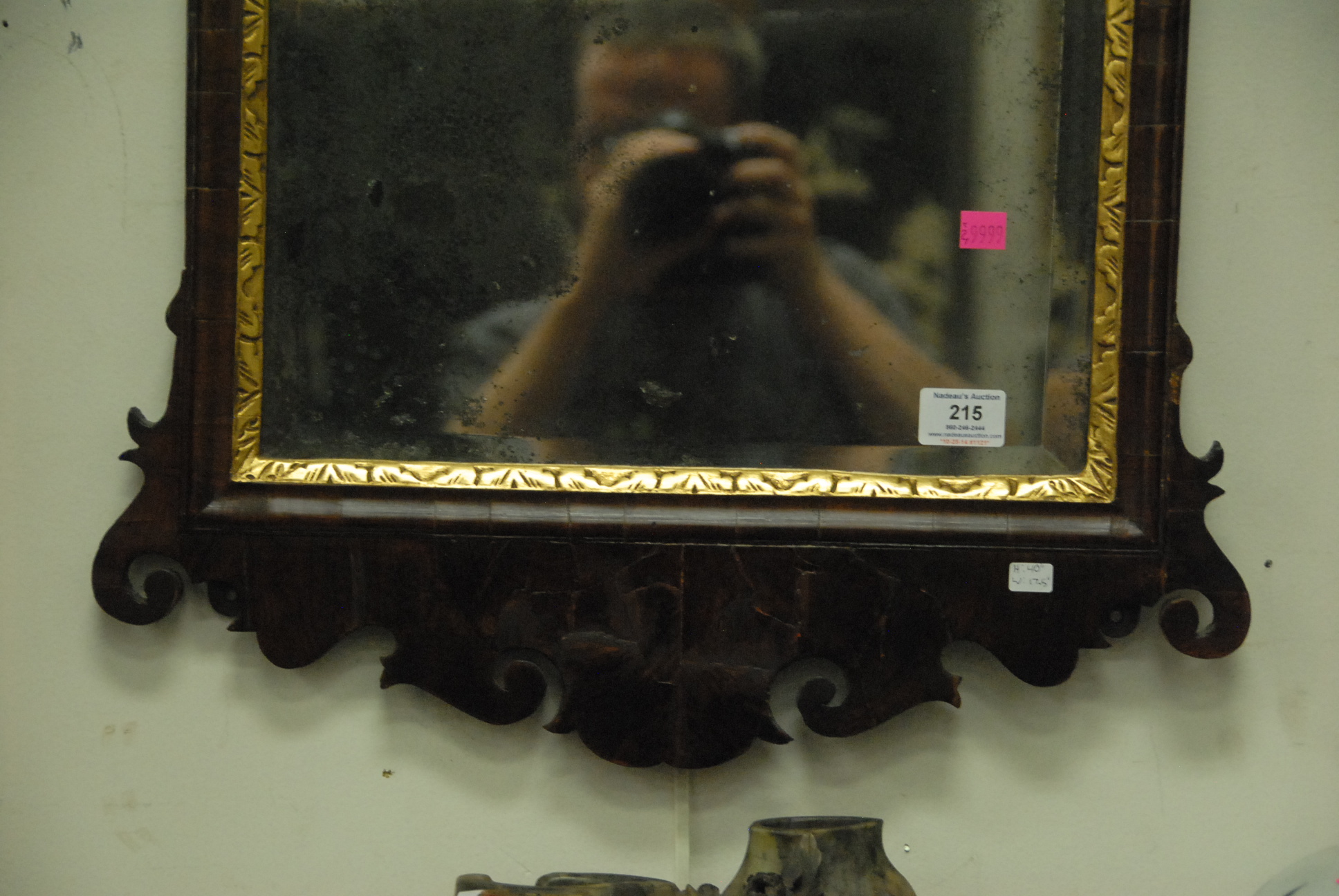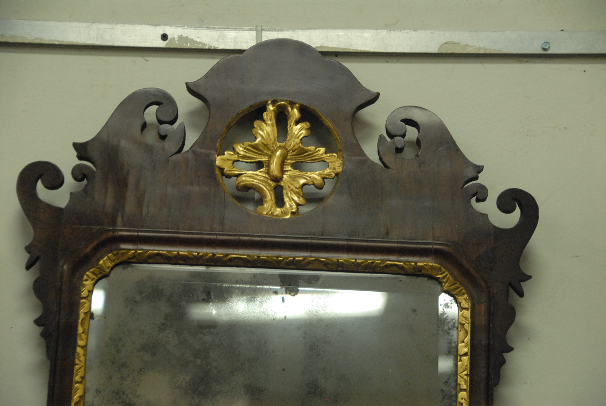 Lot 215: Chippendale mahogany mirror with gilt pierced top and beveled glass. ht. 40 in. wd. 17 1/2 in.