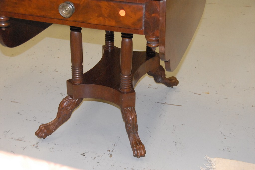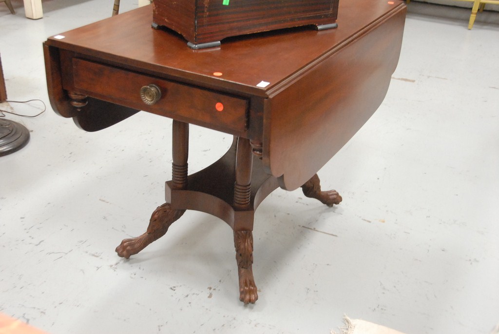 Lot 215: Federal mahogany drop leaf breakfast table with drawer set on carved legs and paw feet, circa 1830-40, ht. 30.