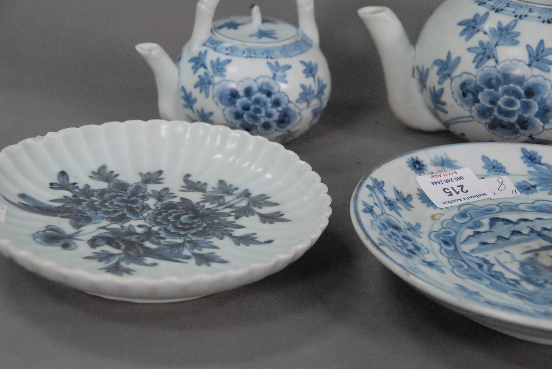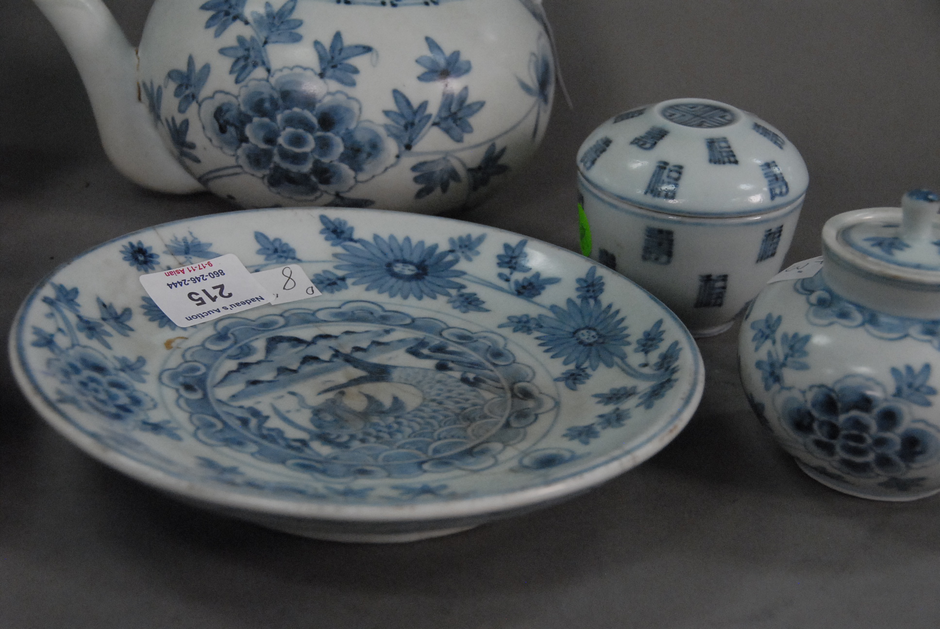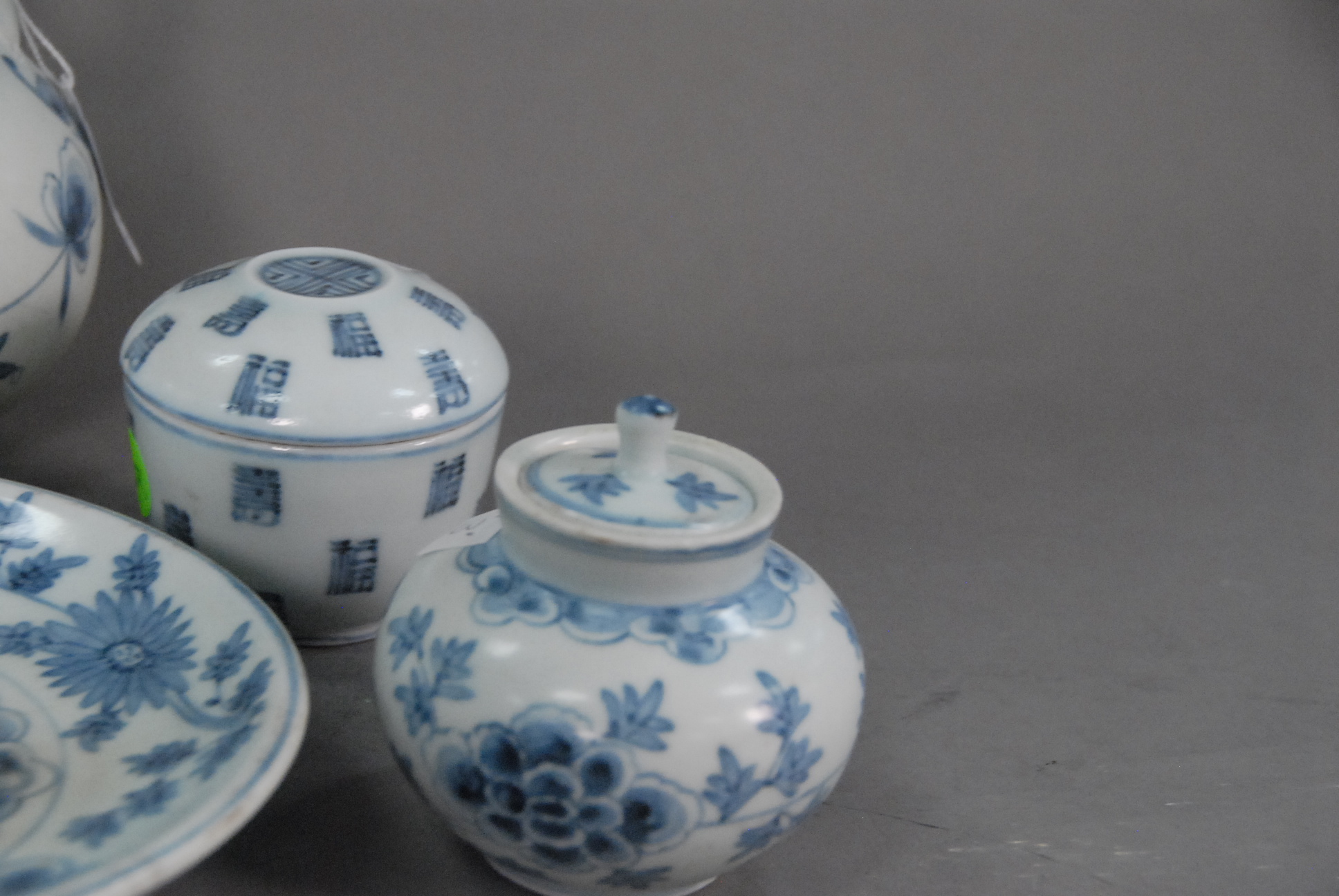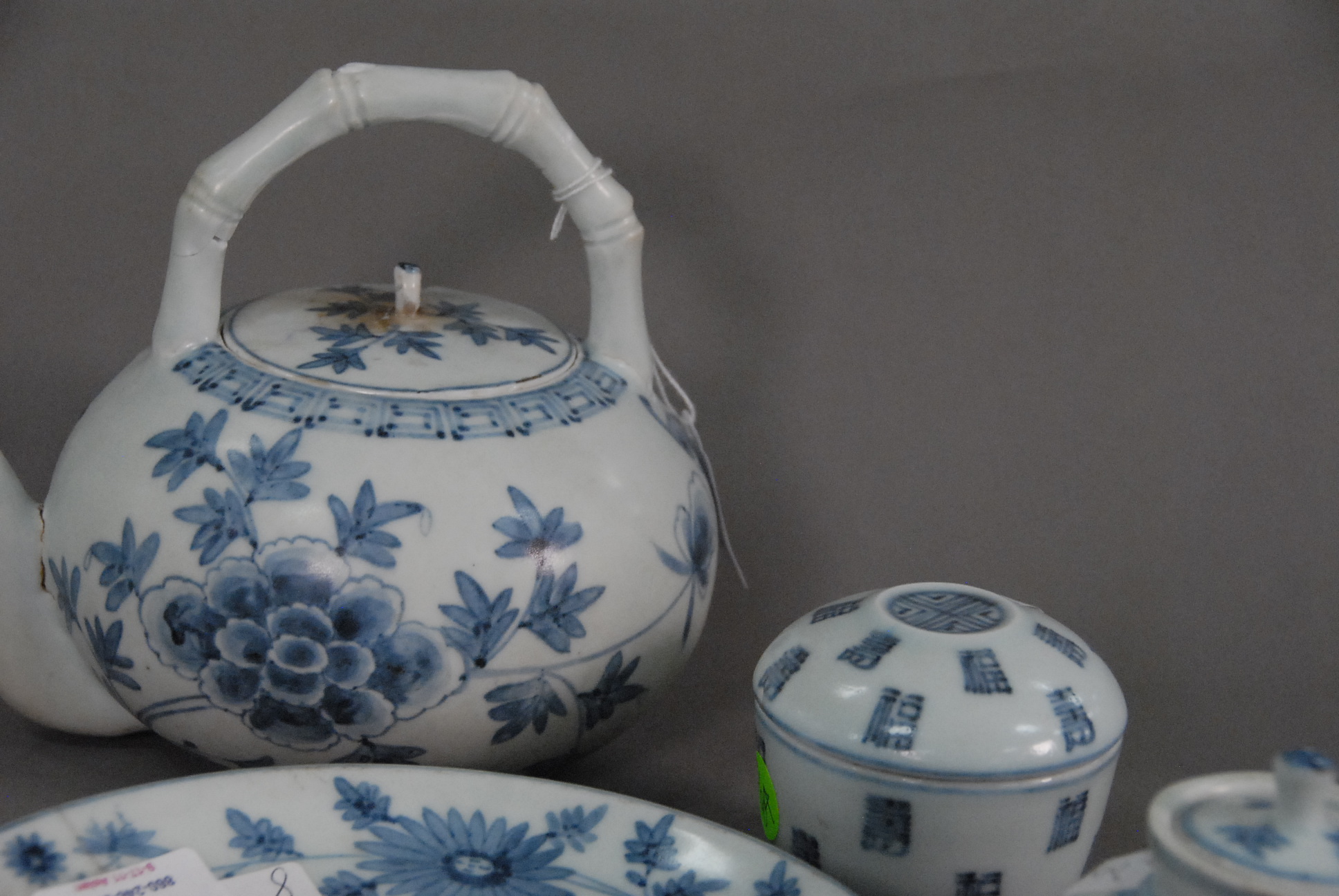 Group lot of six blue and white pieces to include small teapot, two covered jars, two plates, and a teapot with bamboo molded handle as is.
