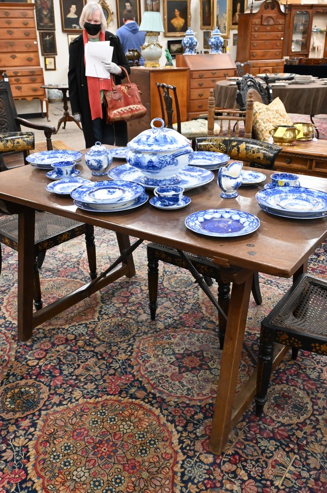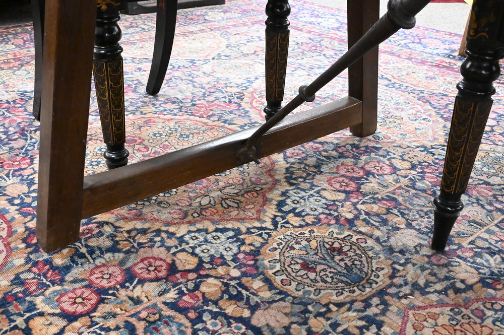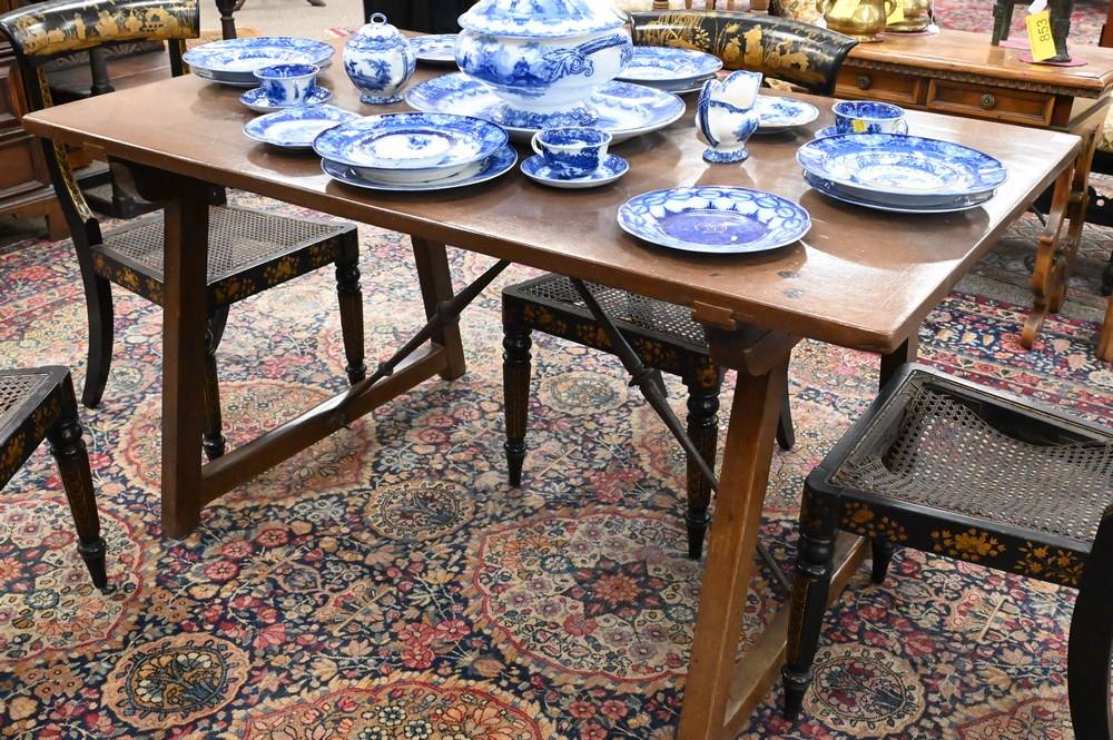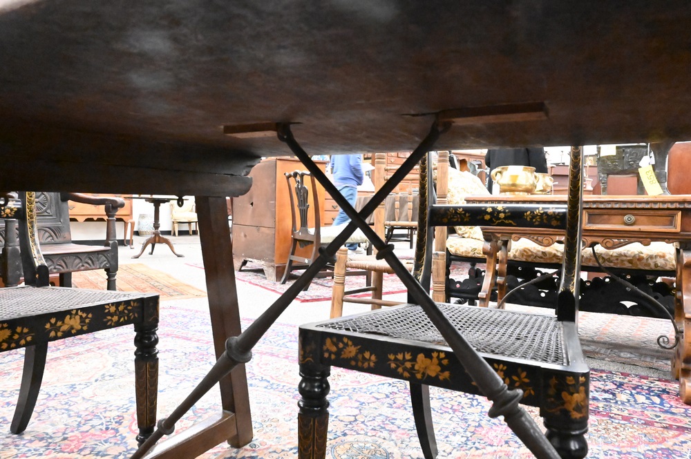 Lot 215: Italian Baroque Walnut Slab Top Table, on plain base, having wrought iron stretcher, height 29 inches, top 34 1/2″ x 57″.