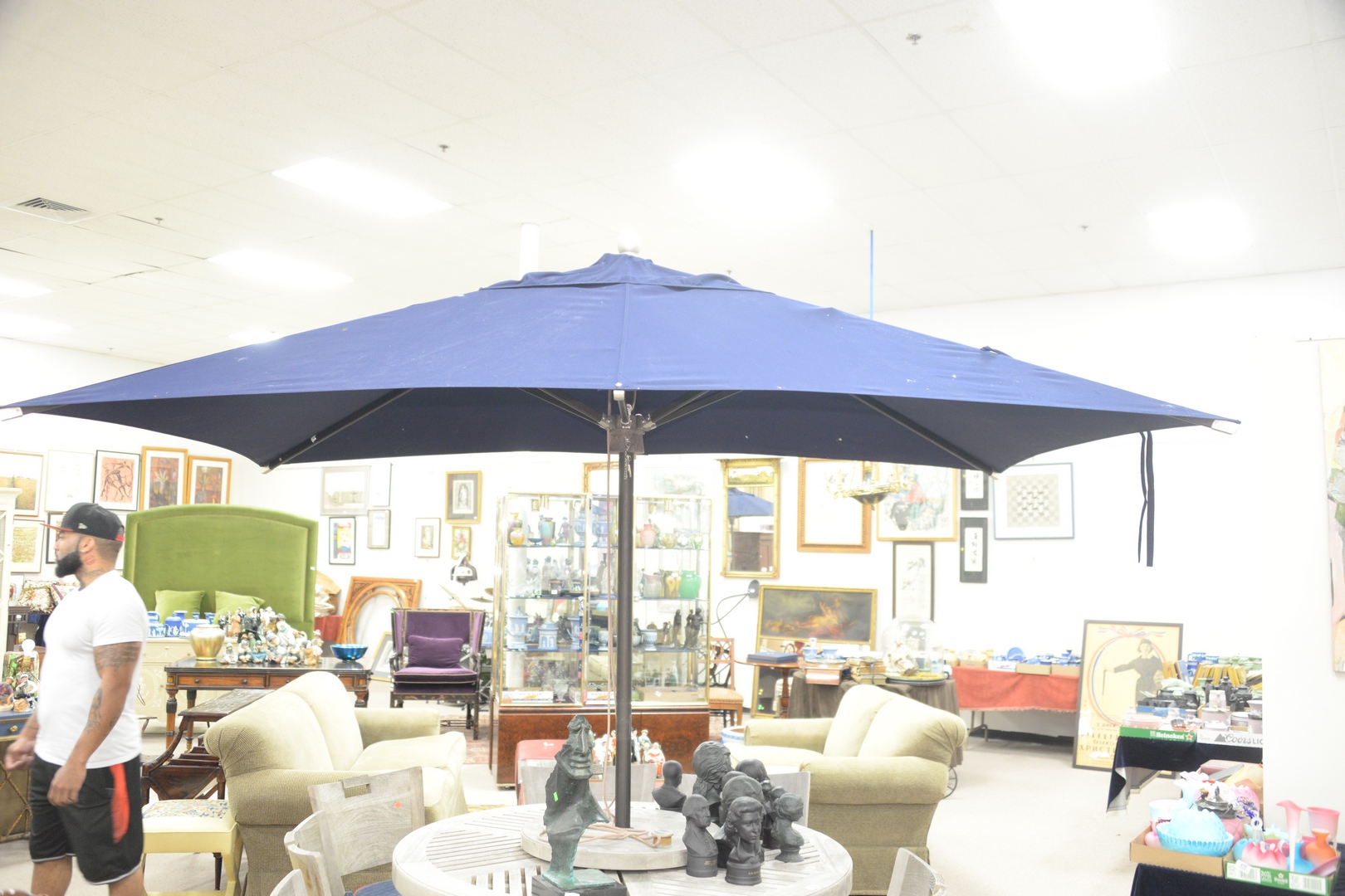 Lot 215: Large Rectangle Umbrella with Stand, navy blue fabric possibly Sunbrella, 70″ x 120″. Provenance: David and Cynthia Kim, 22 Stoney Wylde Lane, Greenwich, Connecticut. View home by visiting: https://www.zillow.com/homedetails/22-Stoney-Wylde-Ln-Greenwich-CT-06830/177238281_zpid/