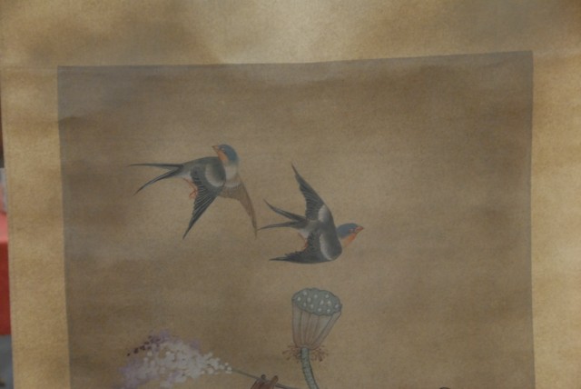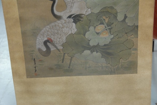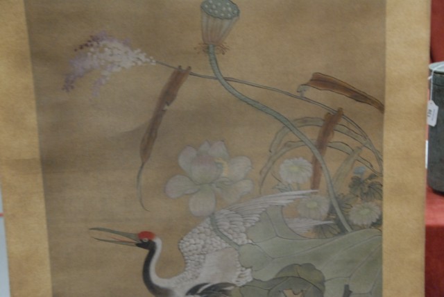 Oriental scroll w/c on silk of 2 cranes in a landscape scene.