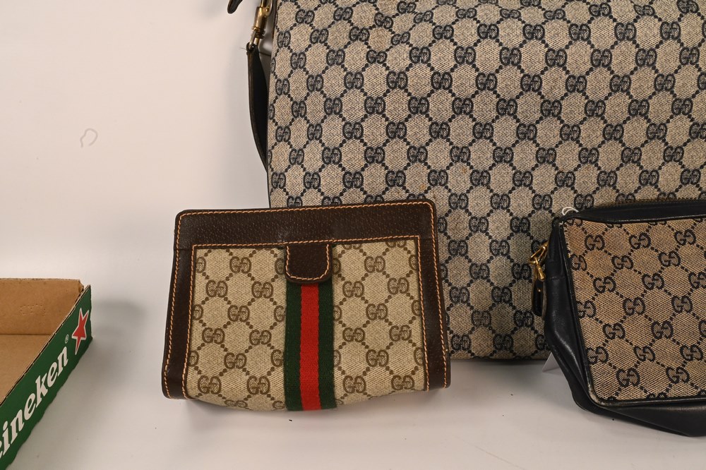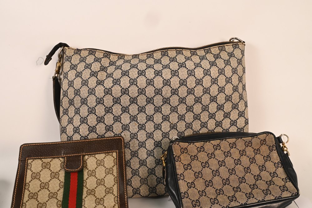 Lot 215: Three Piece Group, to include vintage Gucci logo bags and pouch, to include vintage blue satchel with fabric handle, brown pouch wit…