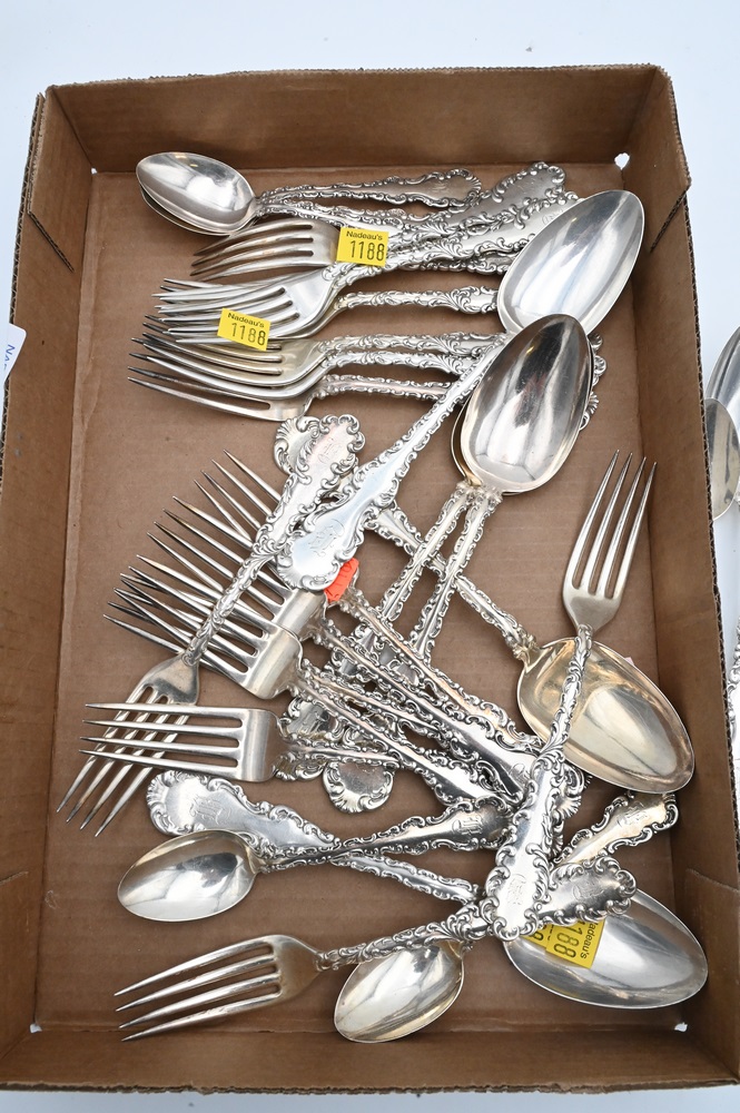 30 Piece Set of Wallace and Towle Sterling Silver Flatware, “Waverly Mono” and “Old Master” patterns, to include 12 dinner forks (Wallace); 6 dinner forks; 6 tablespoons; 6 teaspoons (Towle); longest 8 inches; 44.42 t.oz.