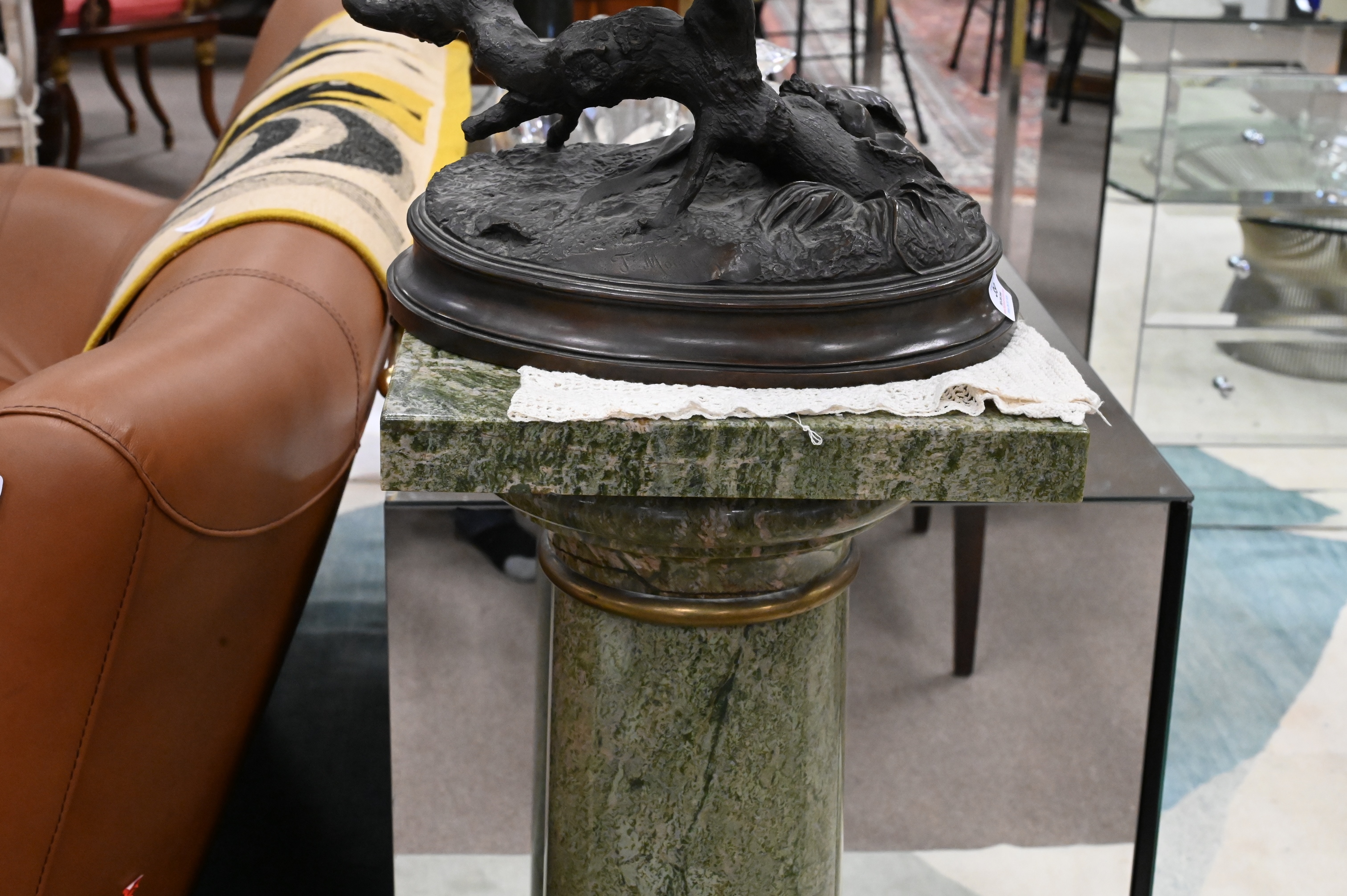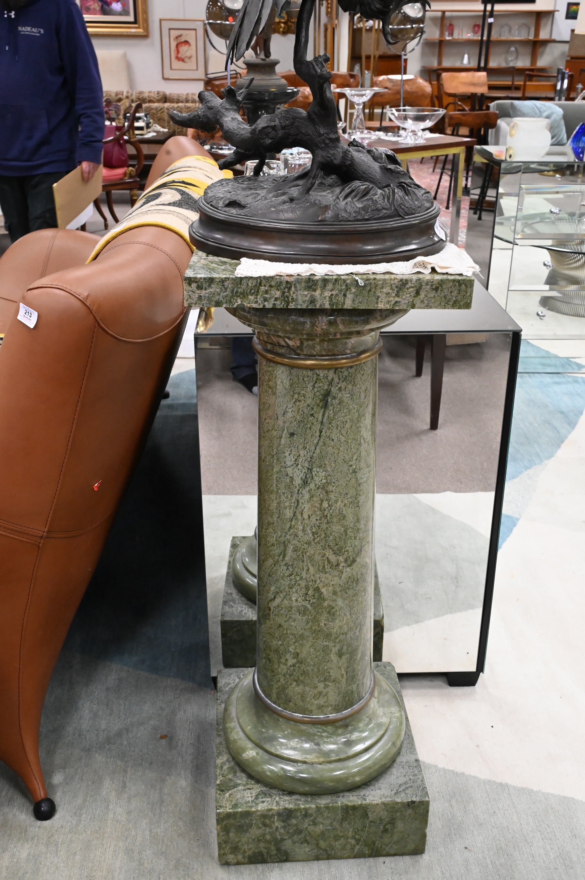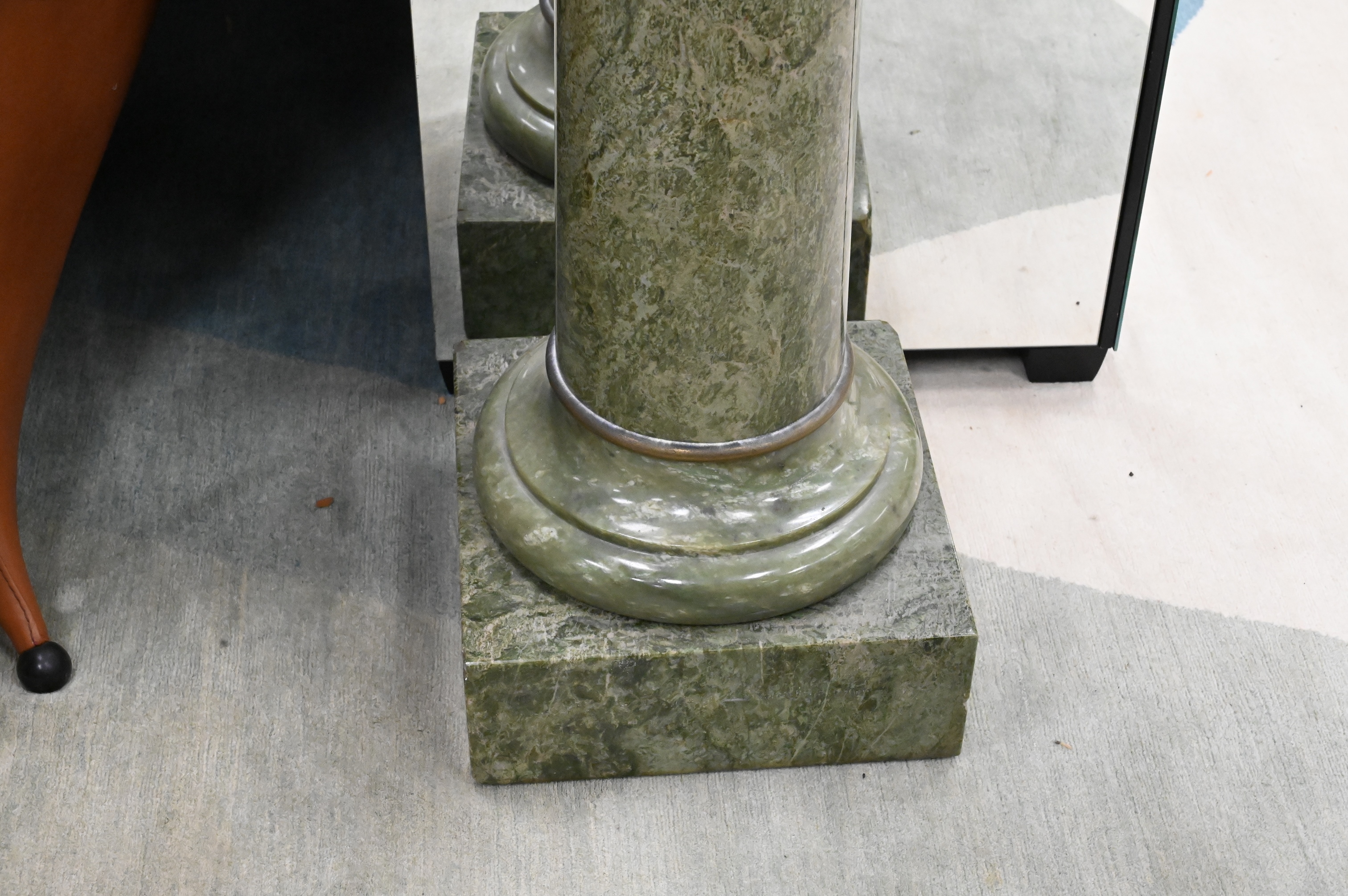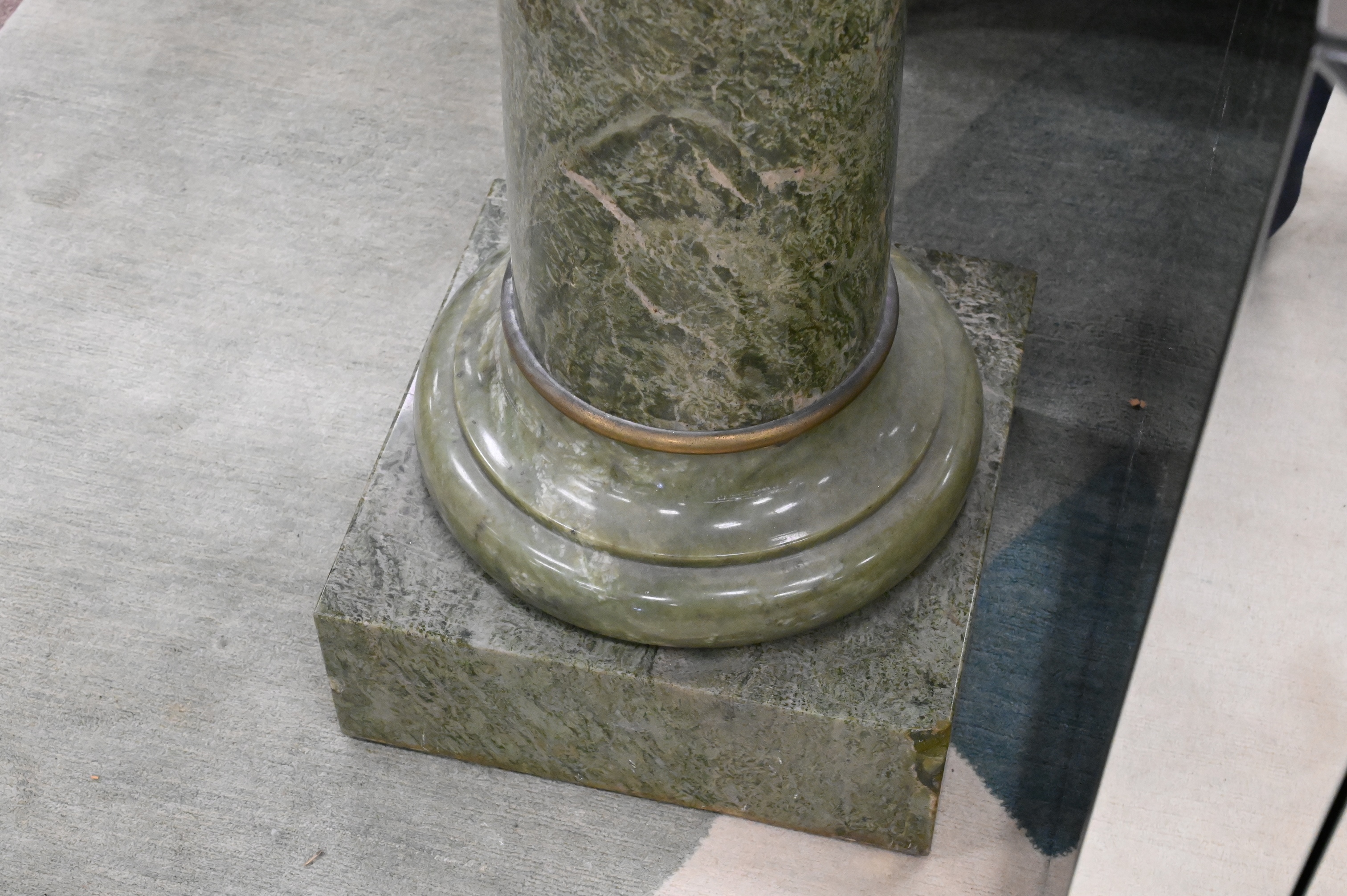 A Green Marble Pedestal, having brass ring trim, one small repair on corner of base, height 40 inches, top 14″ x 14″.